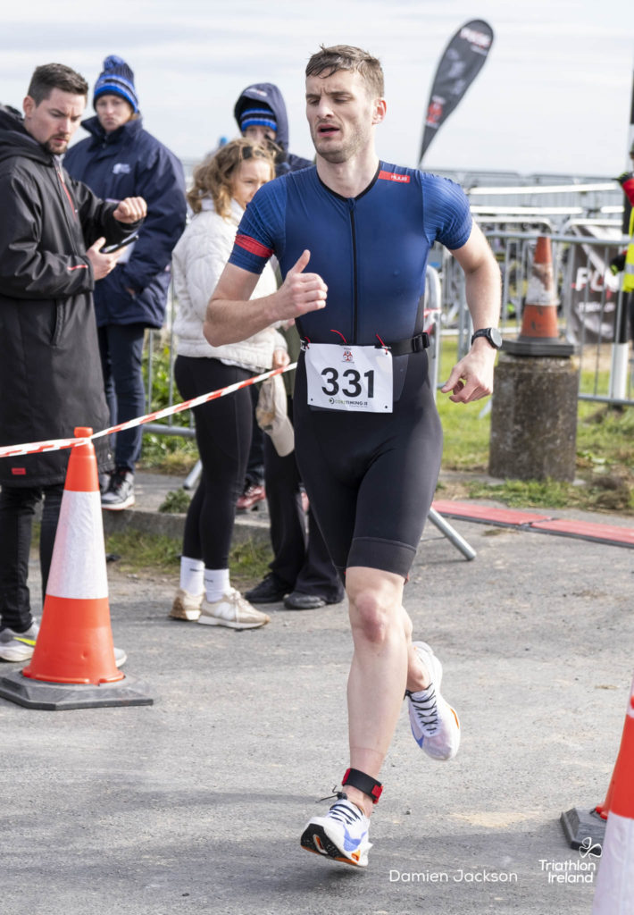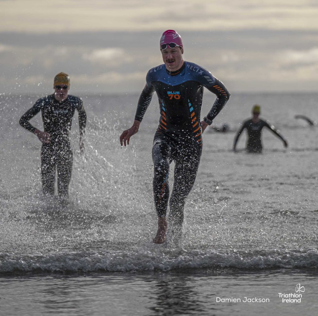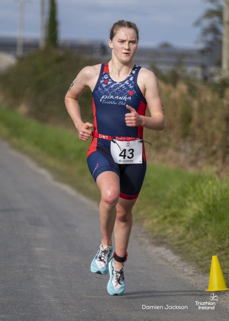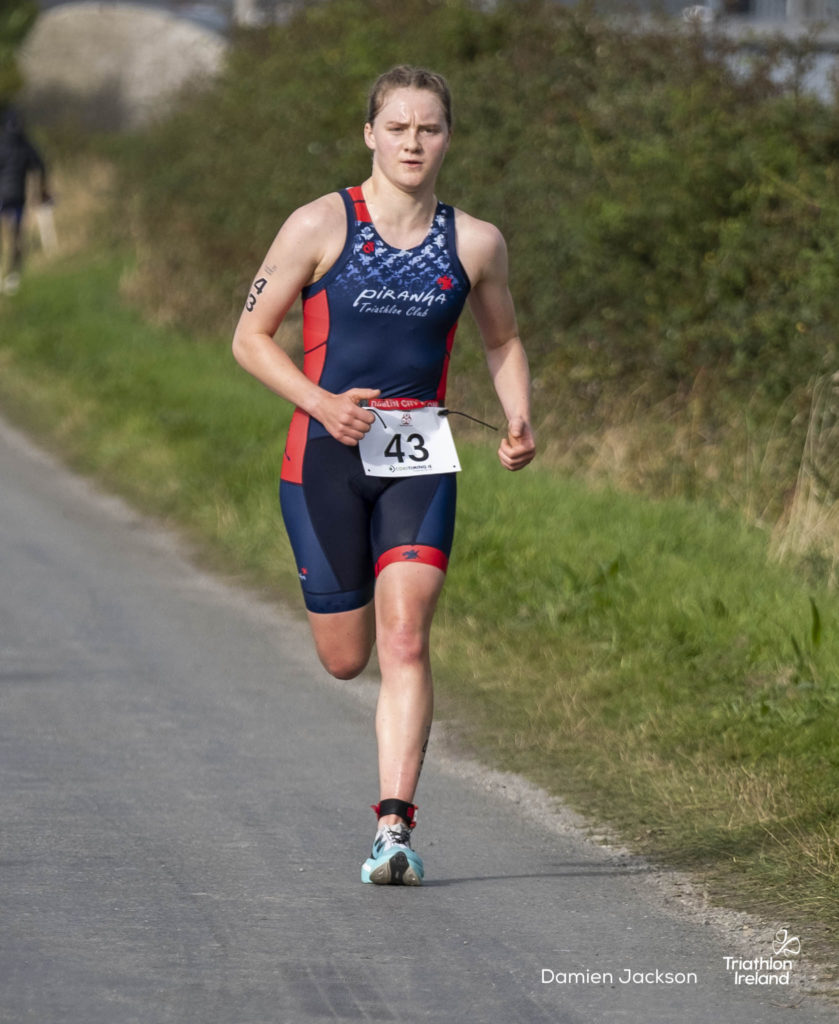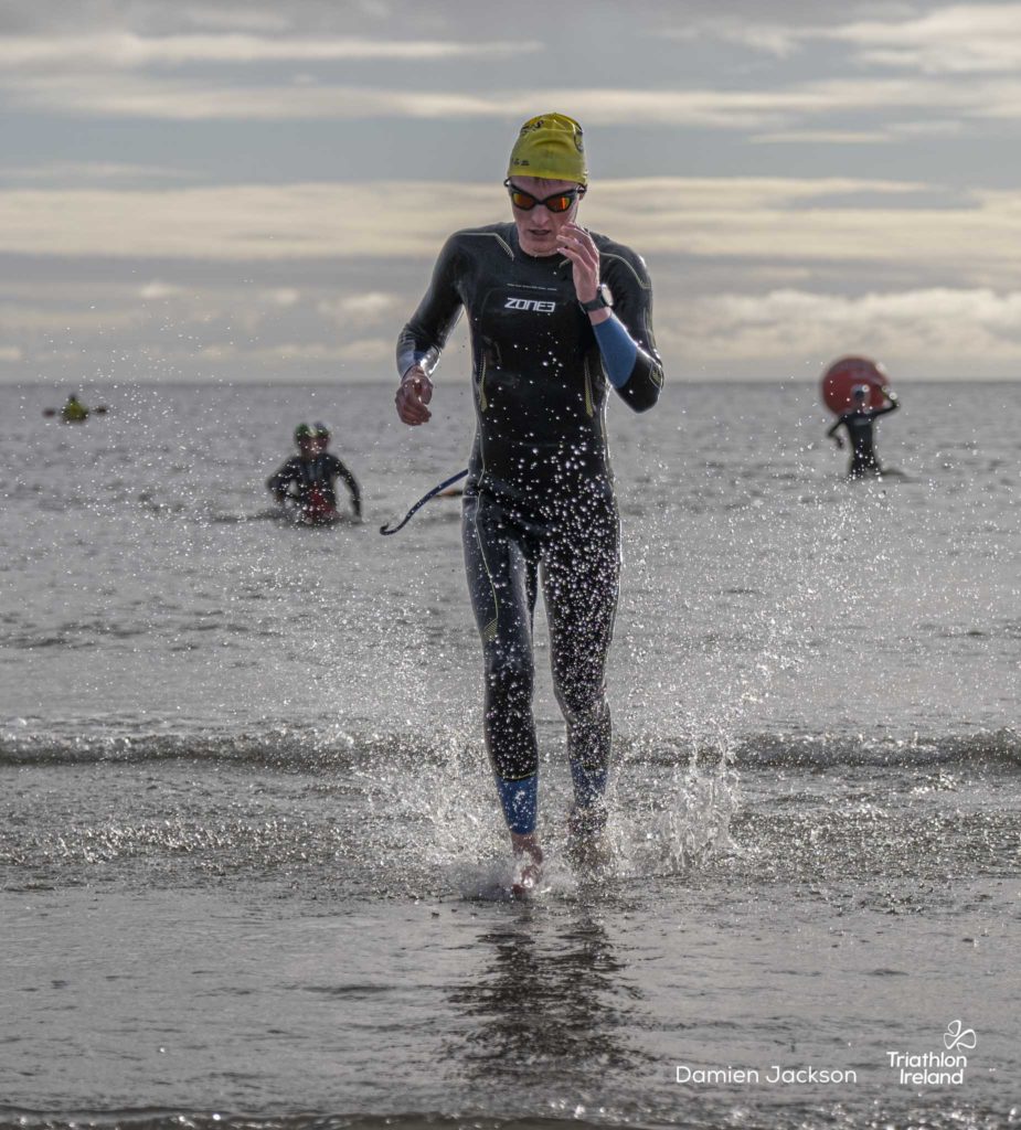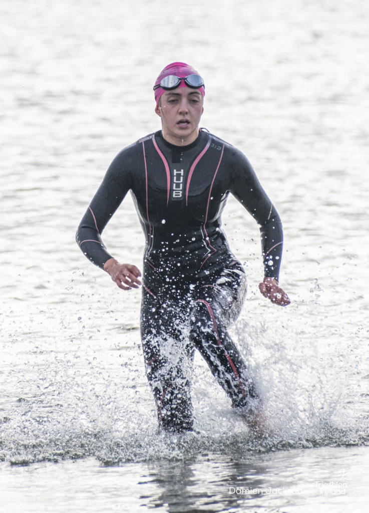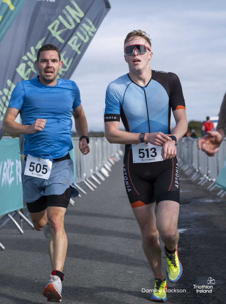 Áine Kinsella of Waterford dominated the women’s race, finishing first with a time of 01:14:16. Kinsella put in a solid swim, completing the 750-metre lap in 00:15:53, and continued her strong performance on the bike, clocking 00:35:59. Her consistent pace across all three legs, coupled with a 00:19:36 run split, secured her the victory.