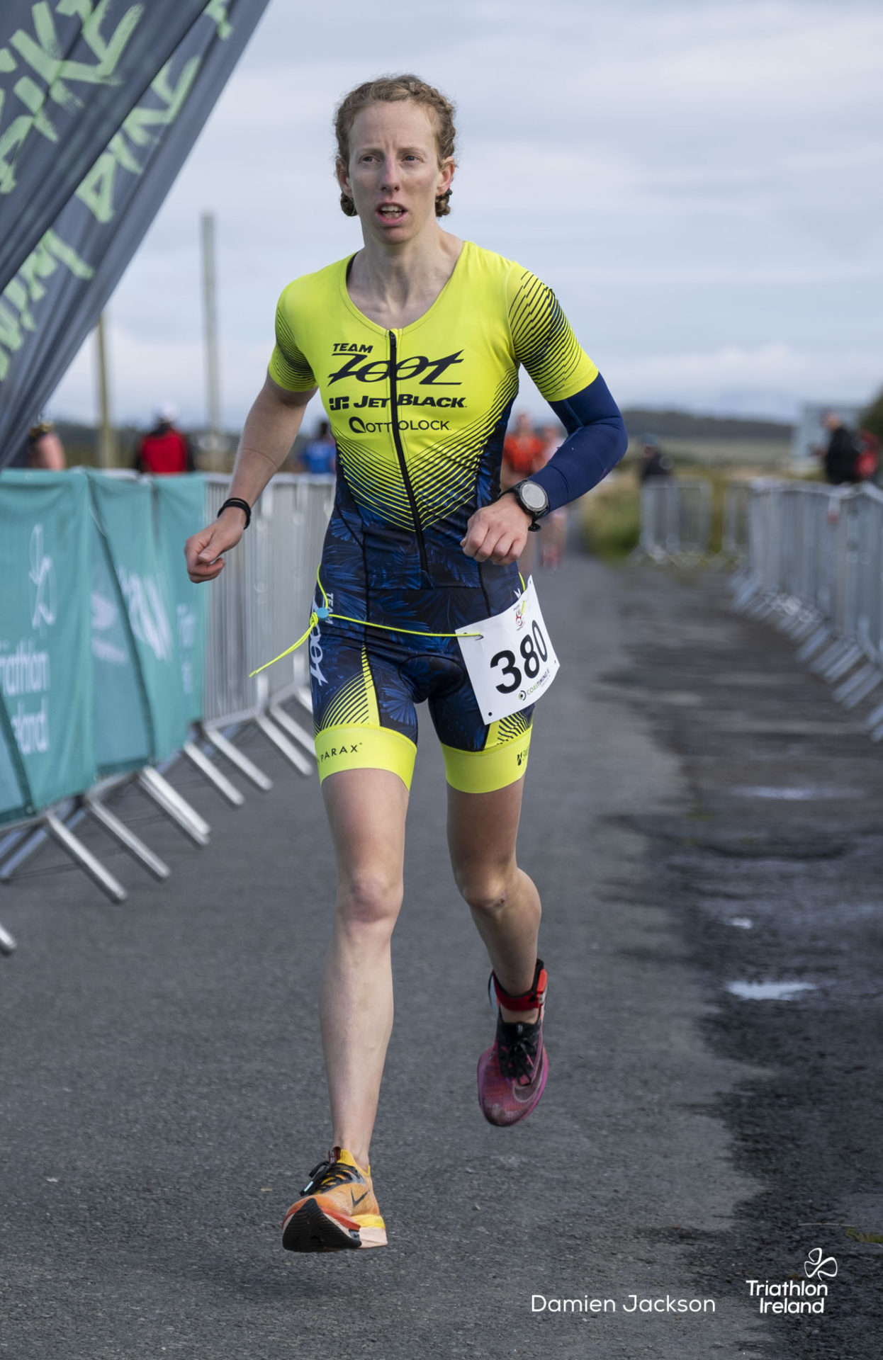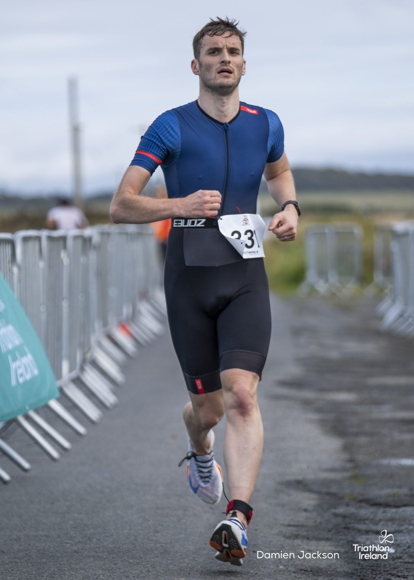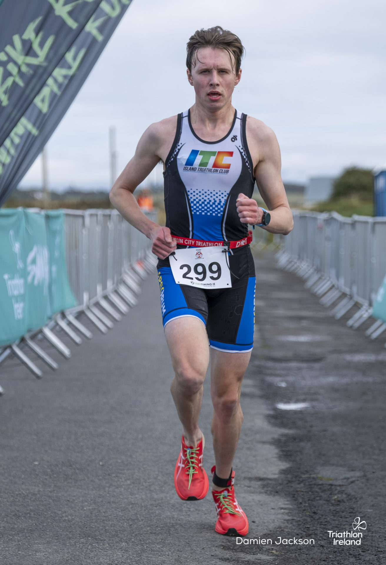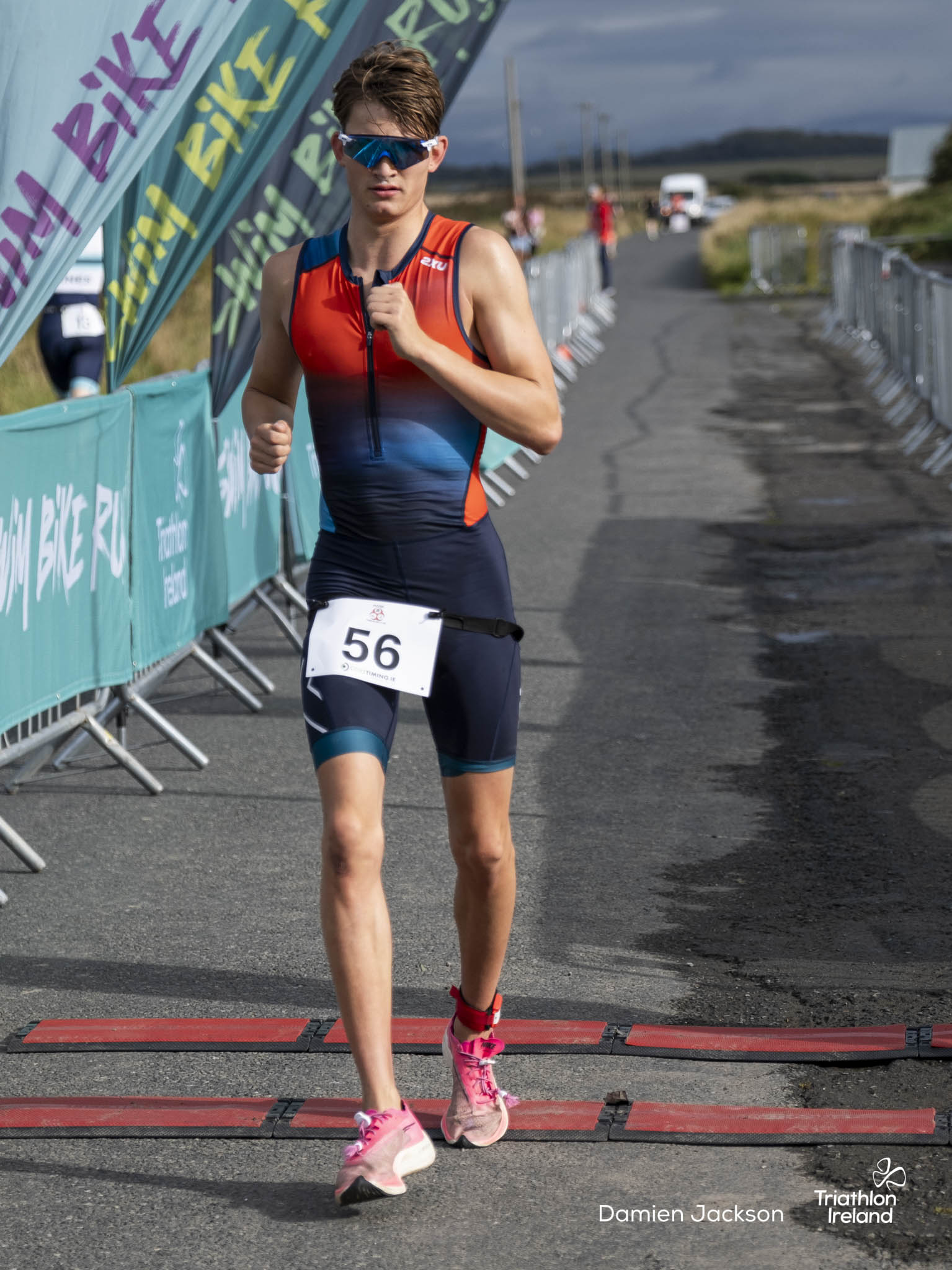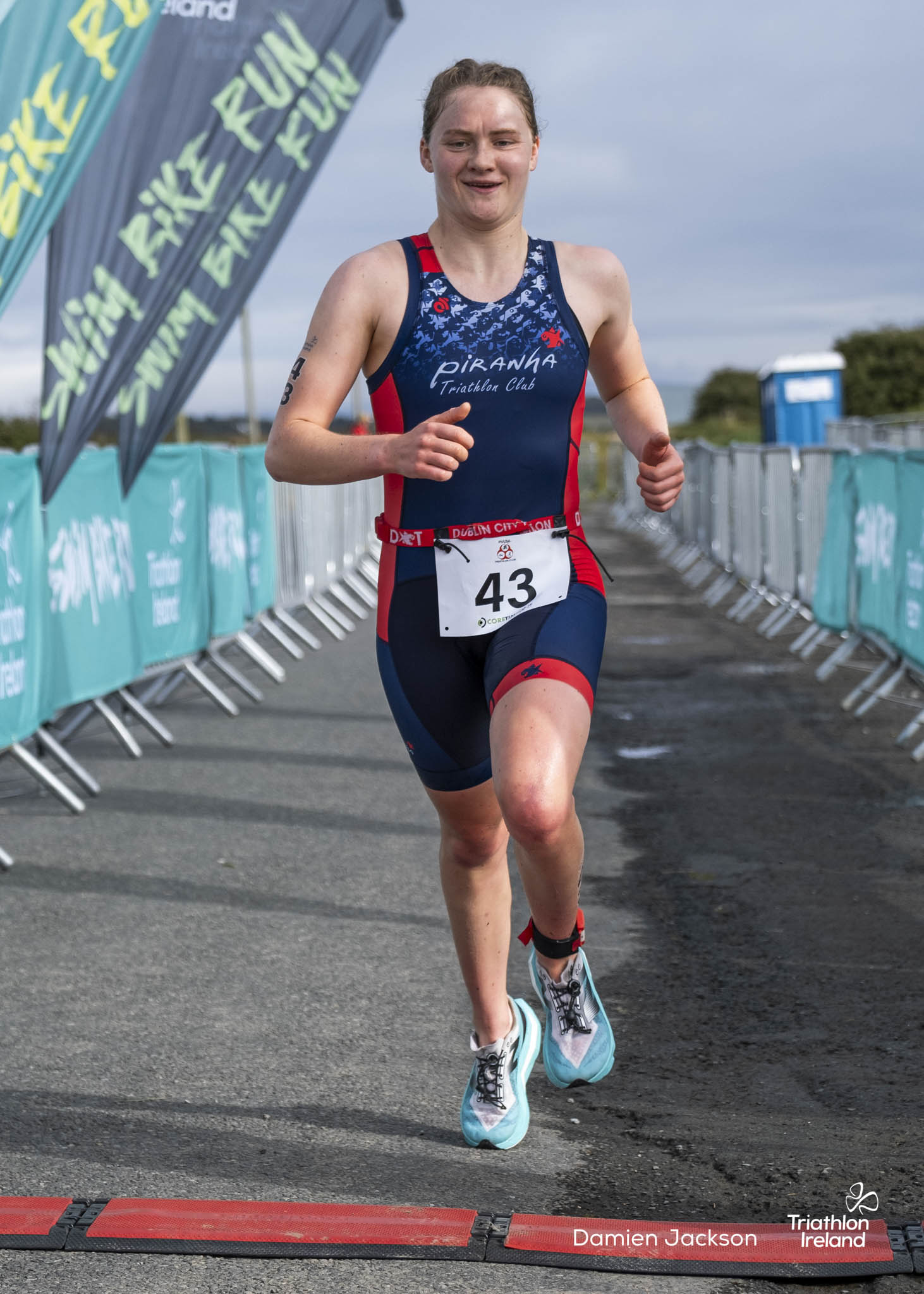 Áine Kinsella of Waterford dominated the women’s race, finishing first with a time of 01:14:16. Kinsella put in a solid swim, completing the 750-metre lap in 00:15:53, and continued her strong performance on the bike, clocking 00:35:59. Her consistent pace across all three legs, coupled with a 00:19:36 run split, secured her the victory.