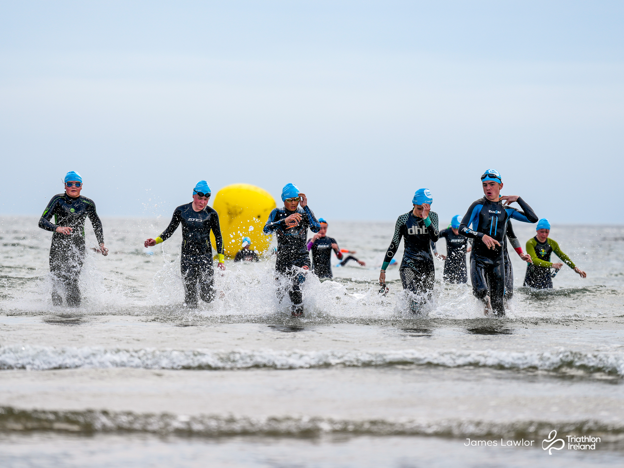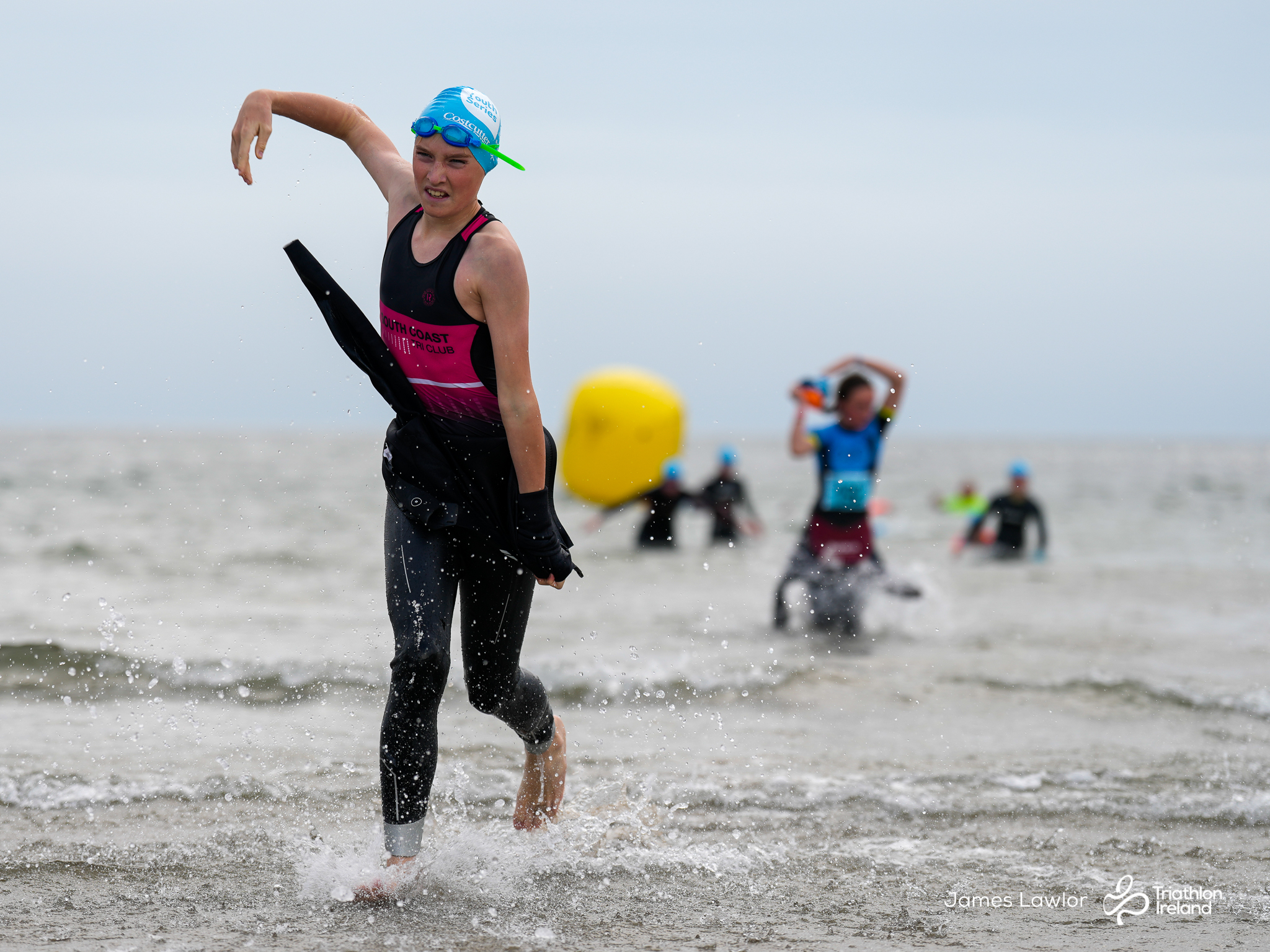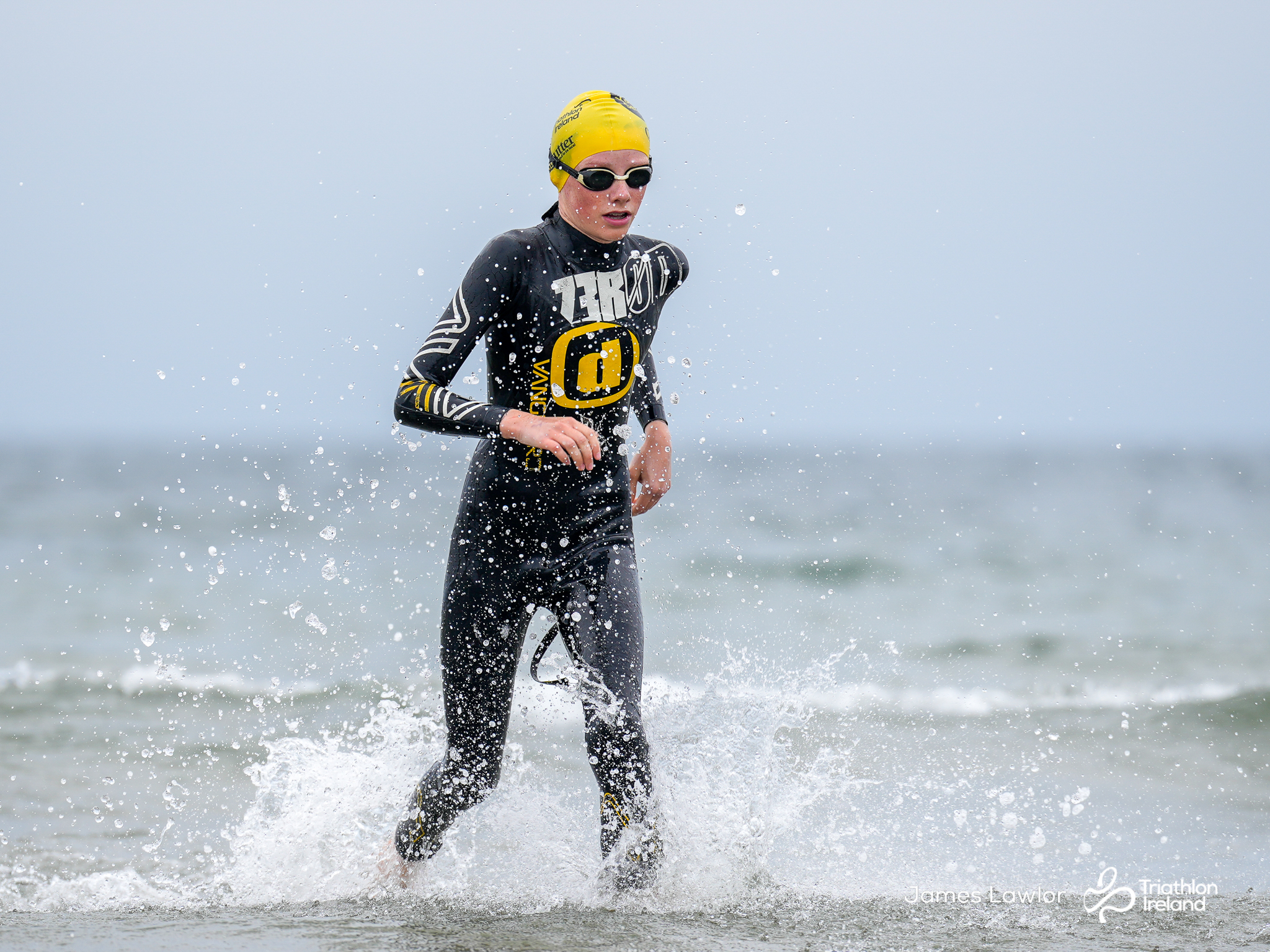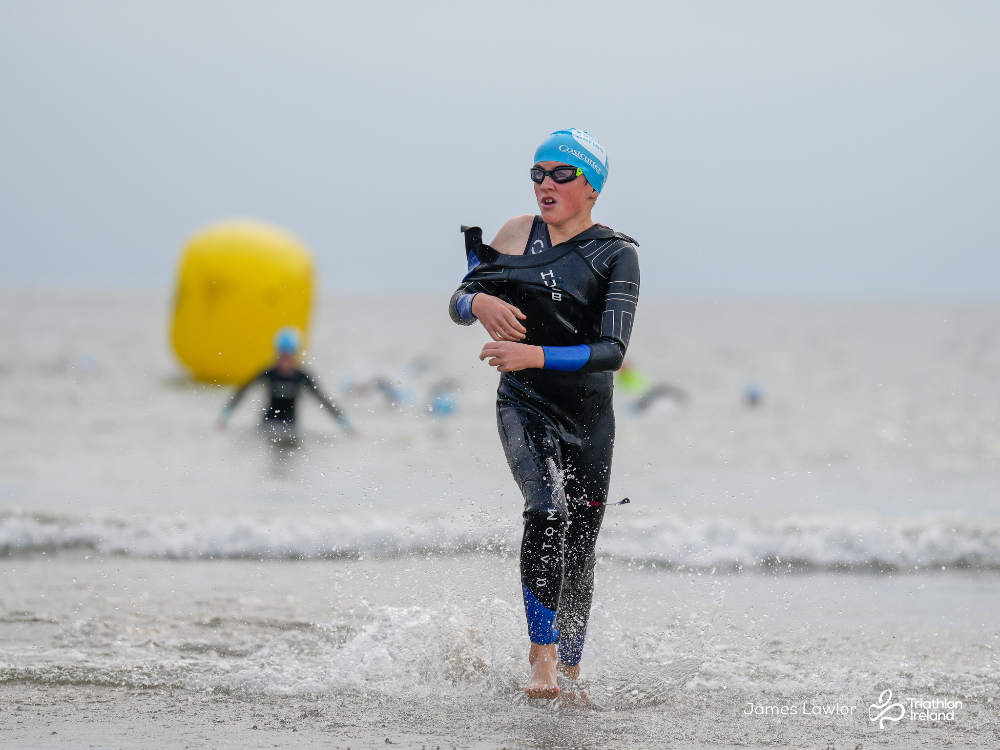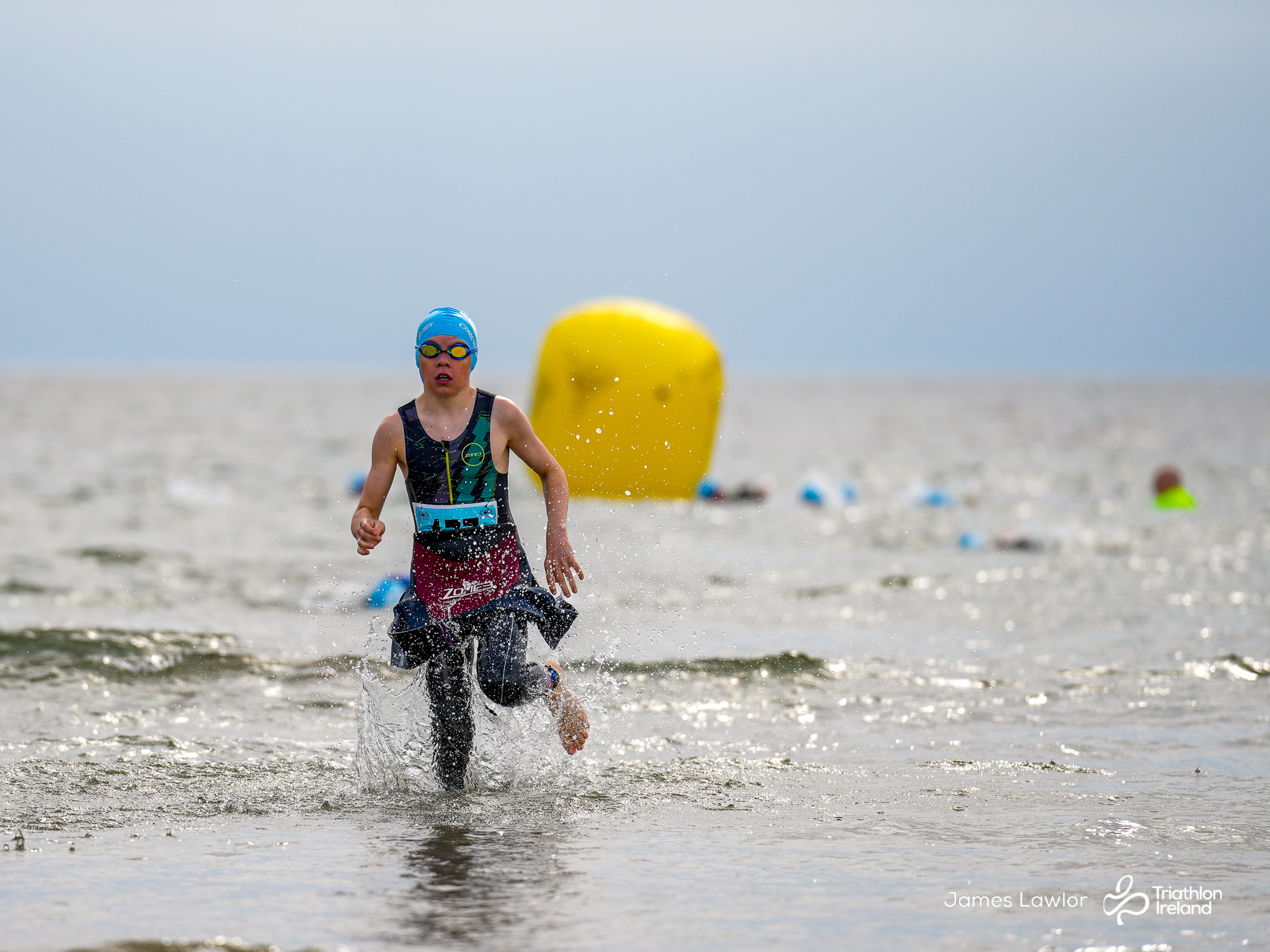Starting with the 12 to 13 age group who had a 300 metre swim, 6.76 kilometre bike, and 1500 metre run to take on. All athletes entered the calm water together, but it was Ryan Byrne Nolan who exited first with the fastest swim split of the day, 5 minutes 22 seconds, followed by Eoghan Looney and Sam Sanders. In the female race, Anna Brett was the first to complete the swim distance in a time of 5 minutes and 48 seconds, just over a minute later Orna Ni Mhuiri followed out in second place and Lucy Cunningham exited in third place.