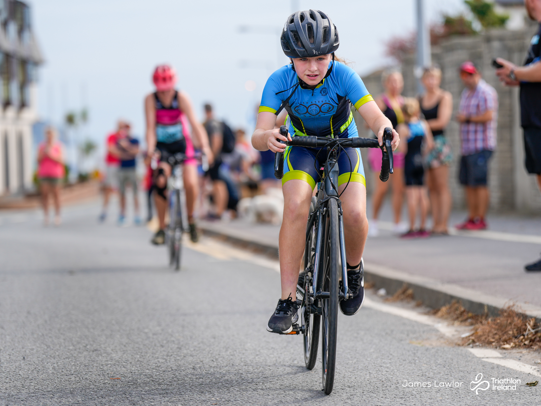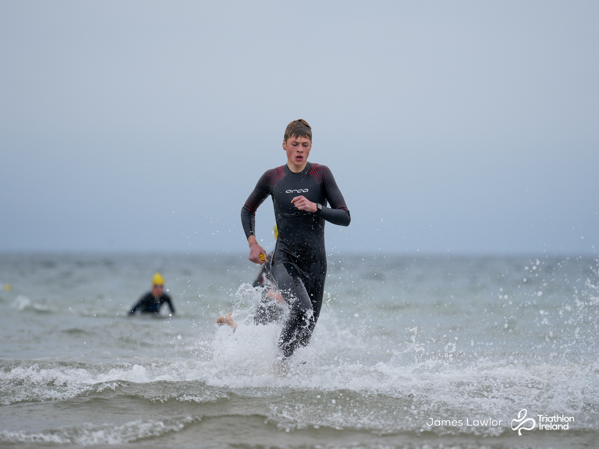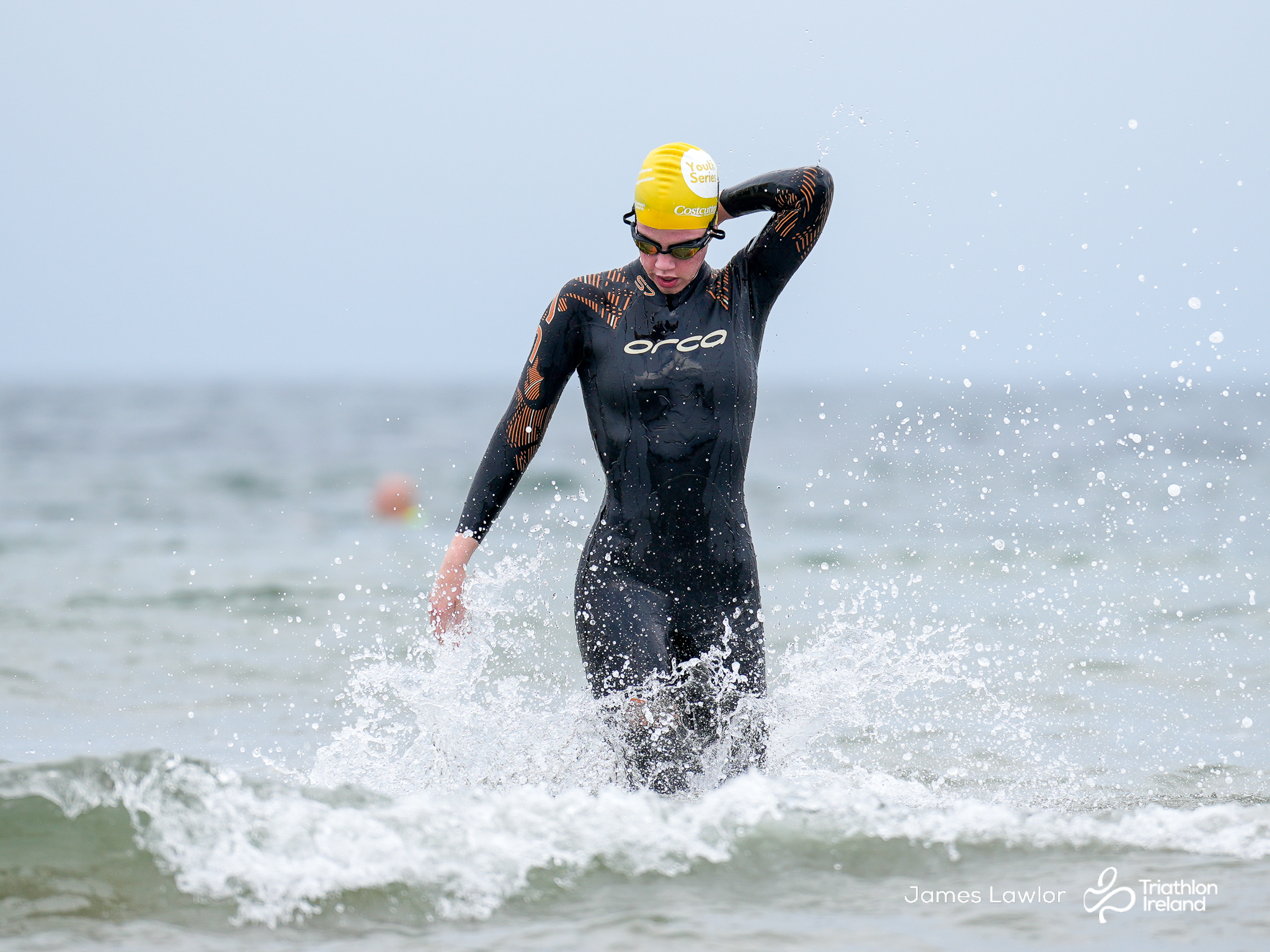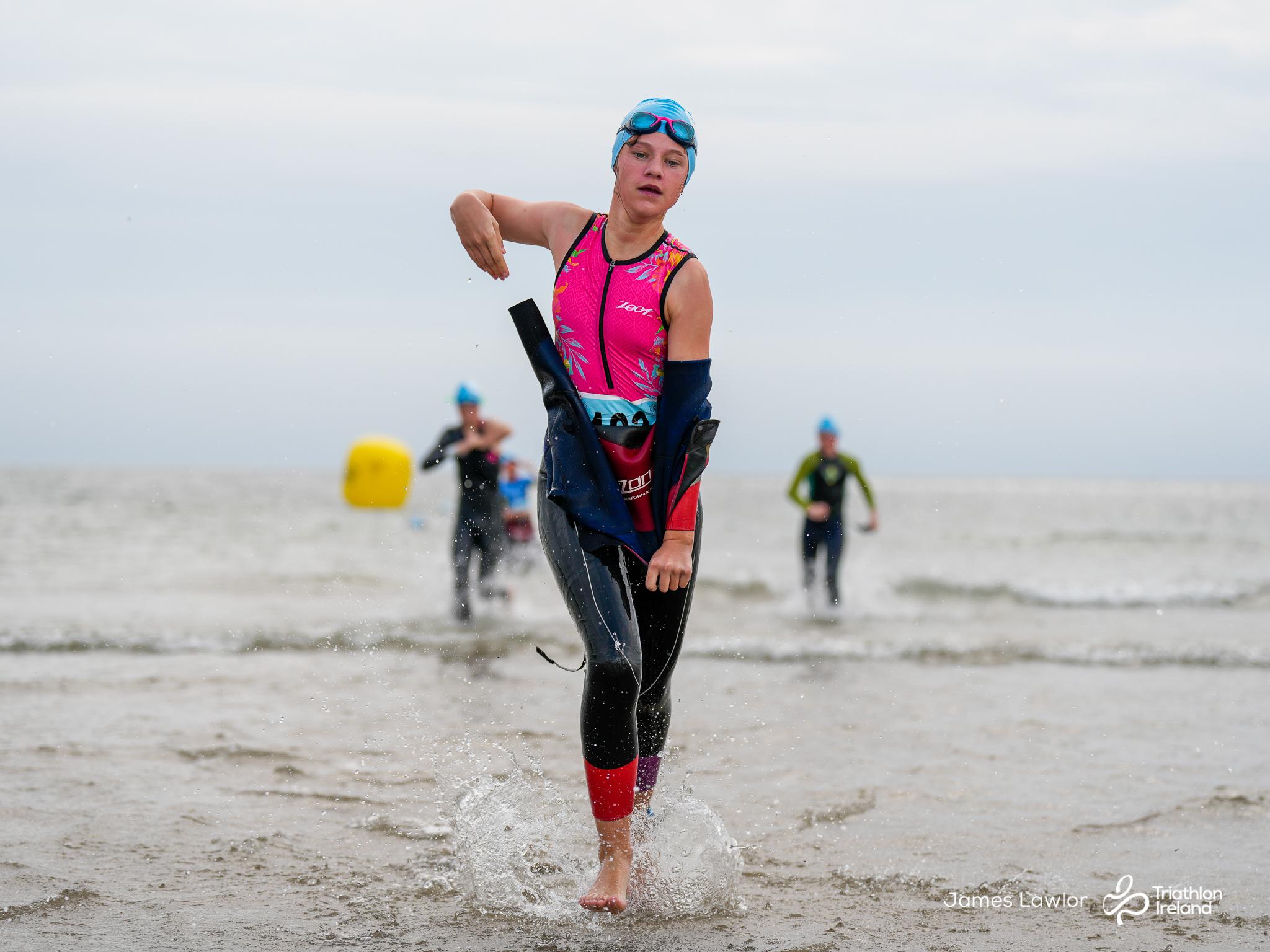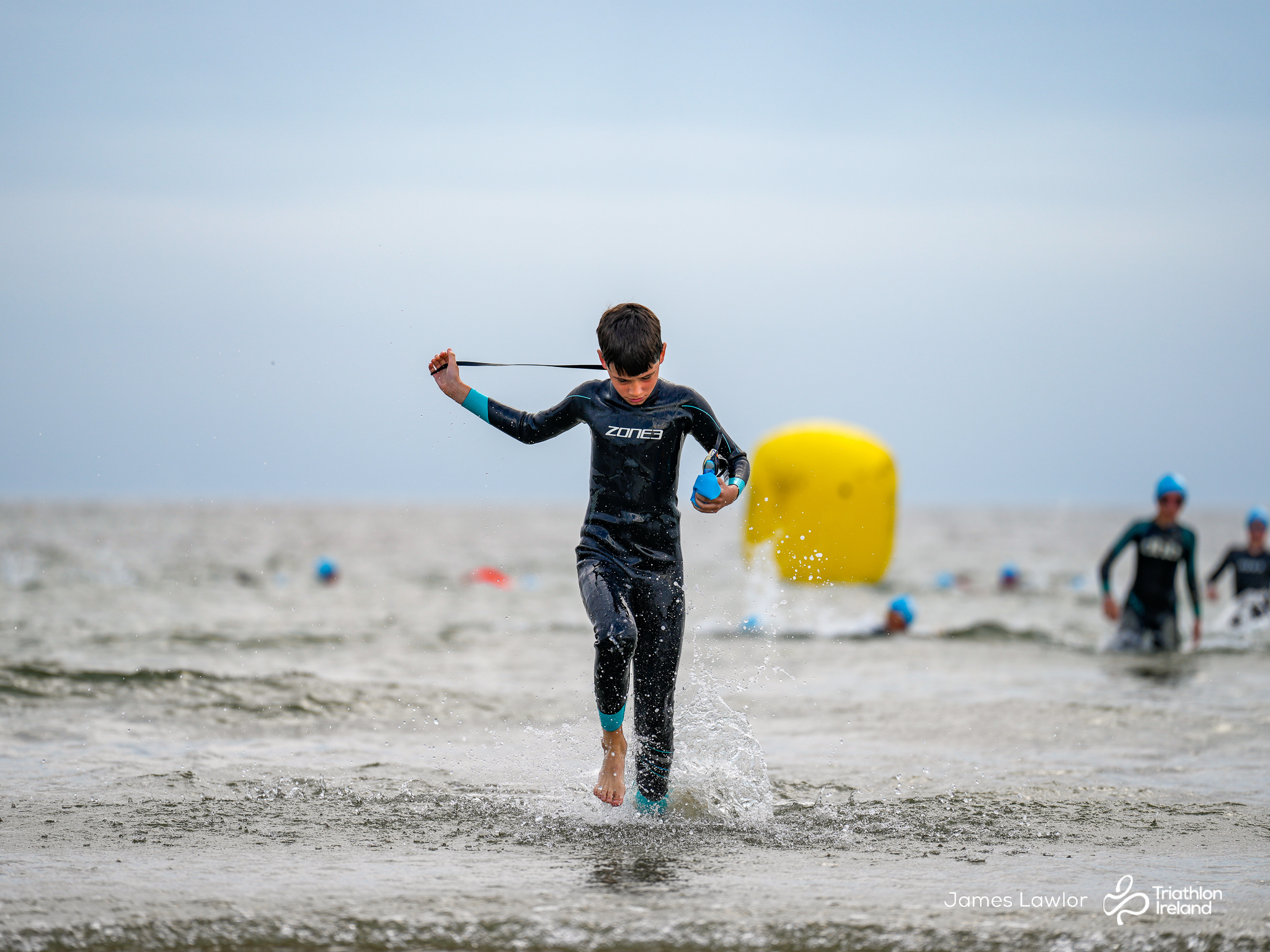 Starting with the 12 to 13 age group who had a 300 metre swim, 6.76 kilometre bike, and 1500 metre run to take on. All athletes entered the calm water together, but it was Ryan Byrne Nolan who exited first with the fastest swim split of the day, 5 minutes 22 seconds, followed by Eoghan Looney and Sam Sanders. In the female race, Anna Brett was the first to complete the swim distance in a time of 5 minutes and 48 seconds, just over a minute later Orna Ni Mhuiri followed out in second place and Lucy Cunningham exited in third place.