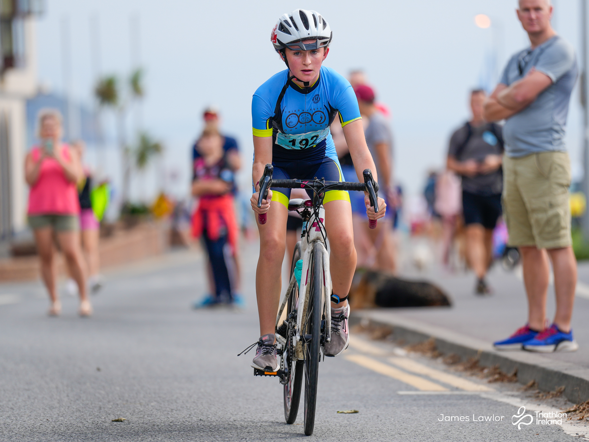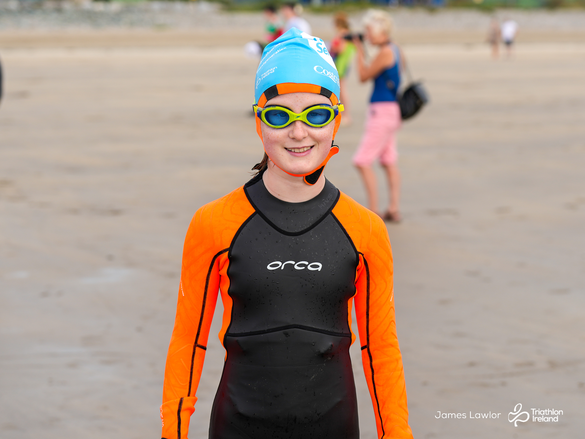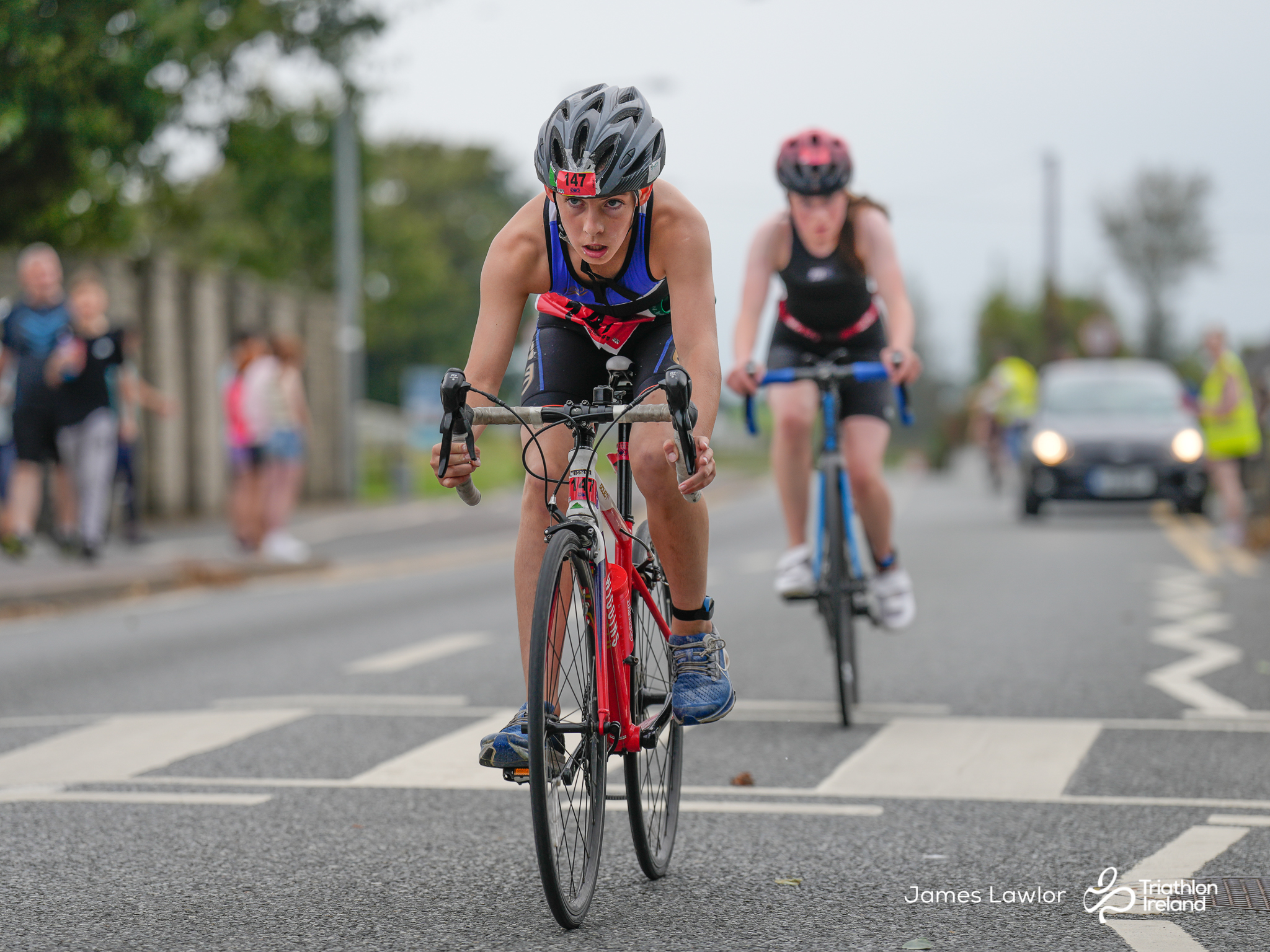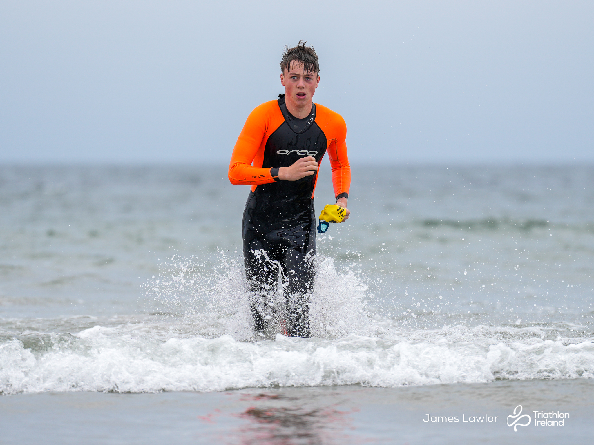 Starting with the 12 to 13 age group who had a 300 metre swim, 6.76 kilometre bike, and 1500 metre run to take on. All athletes entered the calm water together, but it was Ryan Byrne Nolan who exited first with the fastest swim split of the day, 5 minutes 22 seconds, followed by Eoghan Looney and Sam Sanders. In the female race, Anna Brett was the first to complete the swim distance in a time of 5 minutes and 48 seconds, just over a minute later Orna Ni Mhuiri followed out in second place and Lucy Cunningham exited in third place.