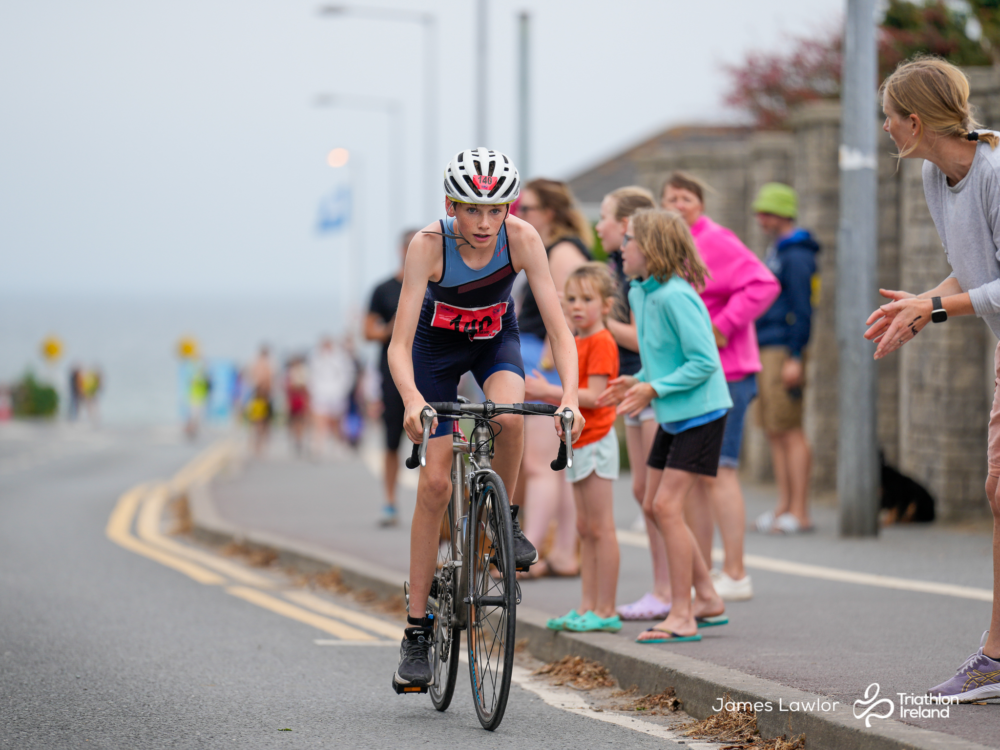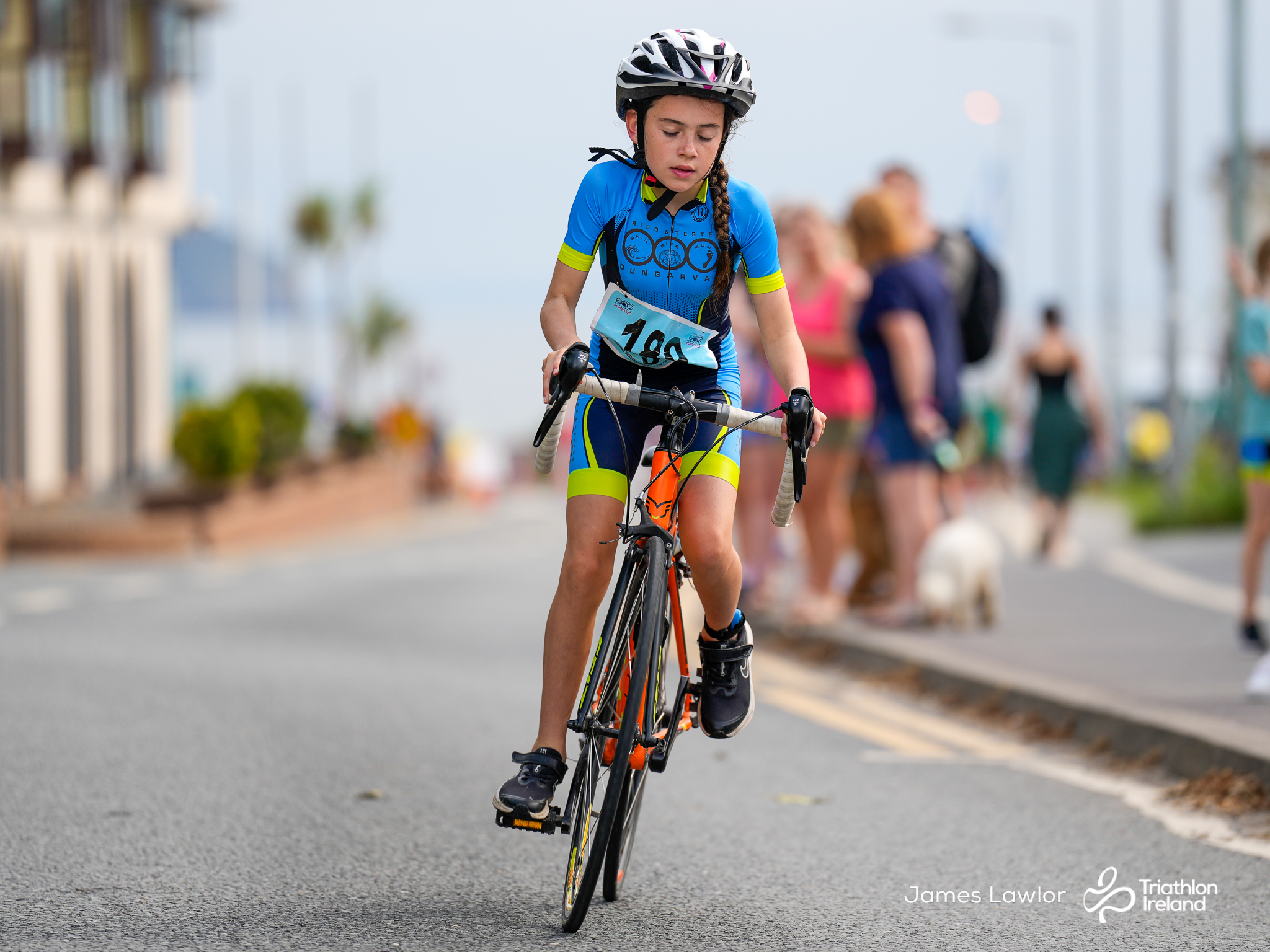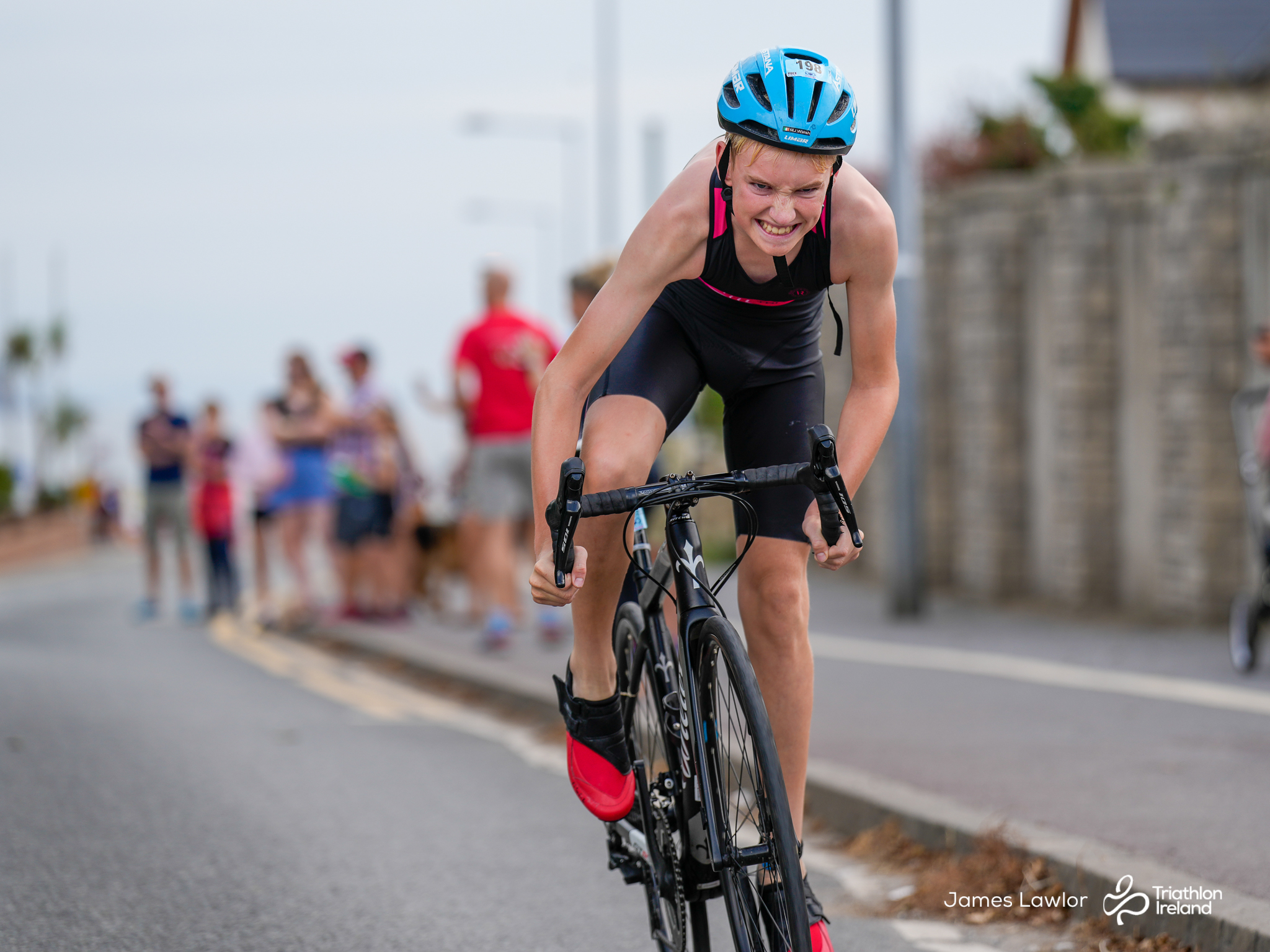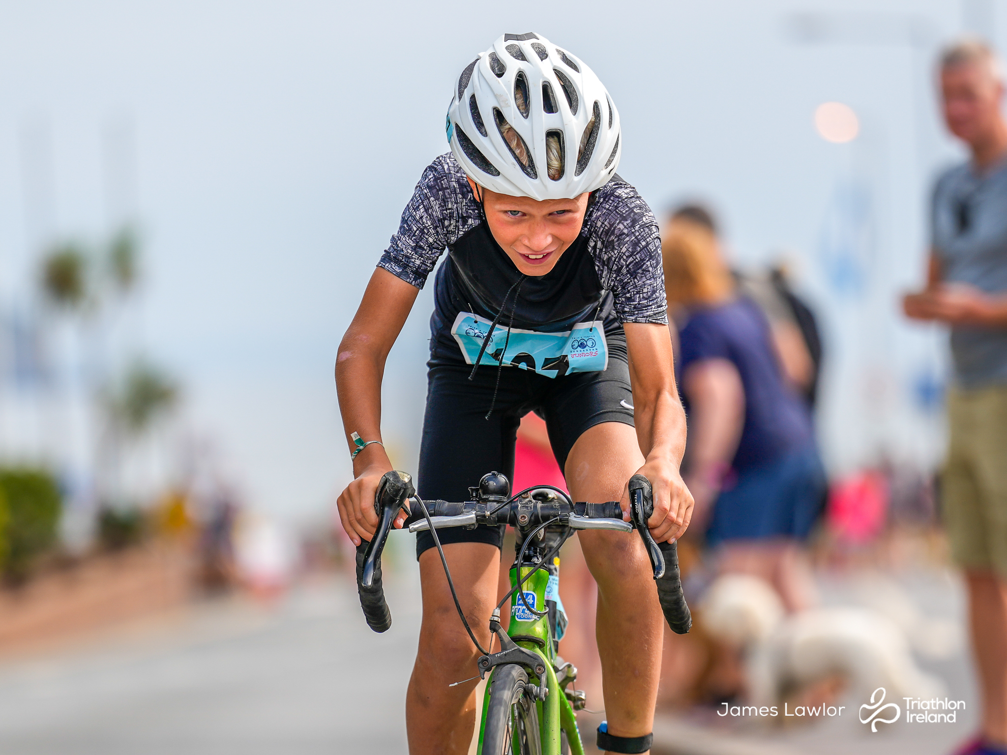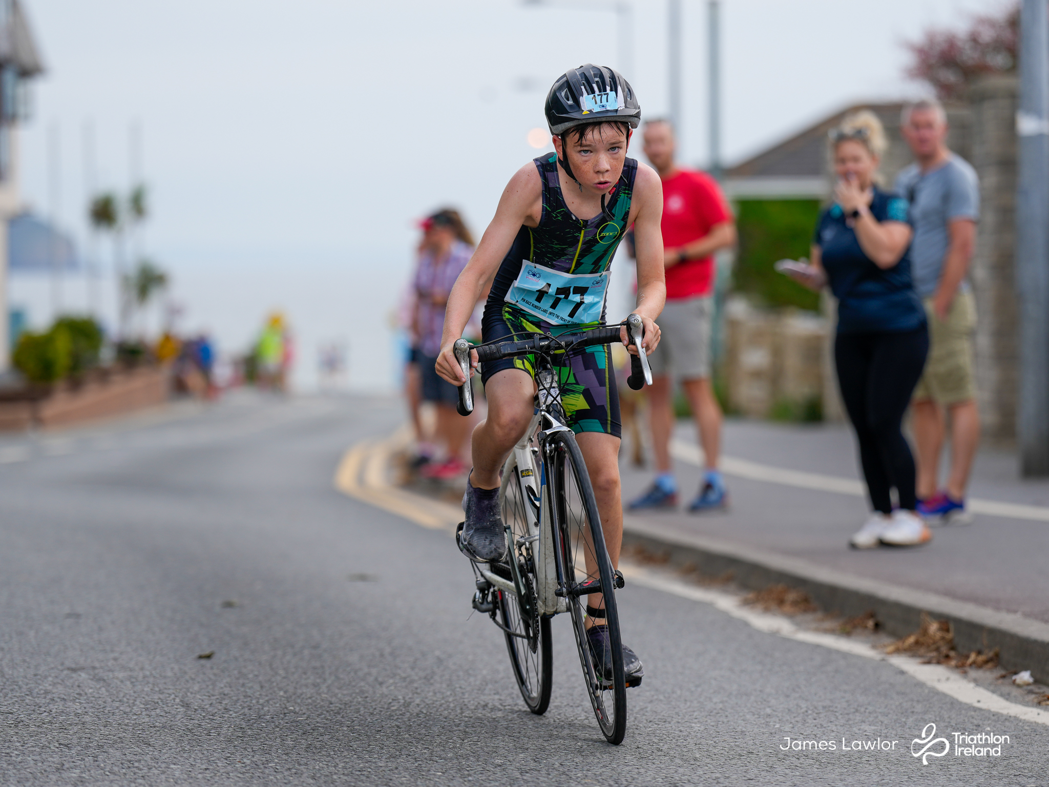 Starting with the 12 to 13 age group who had a 300 metre swim, 6.76 kilometre bike, and 1500 metre run to take on. All athletes entered the calm water together, but it was Ryan Byrne Nolan who exited first with the fastest swim split of the day, 5 minutes 22 seconds, followed by Eoghan Looney and Sam Sanders. In the female race, Anna Brett was the first to complete the swim distance in a time of 5 minutes and 48 seconds, just over a minute later Orna Ni Mhuiri followed out in second place and Lucy Cunningham exited in third place.