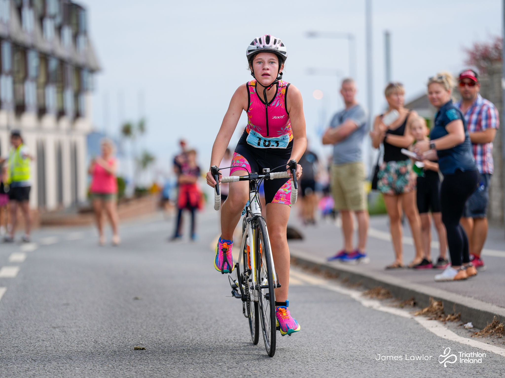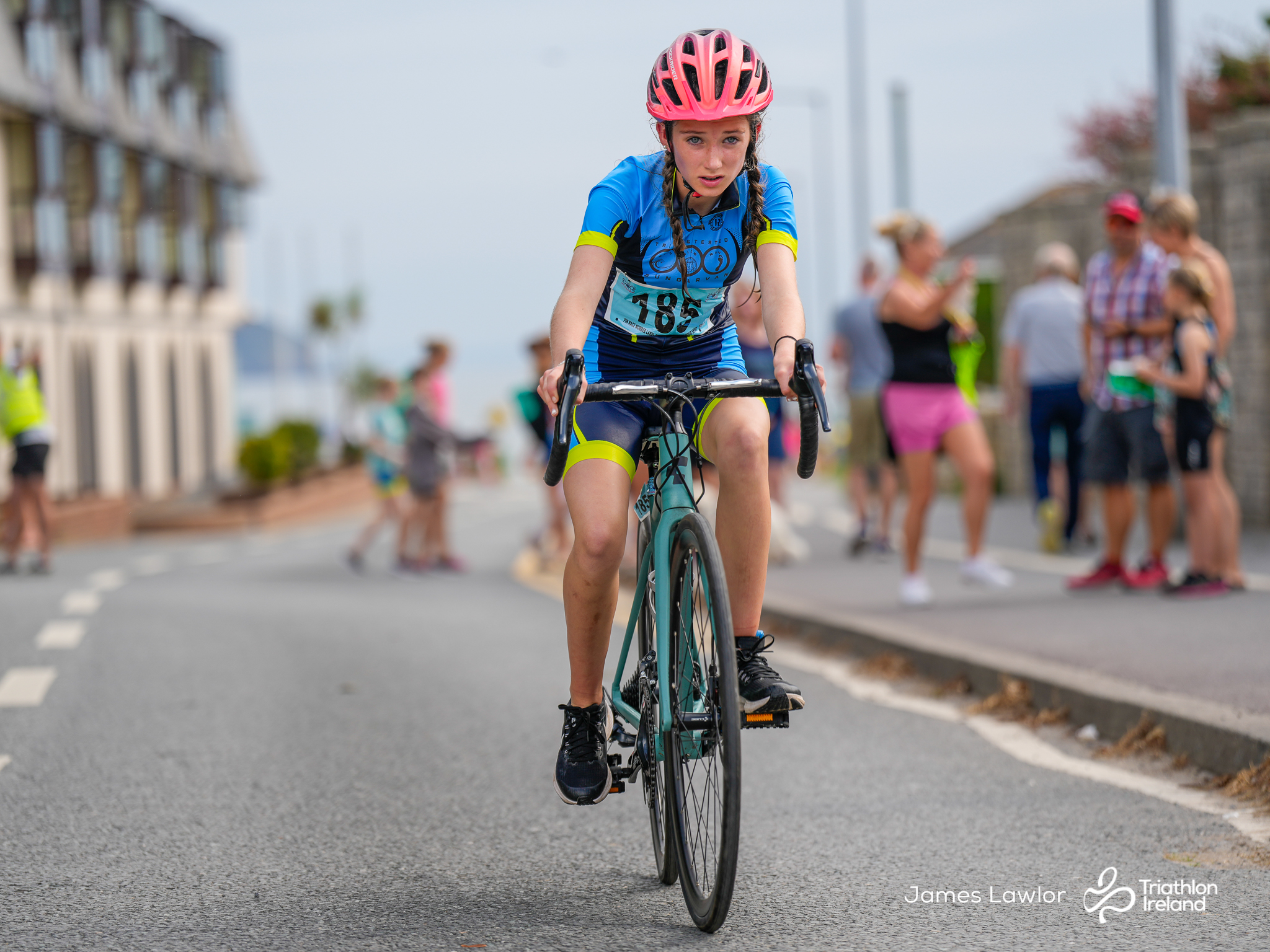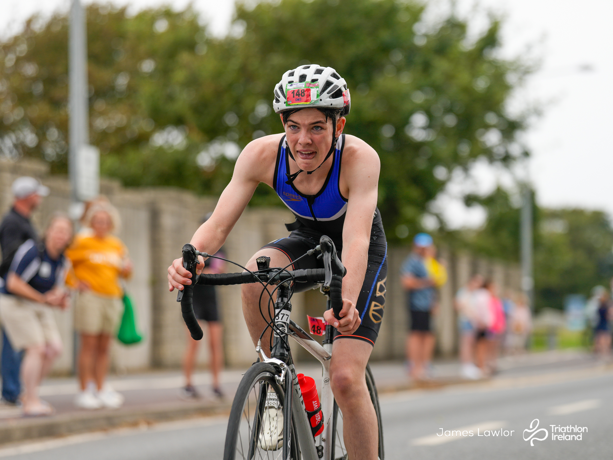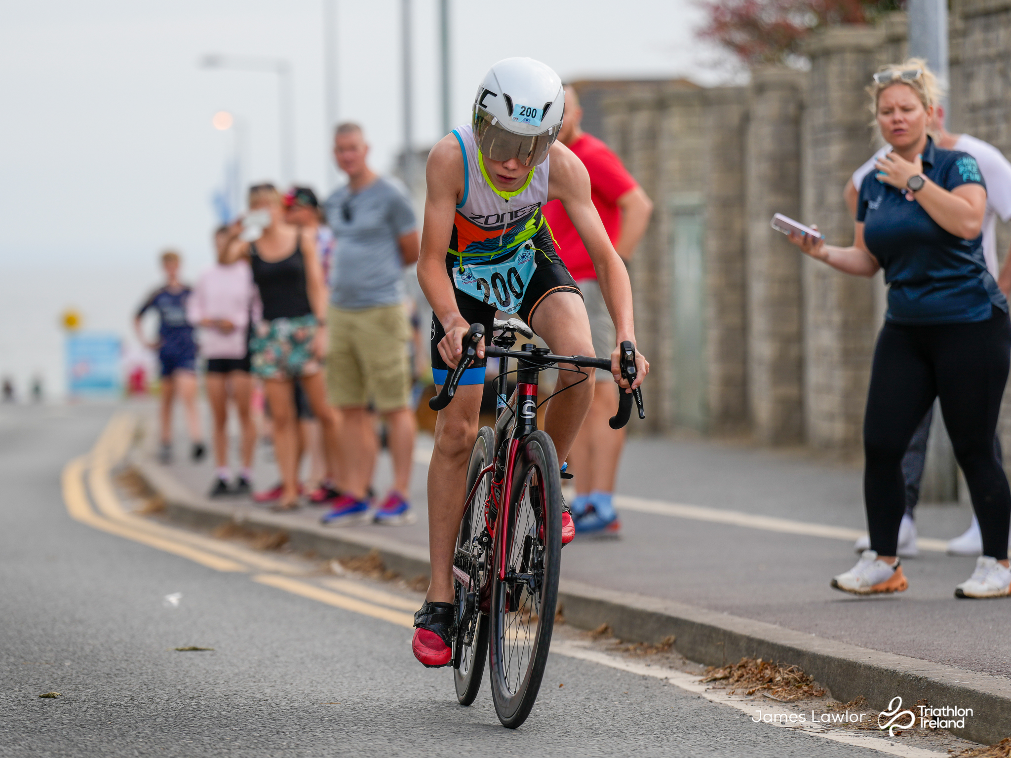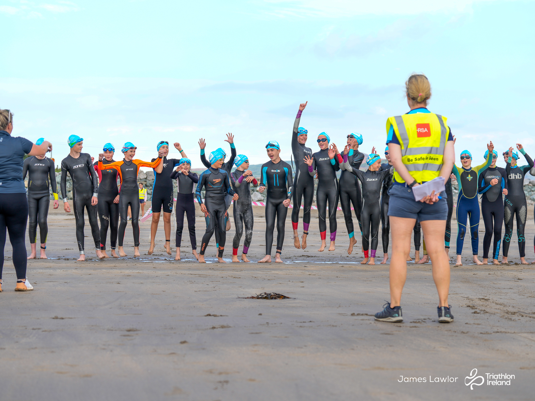 Starting with the 12 to 13 age group who had a 300 metre swim, 6.76 kilometre bike, and 1500 metre run to take on. All athletes entered the calm water together, but it was Ryan Byrne Nolan who exited first with the fastest swim split of the day, 5 minutes 22 seconds, followed by Eoghan Looney and Sam Sanders. In the female race, Anna Brett was the first to complete the swim distance in a time of 5 minutes and 48 seconds, just over a minute later Orna Ni Mhuiri followed out in second place and Lucy Cunningham exited in third place.