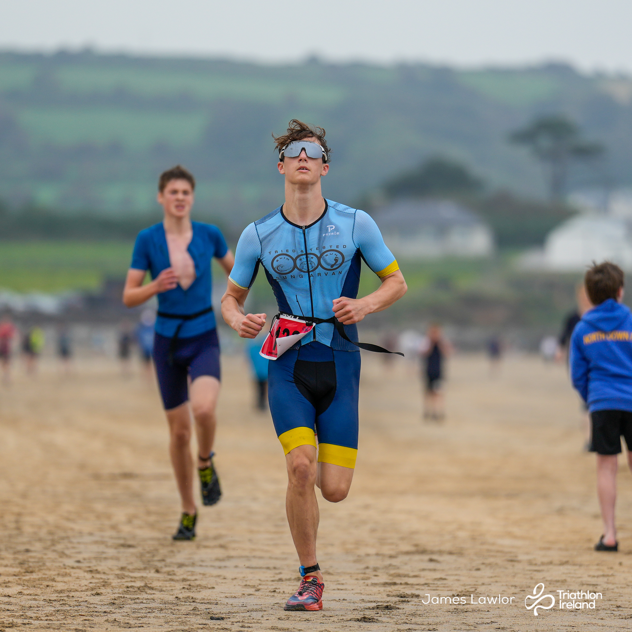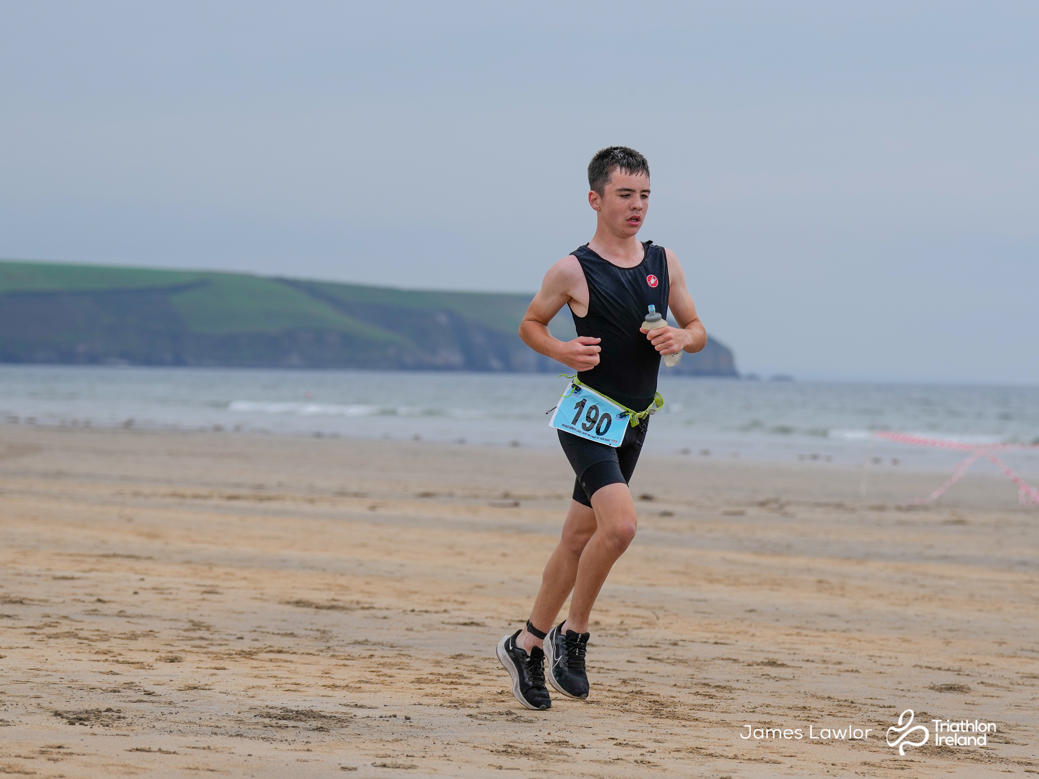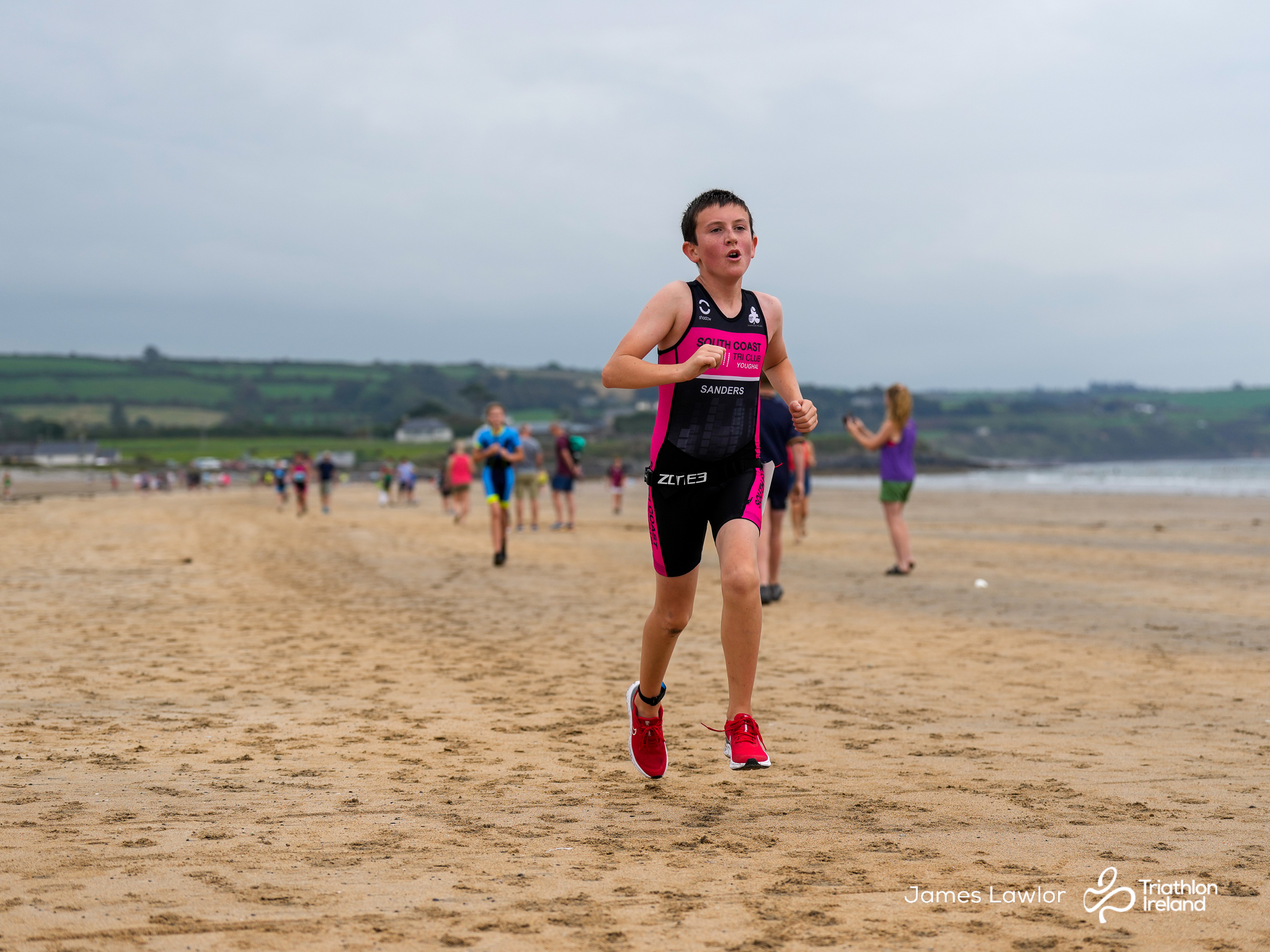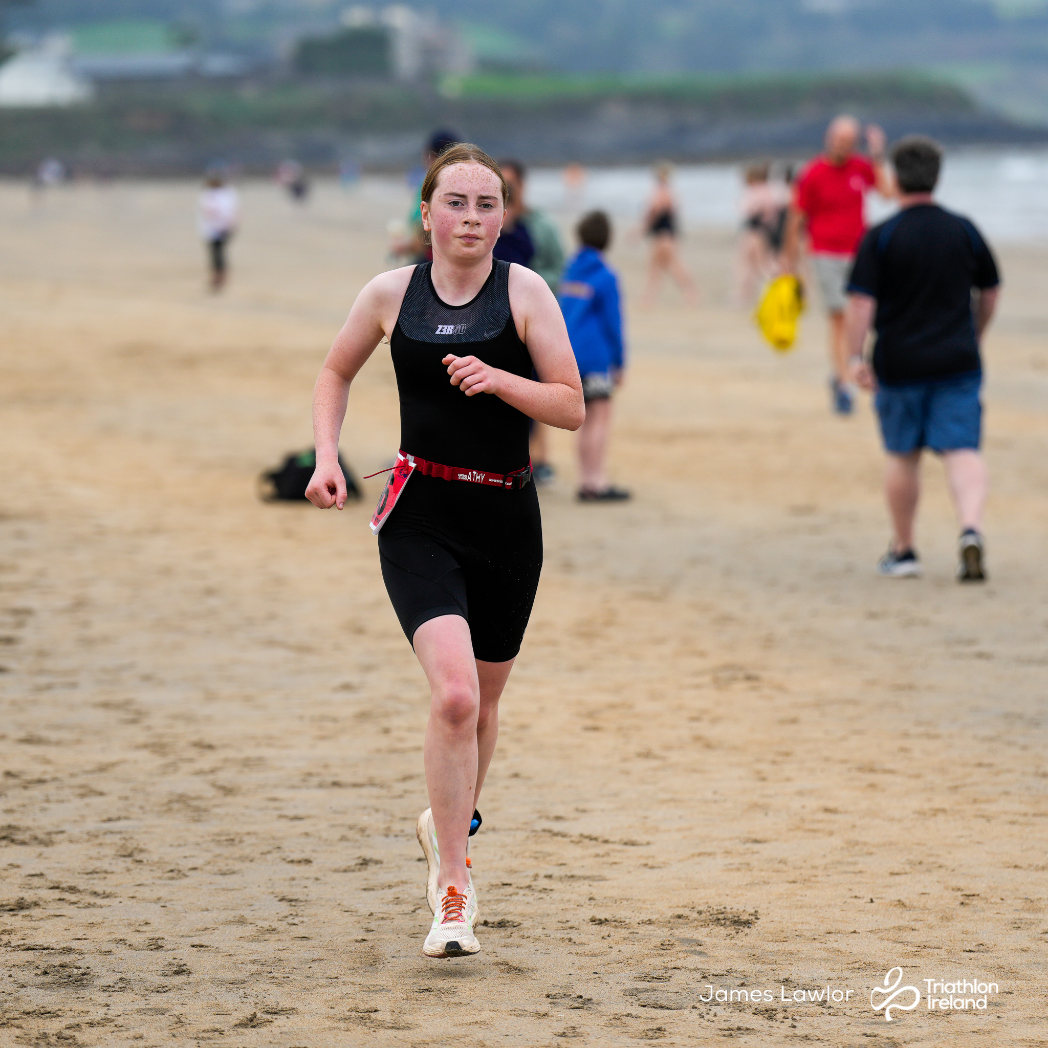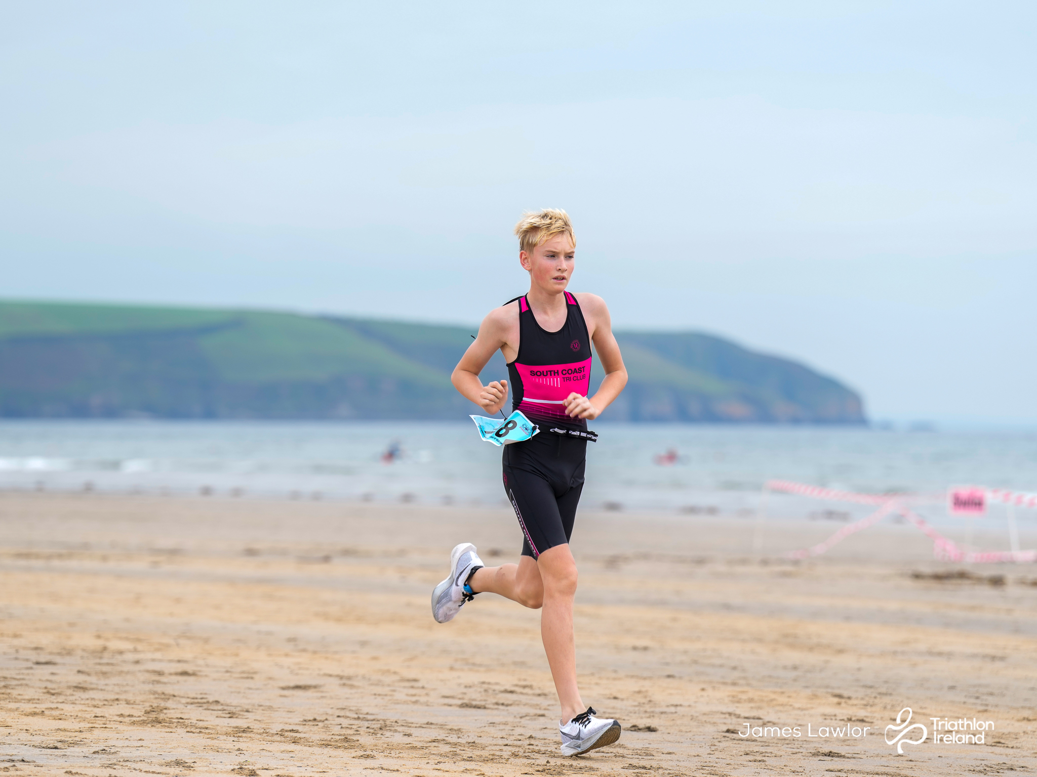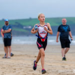 The bikes were rapidly racked, helmets hung up, and shoes swapped – these amazing athletes were ready to run. 2500 metres up the stunning Clonea Strand was an amazing sight to watch. Matthew Mahony was the fastest over the run leg in a time of 8 minutes 30 seconds, Peter Woods was the second fastest on the run, and Finaly Carry the third fastest. Maintaining her lead, Lara Buck was the quickest female runner with a time of 10 minutes 6 seconds, followed by Amy O’Rourke, and Sophie Currie.