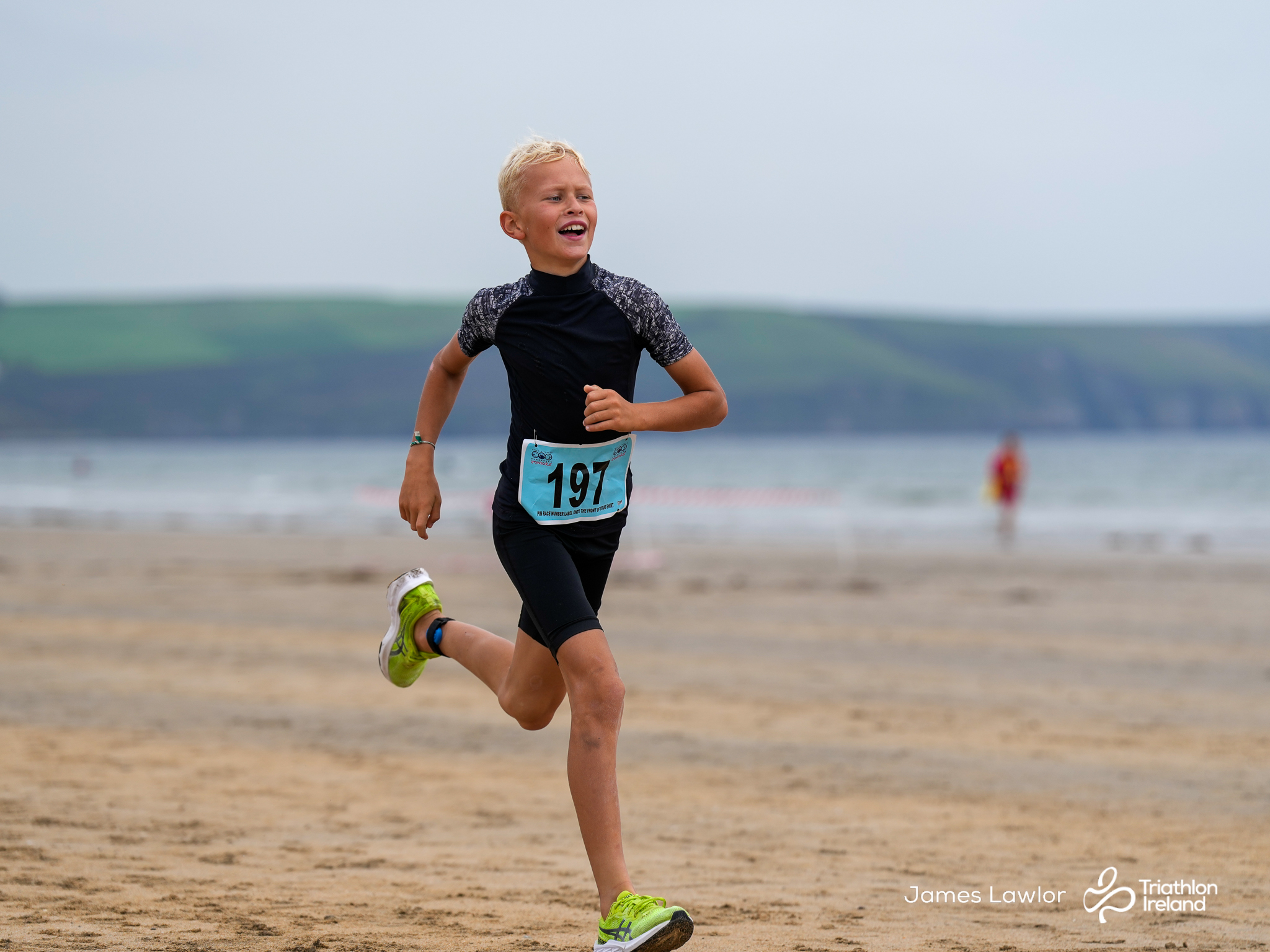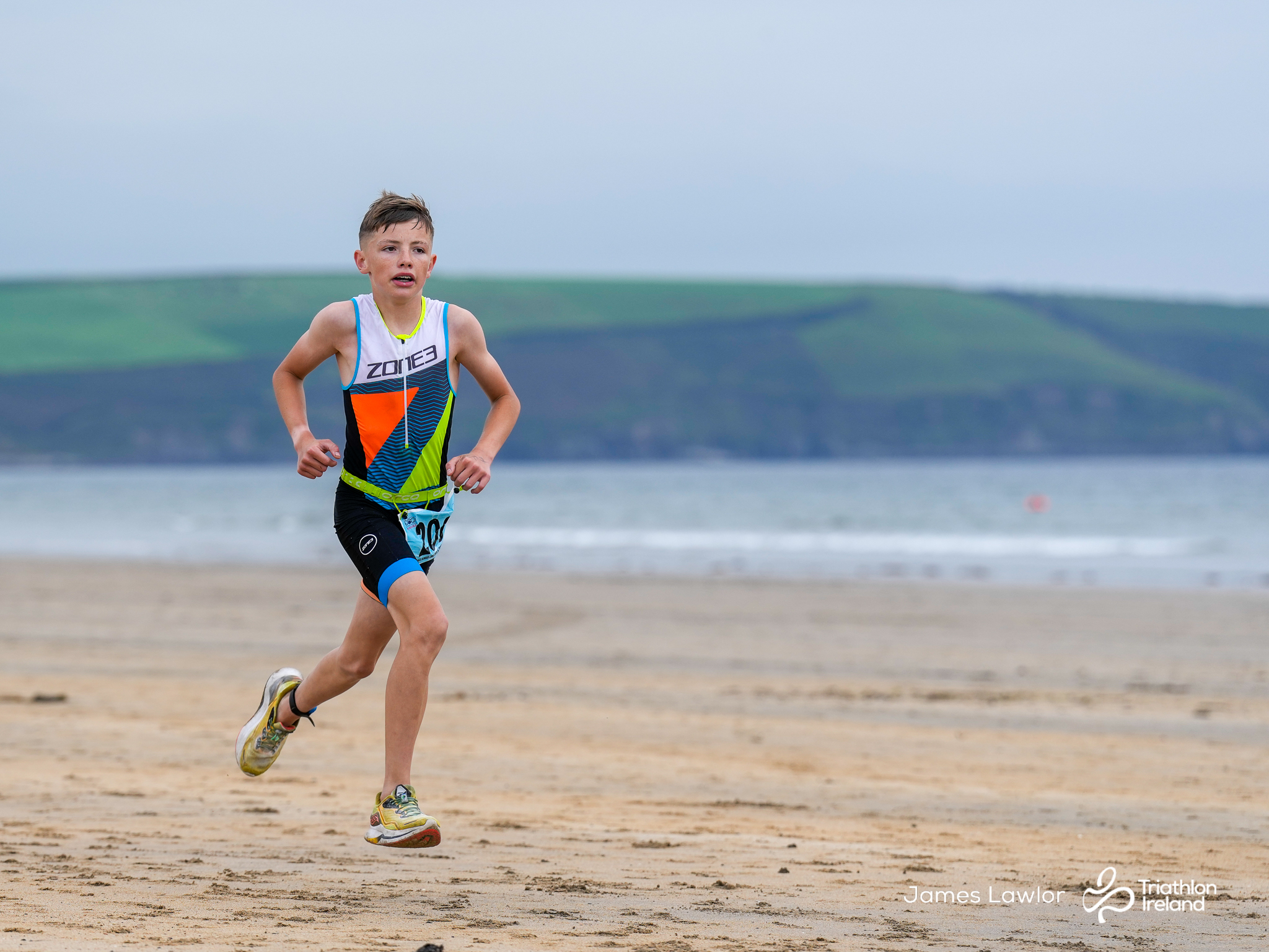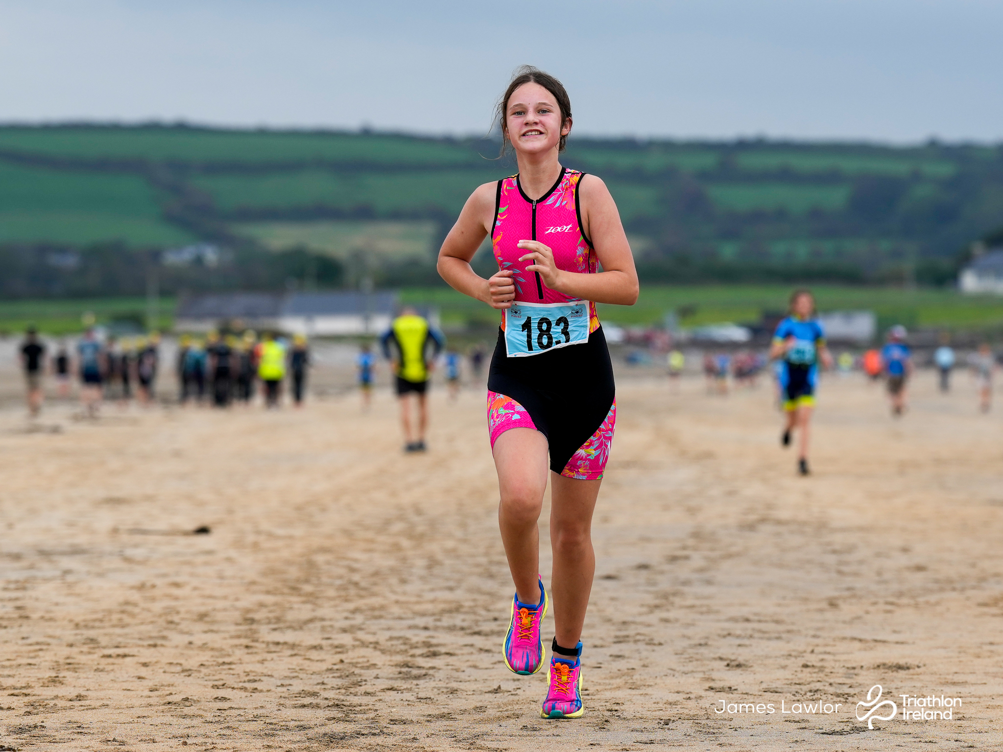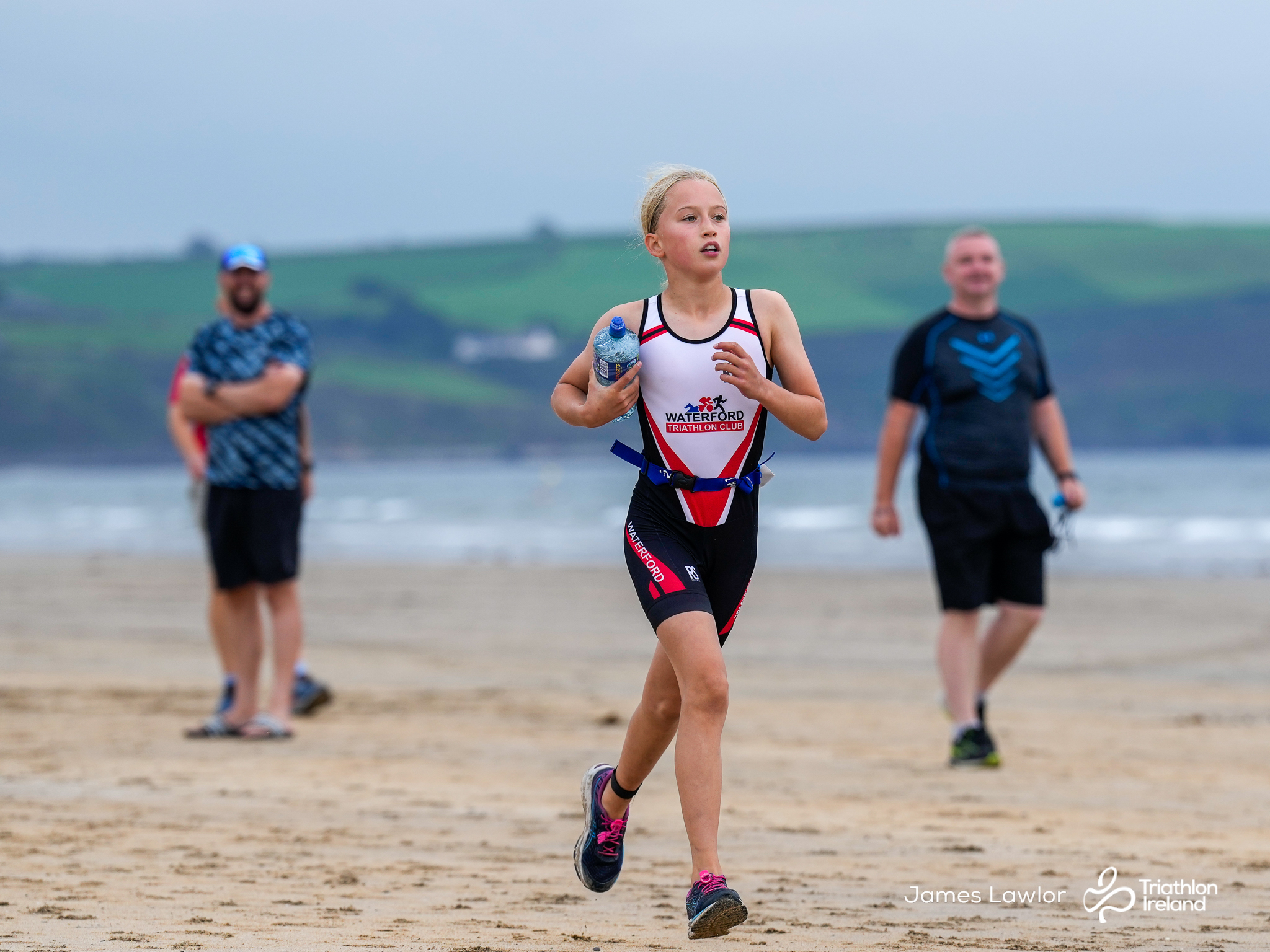 The bikes were rapidly racked, helmets hung up, and shoes swapped – these amazing athletes were ready to run. 2500 metres up the stunning Clonea Strand was an amazing sight to watch. Matthew Mahony was the fastest over the run leg in a time of 8 minutes 30 seconds, Peter Woods was the second fastest on the run, and Finaly Carry the third fastest. Maintaining her lead, Lara Buck was the quickest female runner with a time of 10 minutes 6 seconds, followed by Amy O’Rourke, and Sophie Currie.