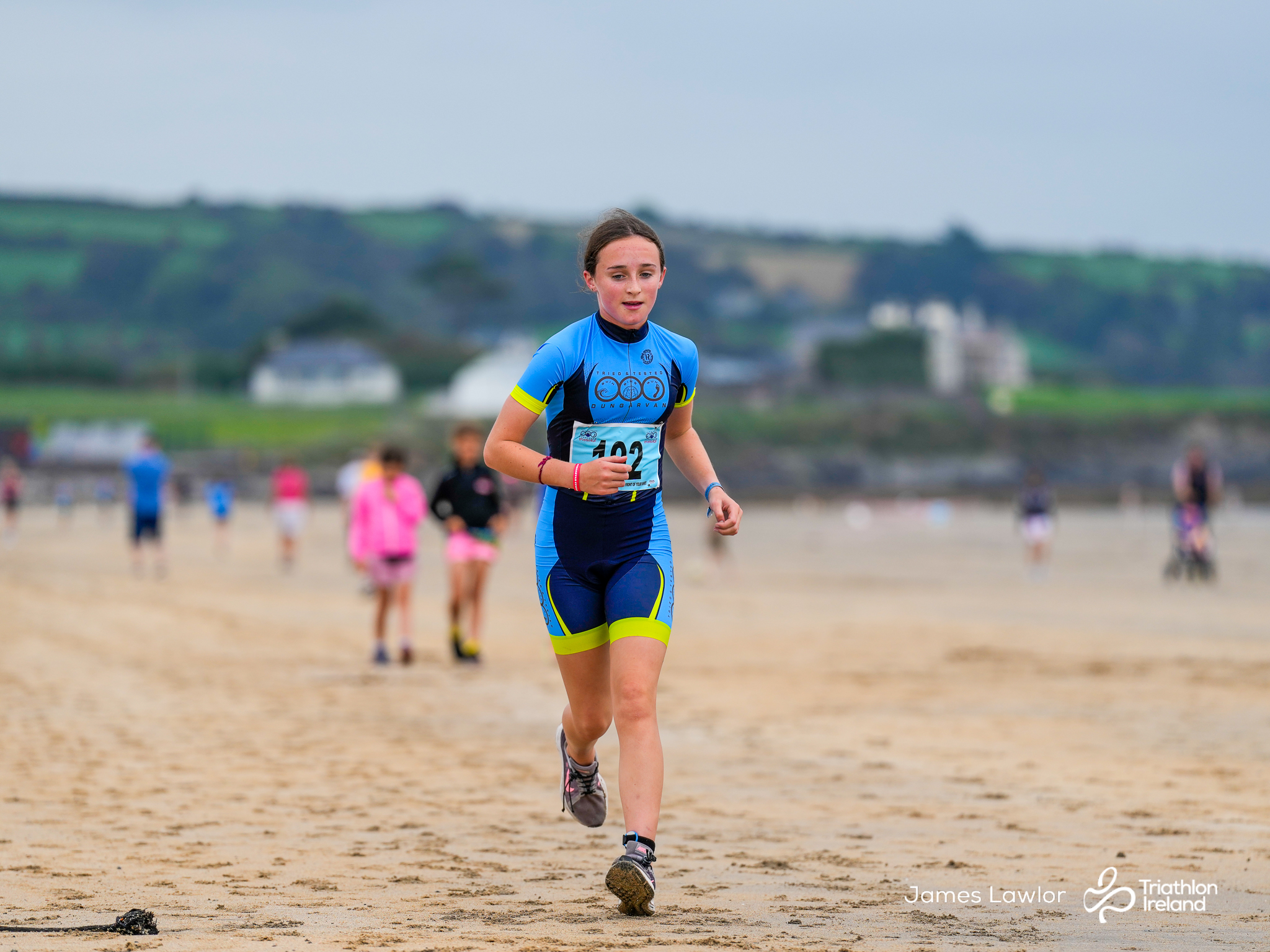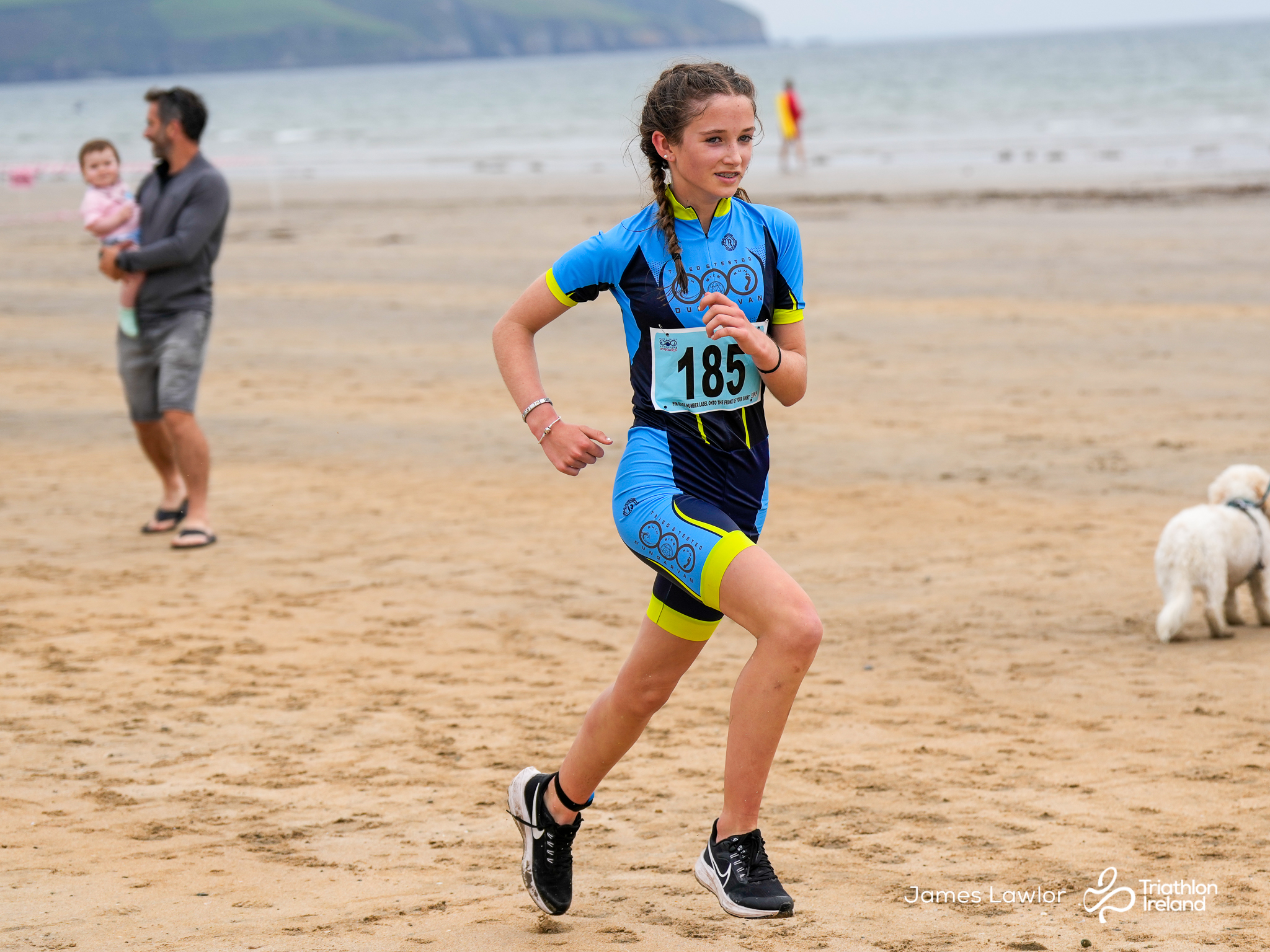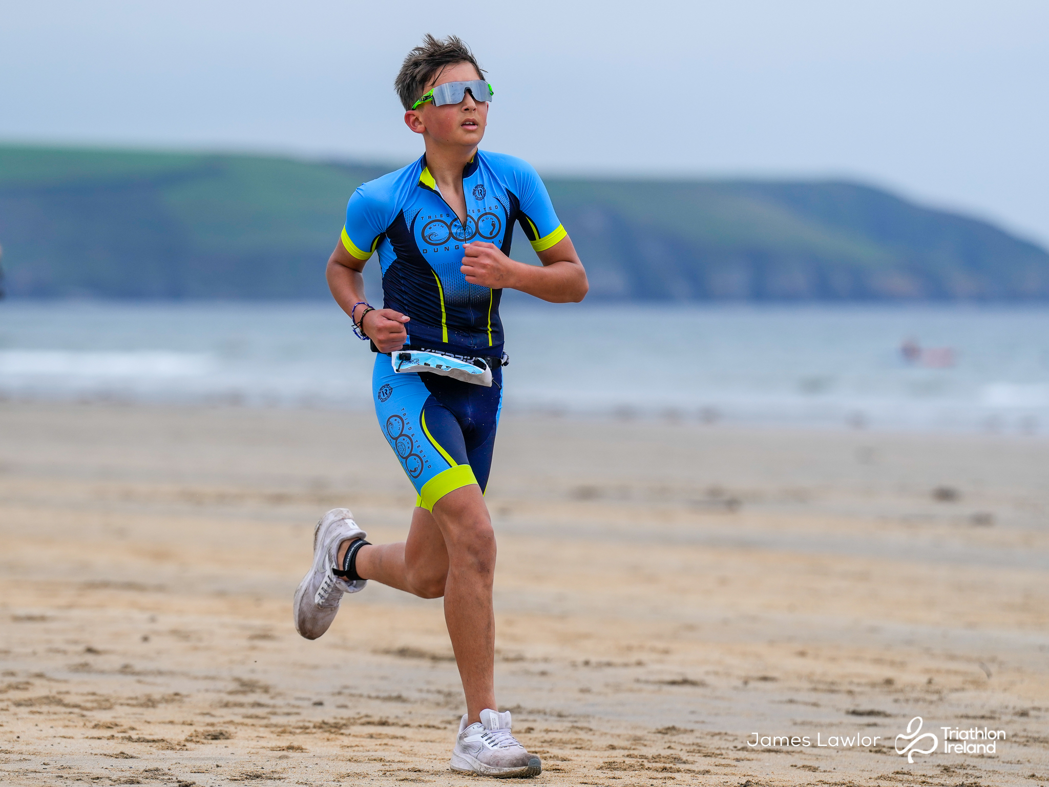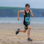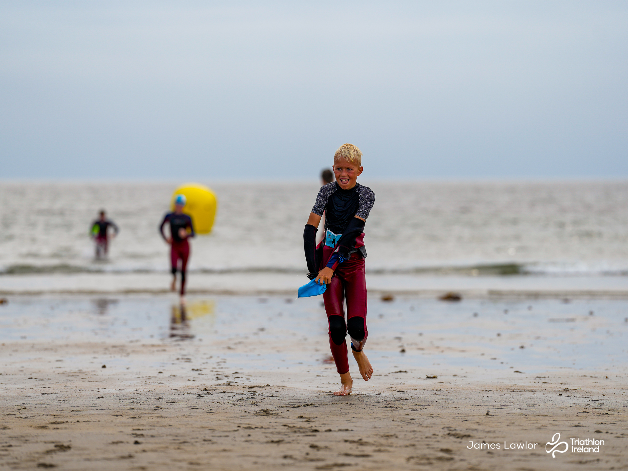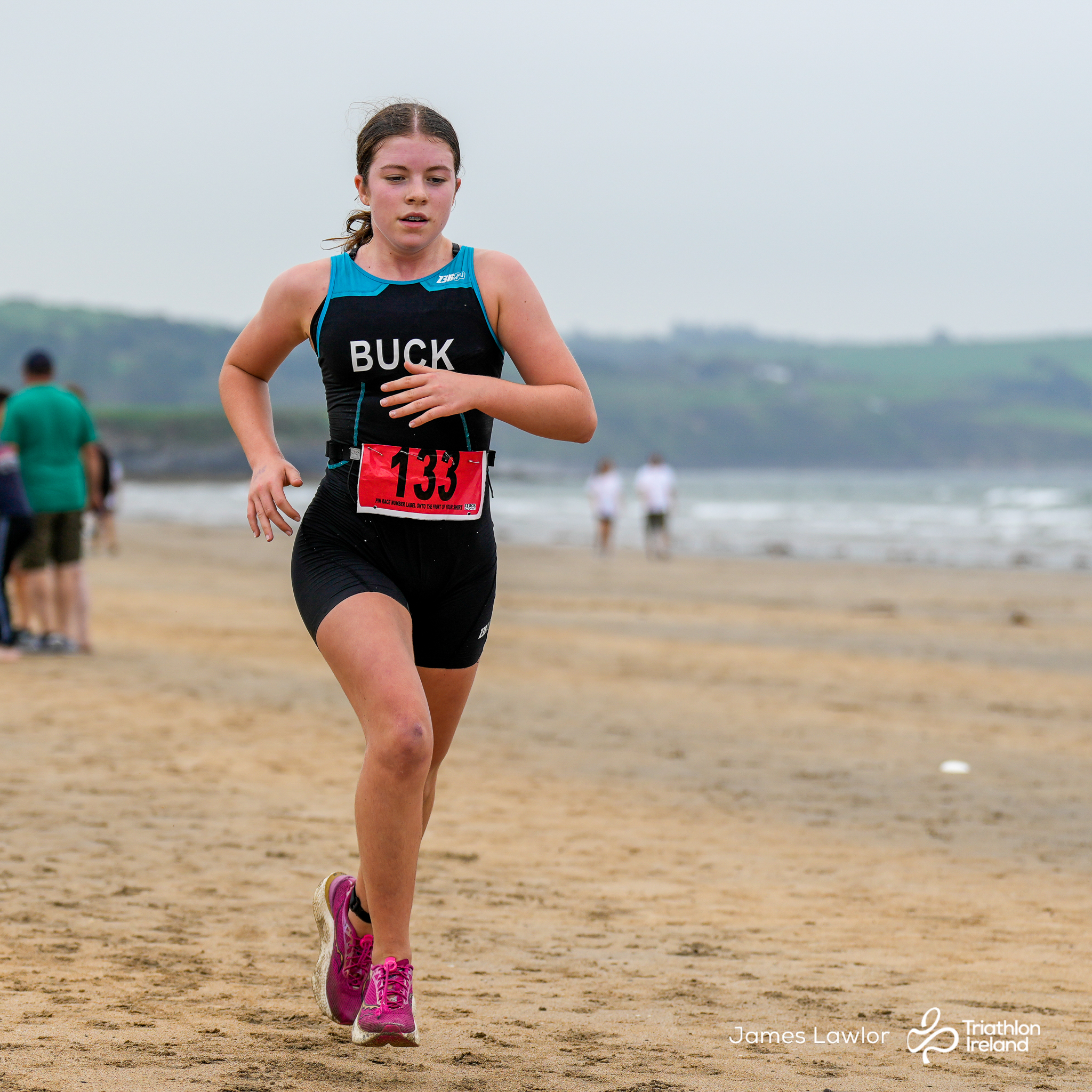 The bikes were rapidly racked, helmets hung up, and shoes swapped – these amazing athletes were ready to run. 2500 metres up the stunning Clonea Strand was an amazing sight to watch. Matthew Mahony was the fastest over the run leg in a time of 8 minutes 30 seconds, Peter Woods was the second fastest on the run, and Finaly Carry the third fastest. Maintaining her lead, Lara Buck was the quickest female runner with a time of 10 minutes 6 seconds, followed by Amy O’Rourke, and Sophie Currie.