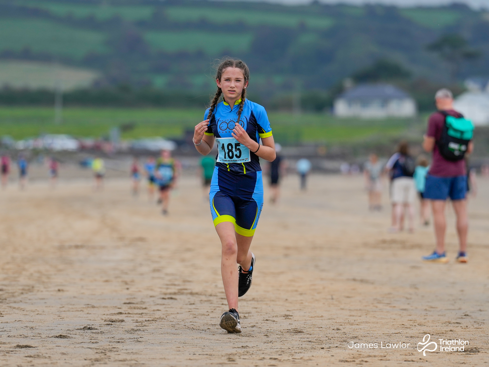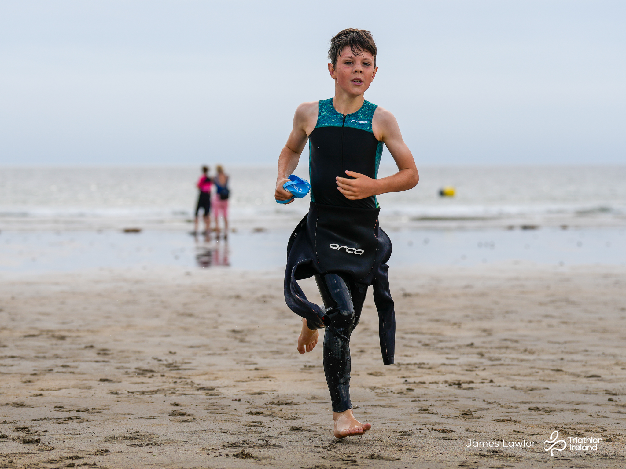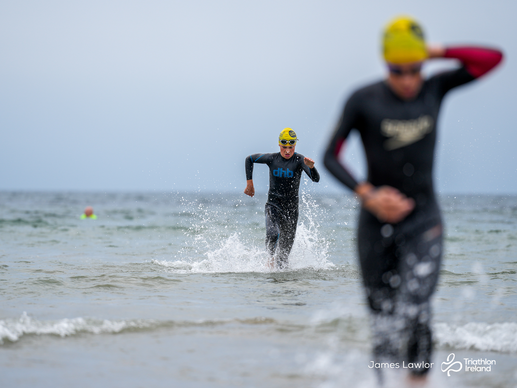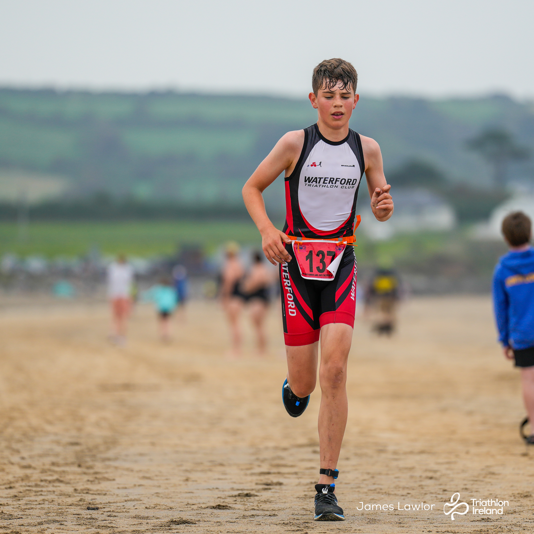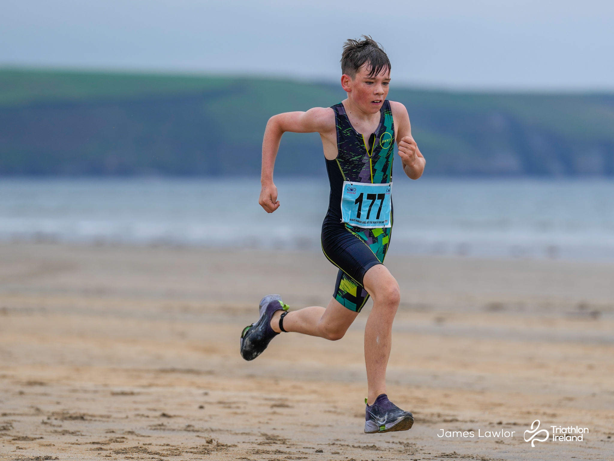 The bikes were rapidly racked, helmets hung up, and shoes swapped – these amazing athletes were ready to run. 2500 metres up the stunning Clonea Strand was an amazing sight to watch. Matthew Mahony was the fastest over the run leg in a time of 8 minutes 30 seconds, Peter Woods was the second fastest on the run, and Finaly Carry the third fastest. Maintaining her lead, Lara Buck was the quickest female runner with a time of 10 minutes 6 seconds, followed by Amy O’Rourke, and Sophie Currie.