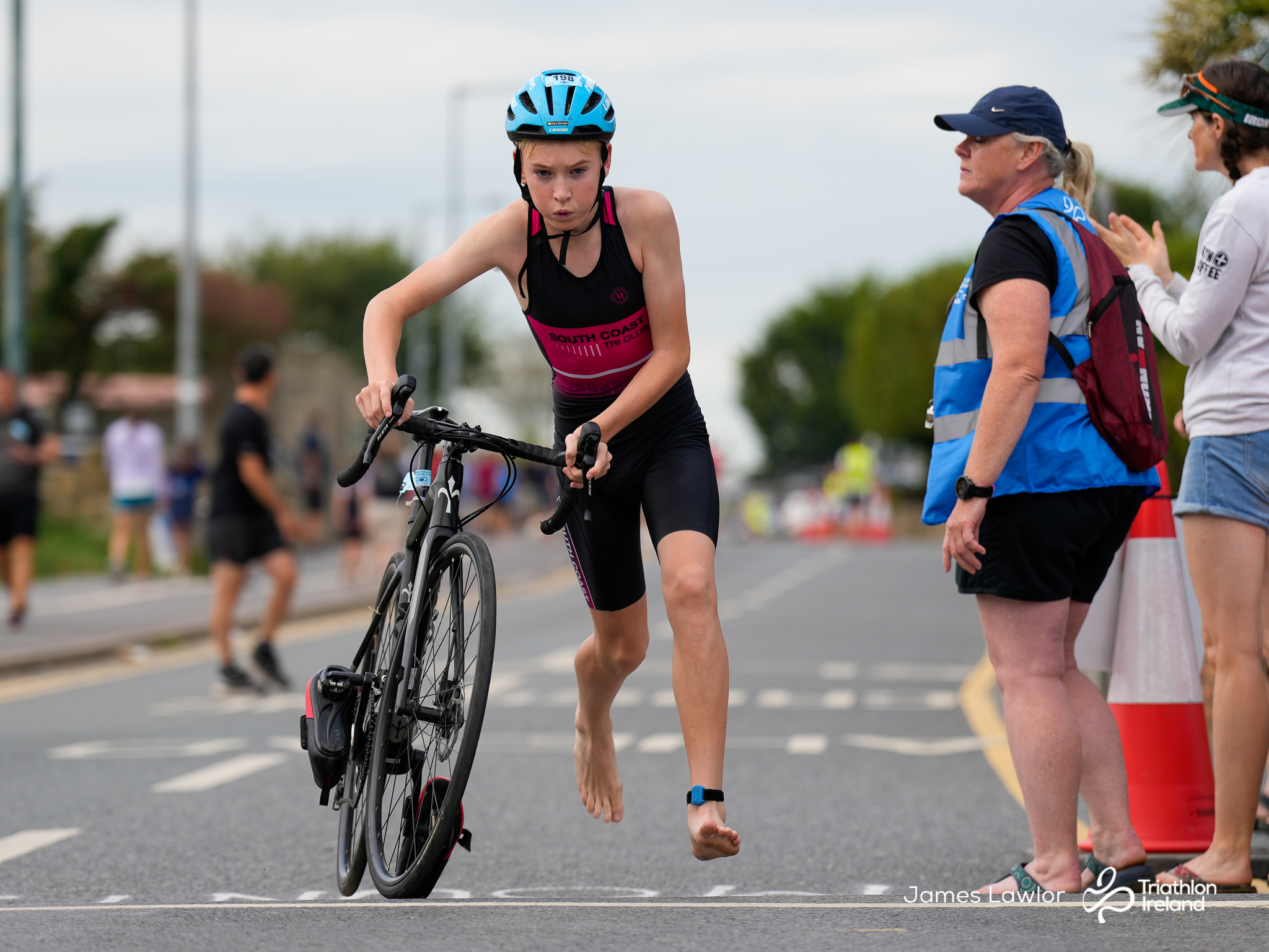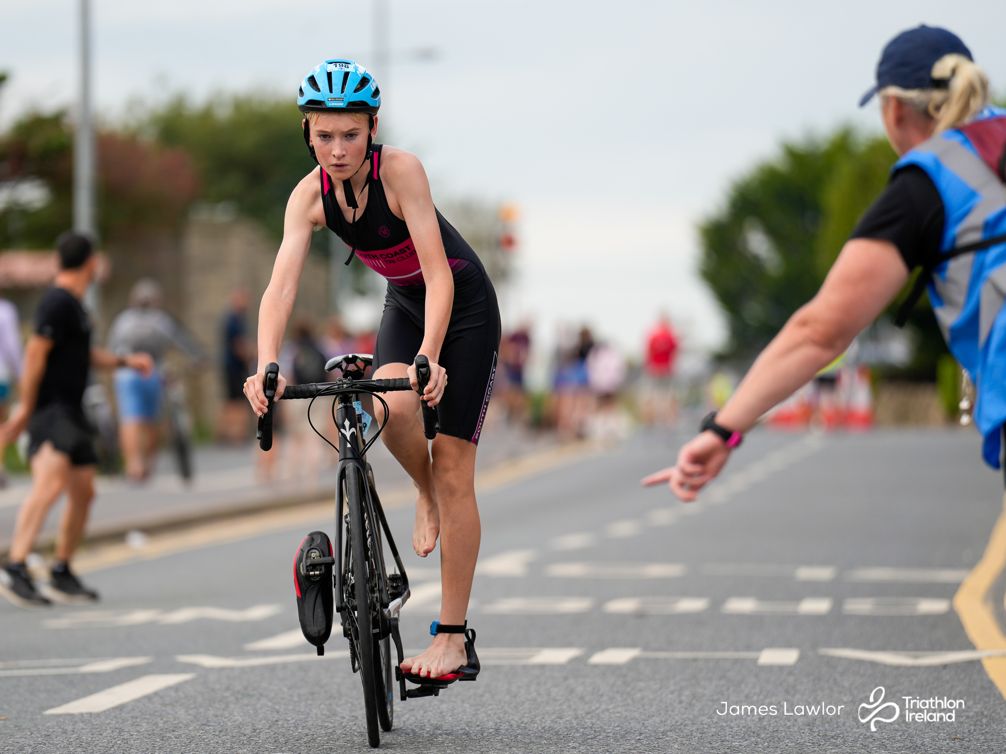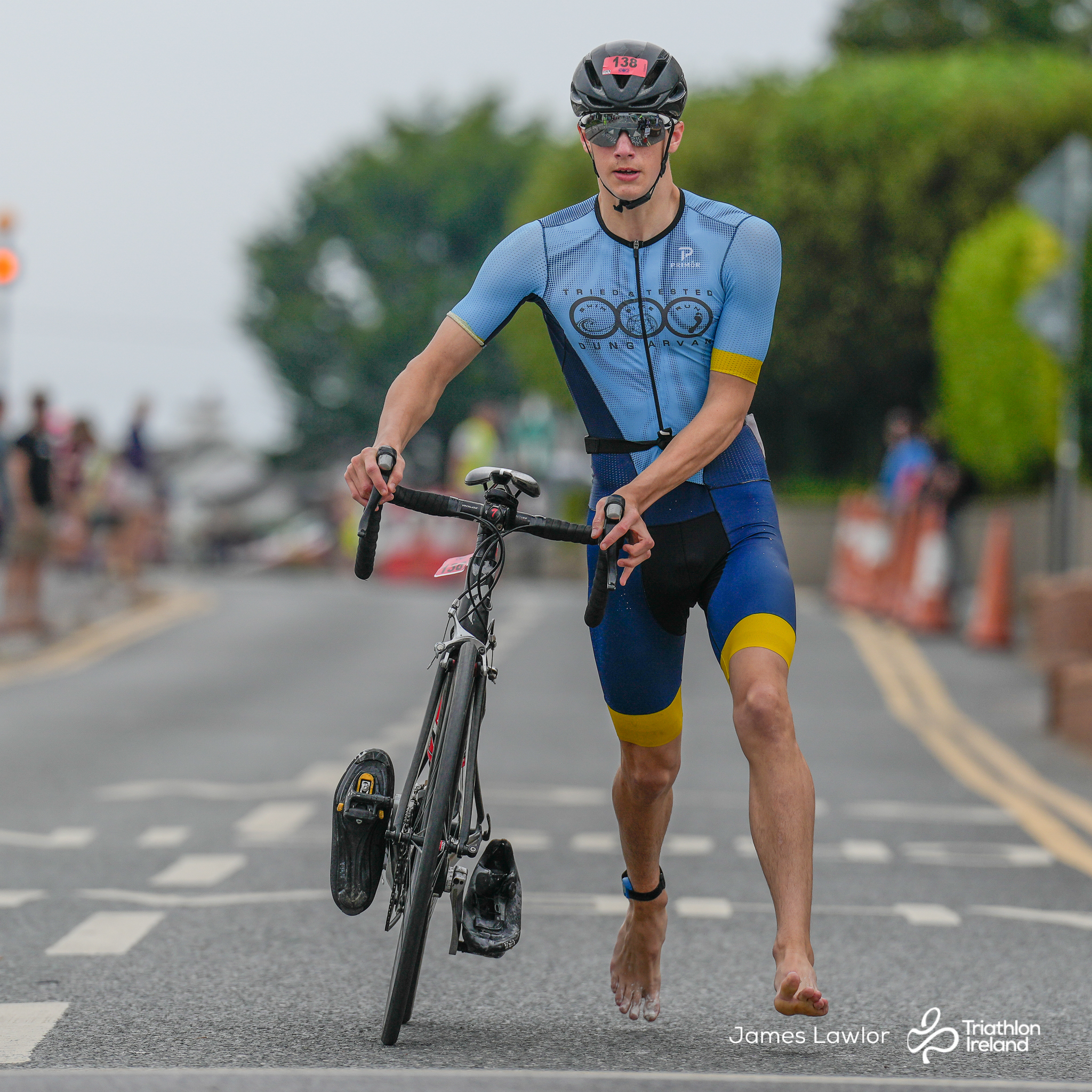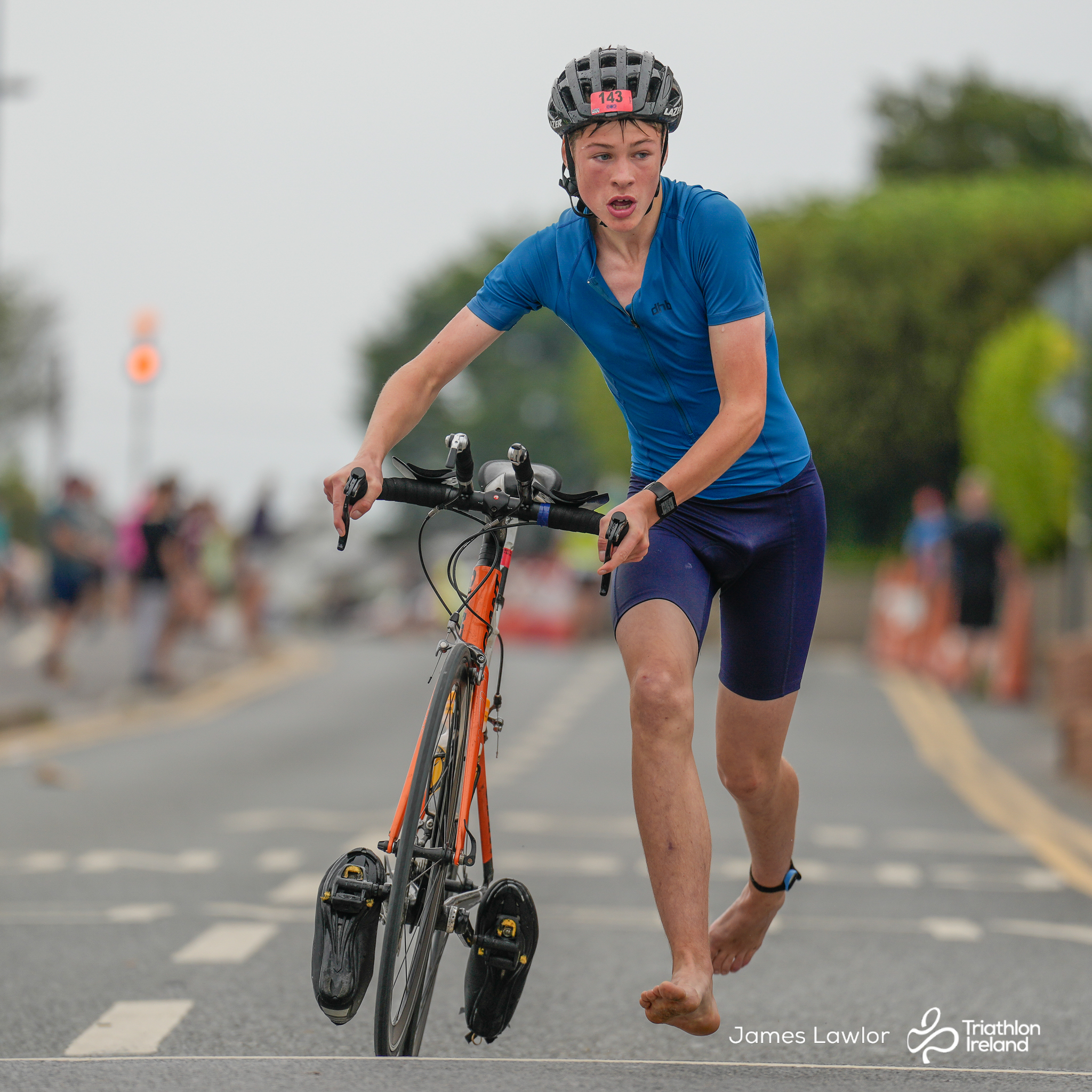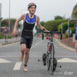 After T1, all athletes had the fast and flat bike course to take on. MJ Walsh had the fastest bike split taking him 12 minutes and 28 seconds to complete the distance followed by Ryan Byrne Nolan, and Eoghan Looney with Ben Storey shortly after. For the females, Lucy Cunnighman covered the bike course in 14 minutes 11 seconds, closely followed by Luisne DePaor, Anna Brett and Ciara O’Donovan. Huge kudos to all the athletes who navigated their way around the tight turnaround points impeccably, for spectators, it was fantastic to see such amazing skill on display!