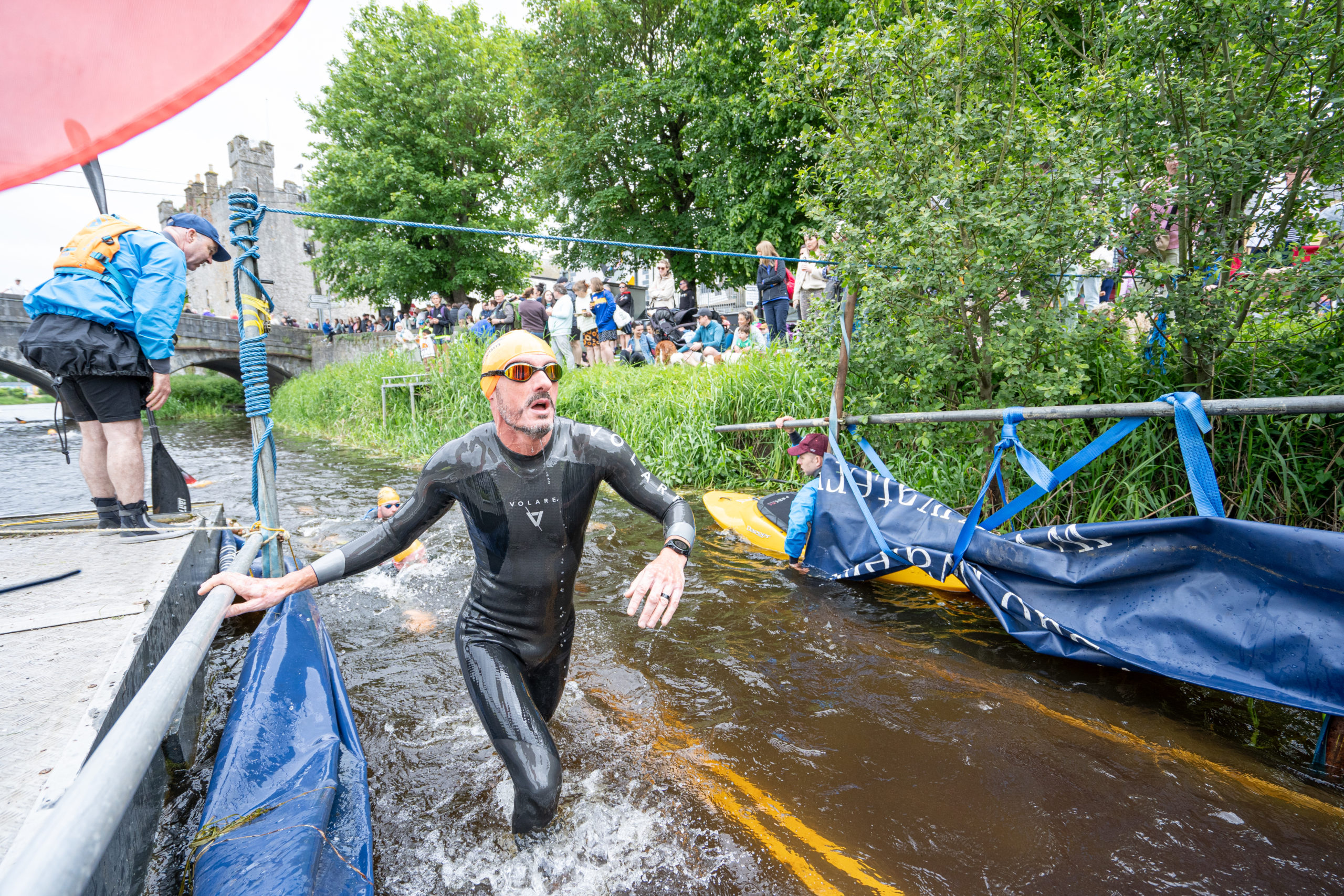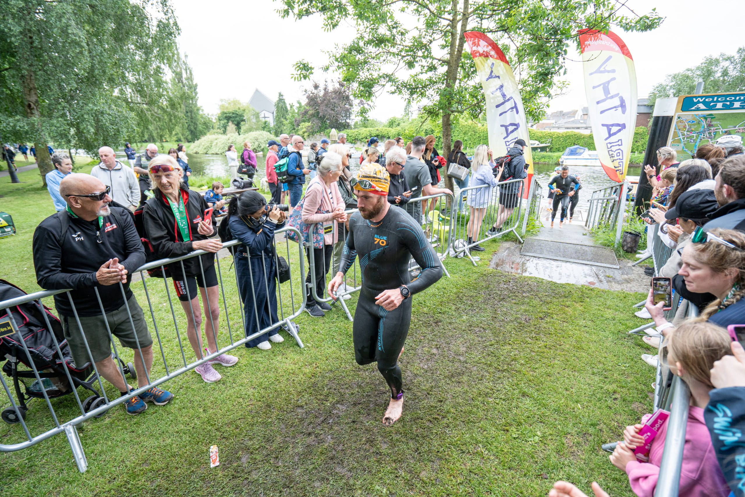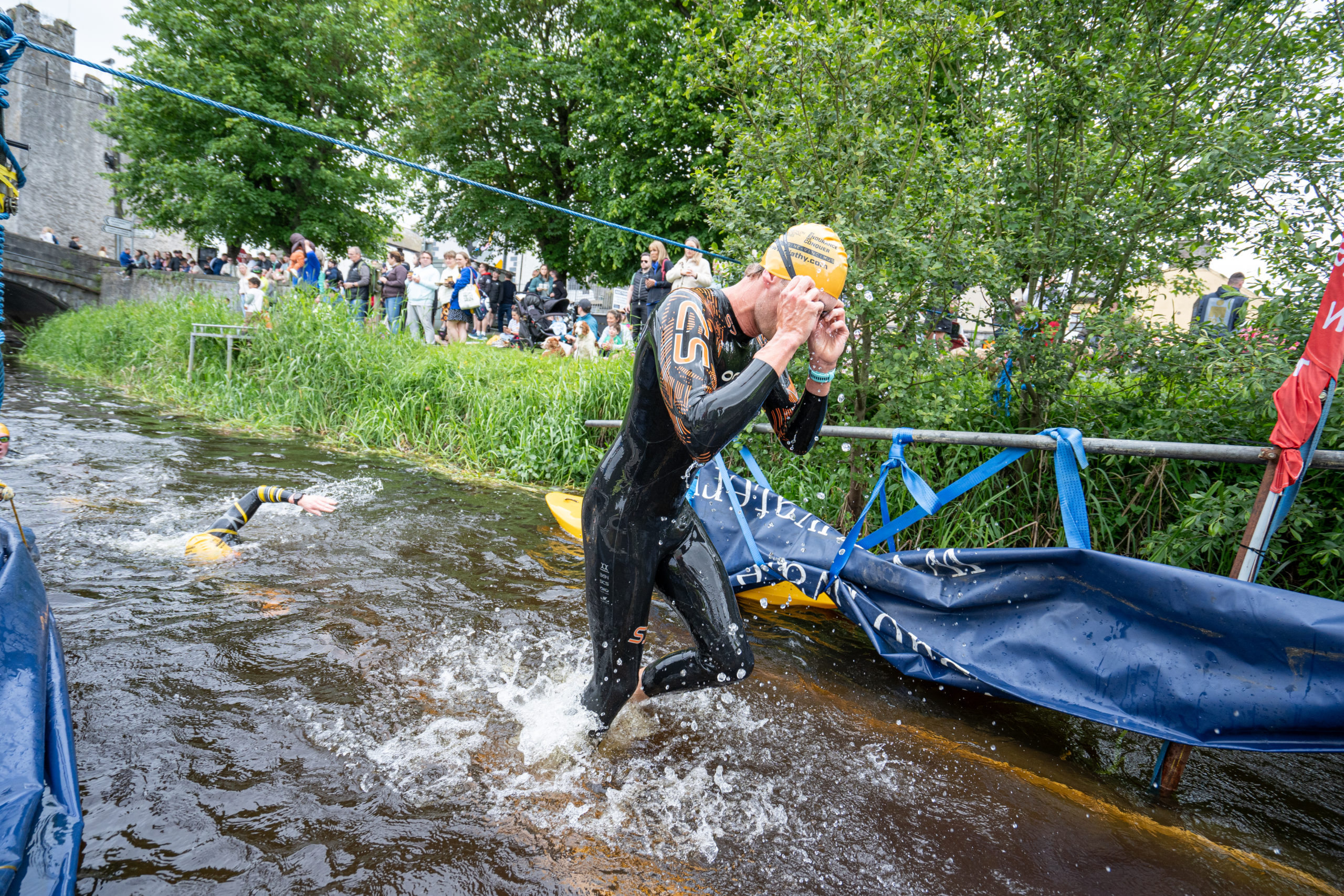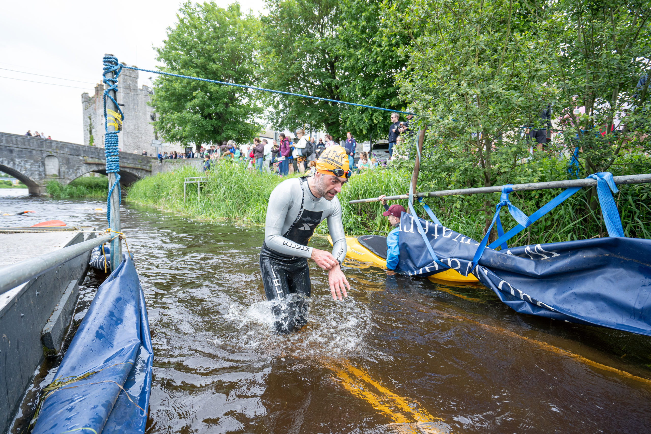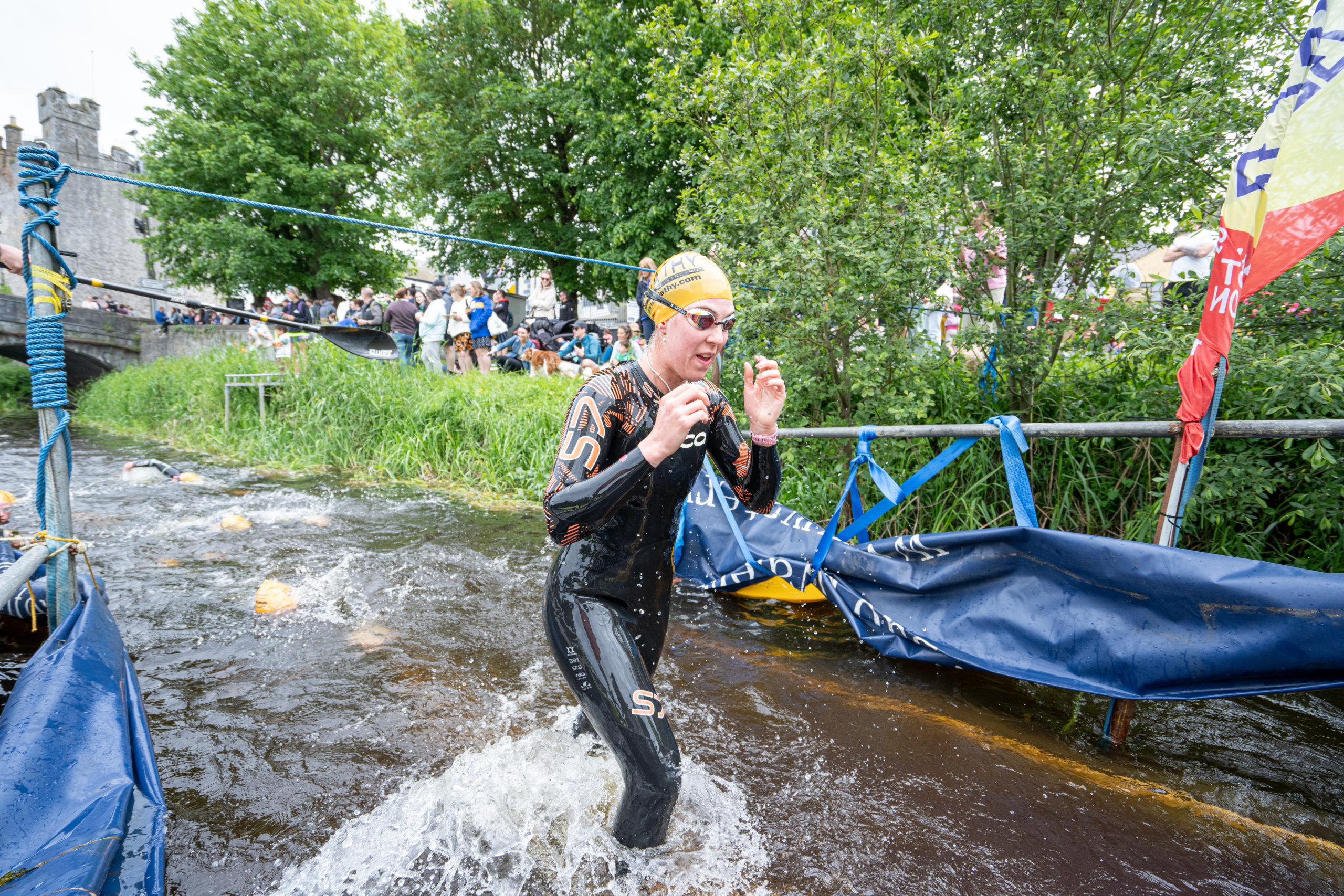 The race kicked off with a rolling start as the athletes entered the River Barrow in Athy. The initial 600 m was upstream against the current before the athletes took a single u-turn to swim the final 900 m downstream. In the Men’s race, Cory Fines completed the fastest swim in a time of 00:20:01. In the Women’s race, Esther Bayon had the leading time of 00:22:26.