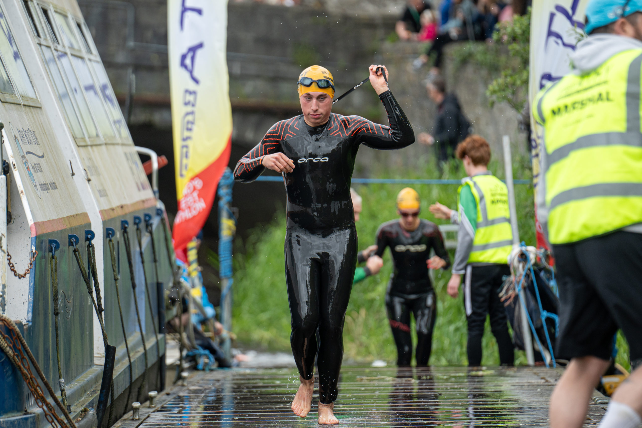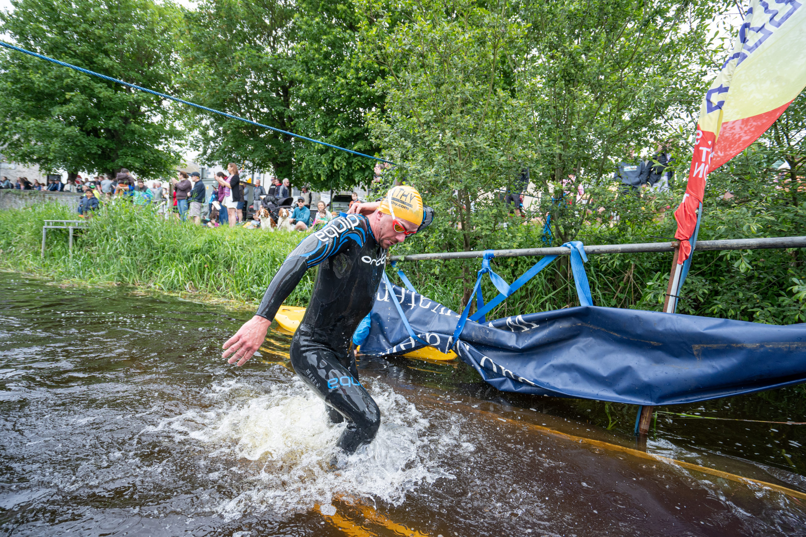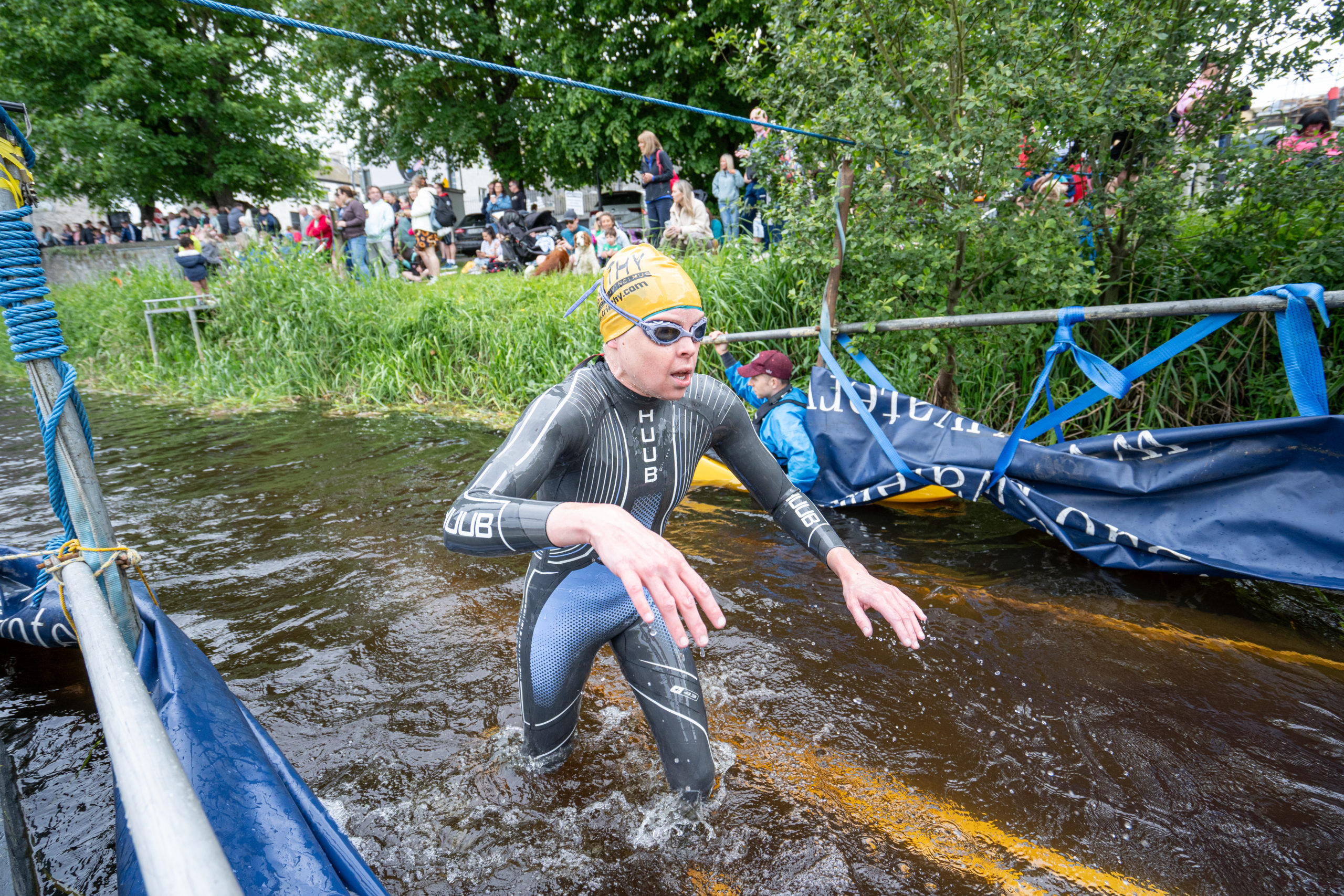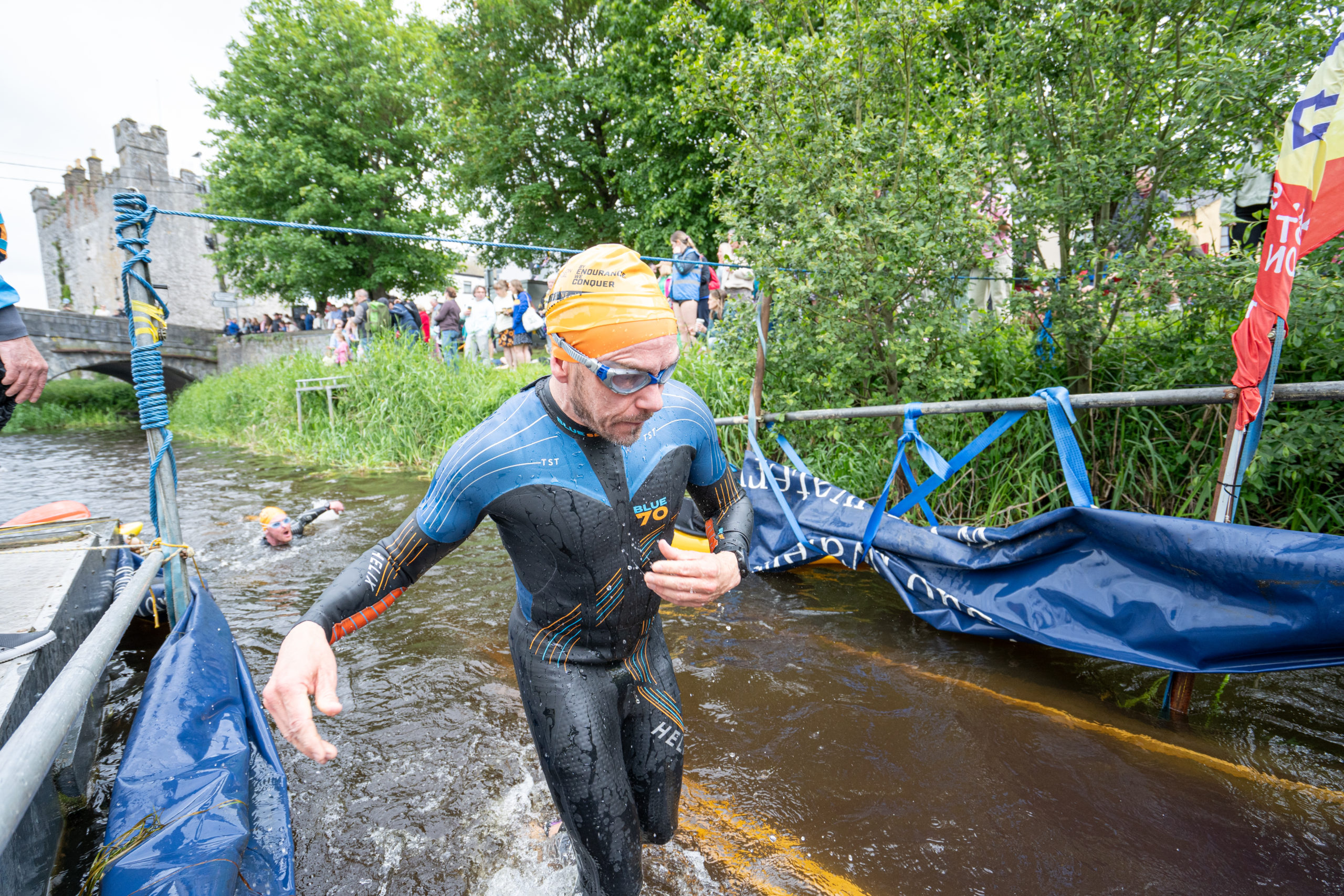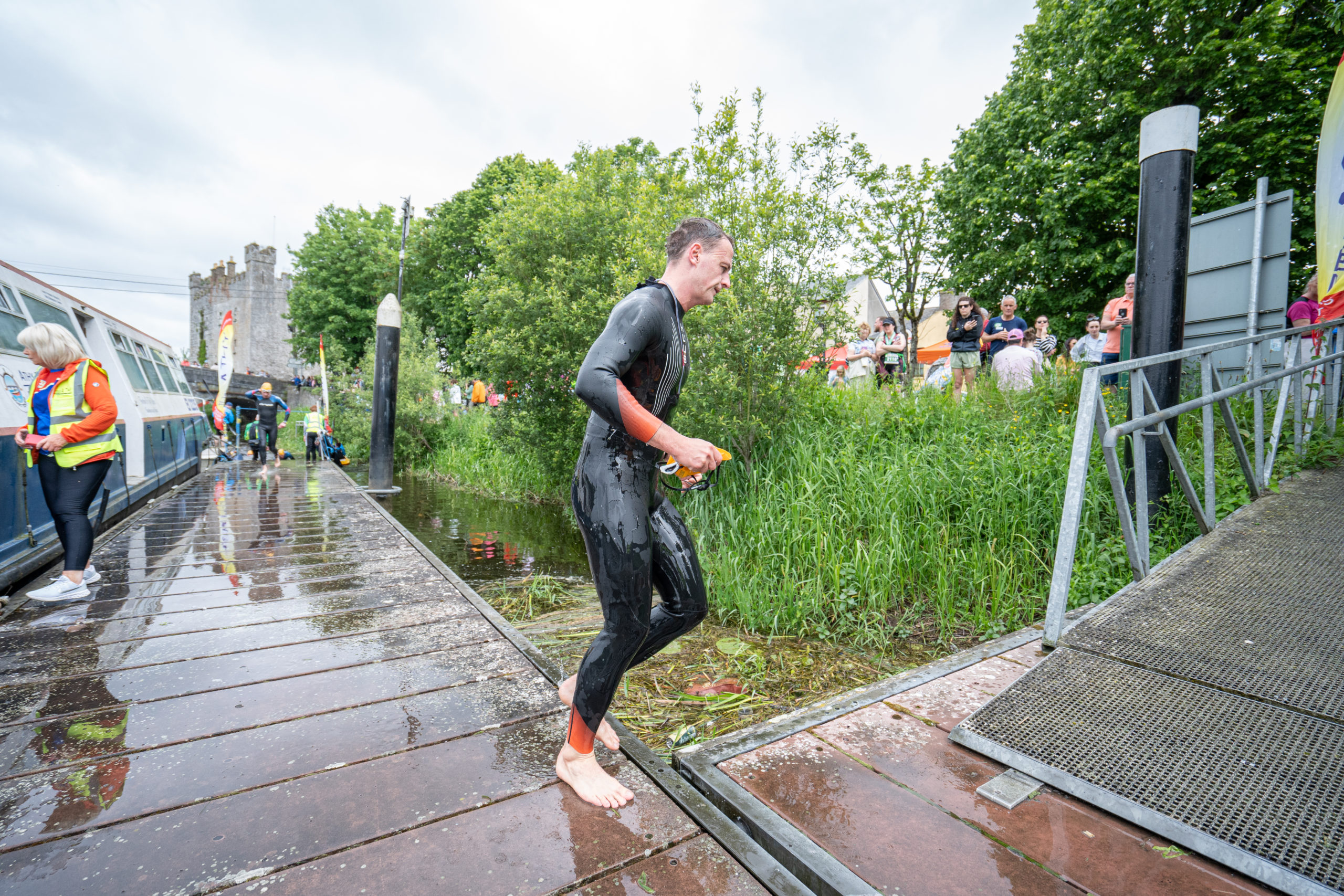 The race kicked off with a rolling start as the athletes entered the River Barrow in Athy. The initial 600 m was upstream against the current before the athletes took a single u-turn to swim the final 900 m downstream. In the Men’s race, Cory Fines completed the fastest swim in a time of 00:20:01. In the Women’s race, Esther Bayon had the leading time of 00:22:26.