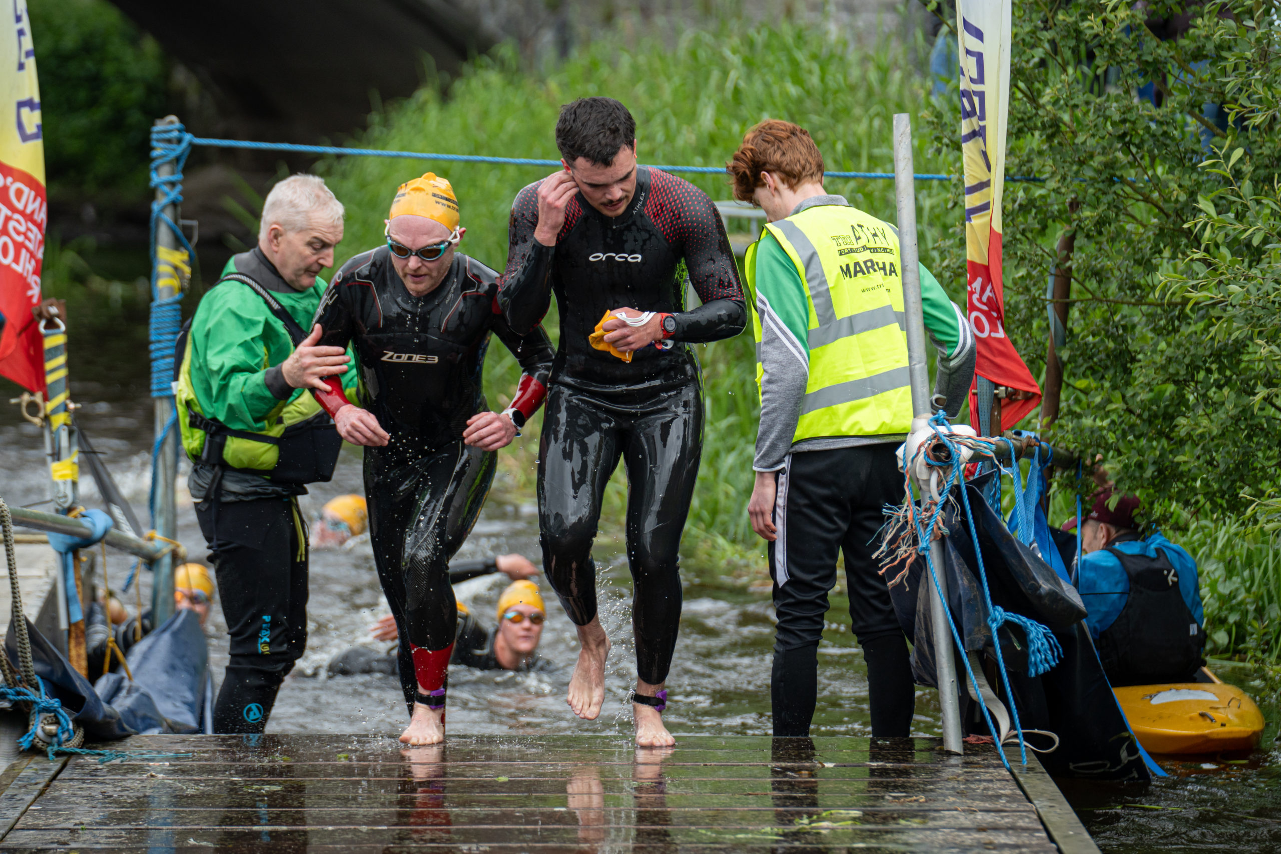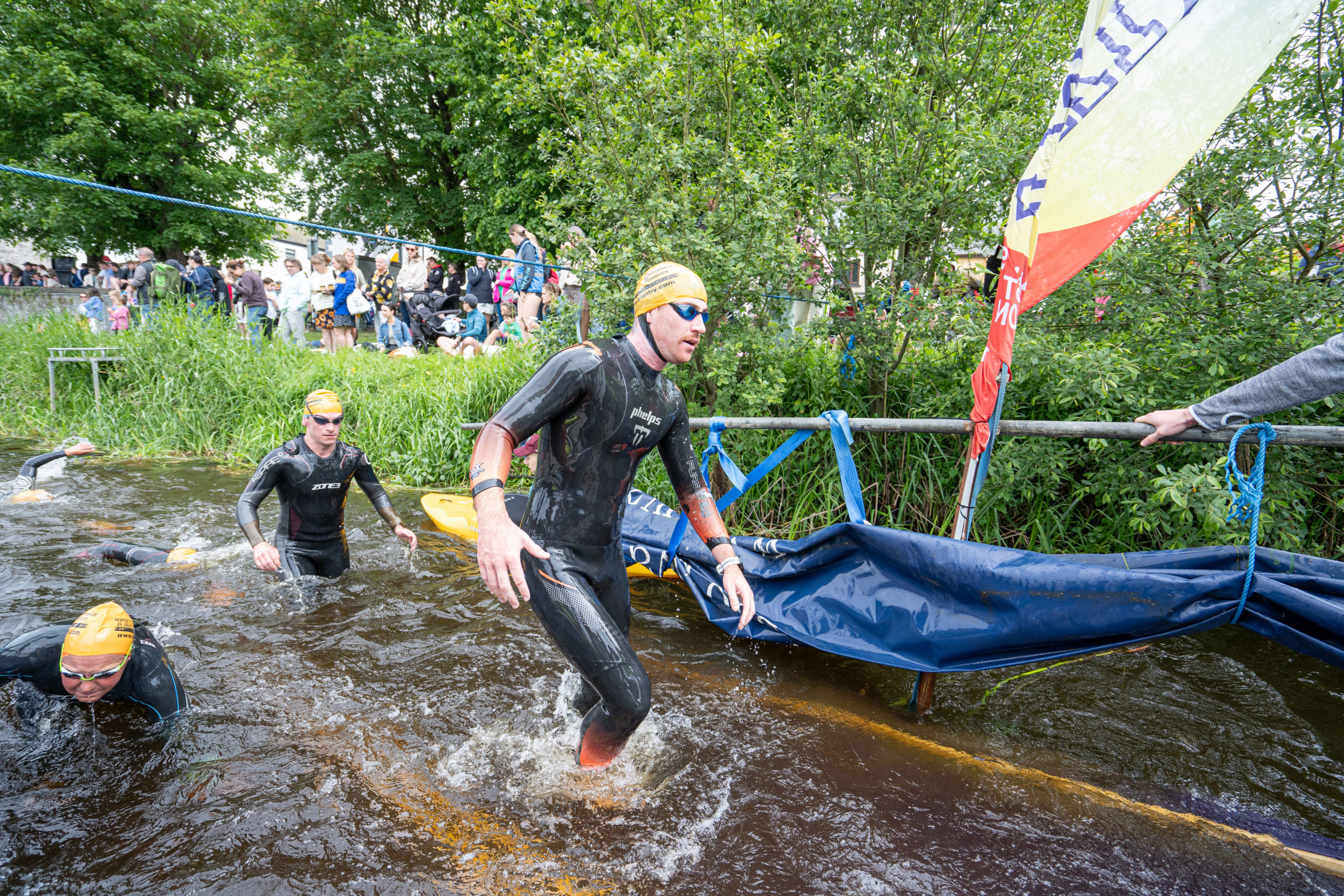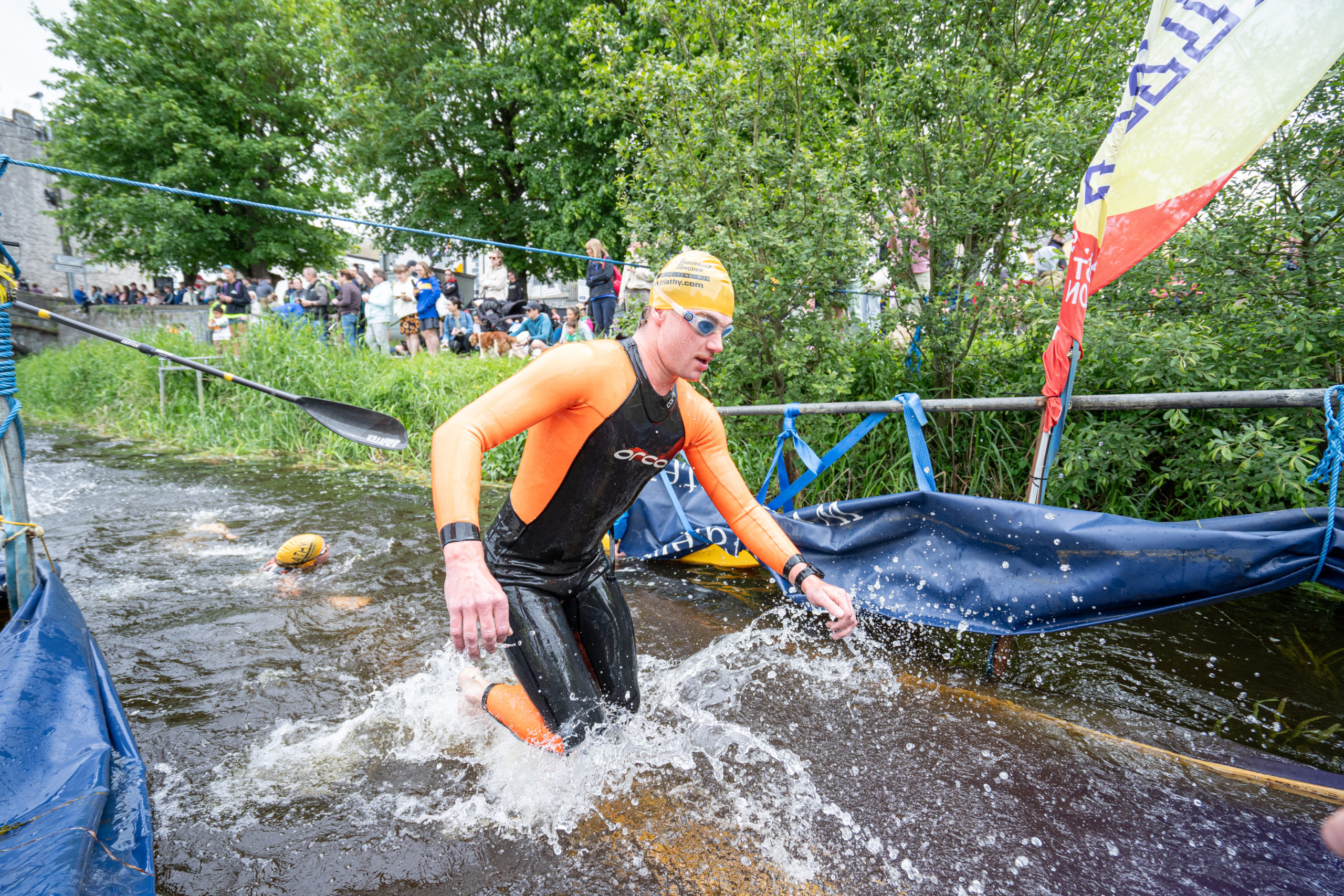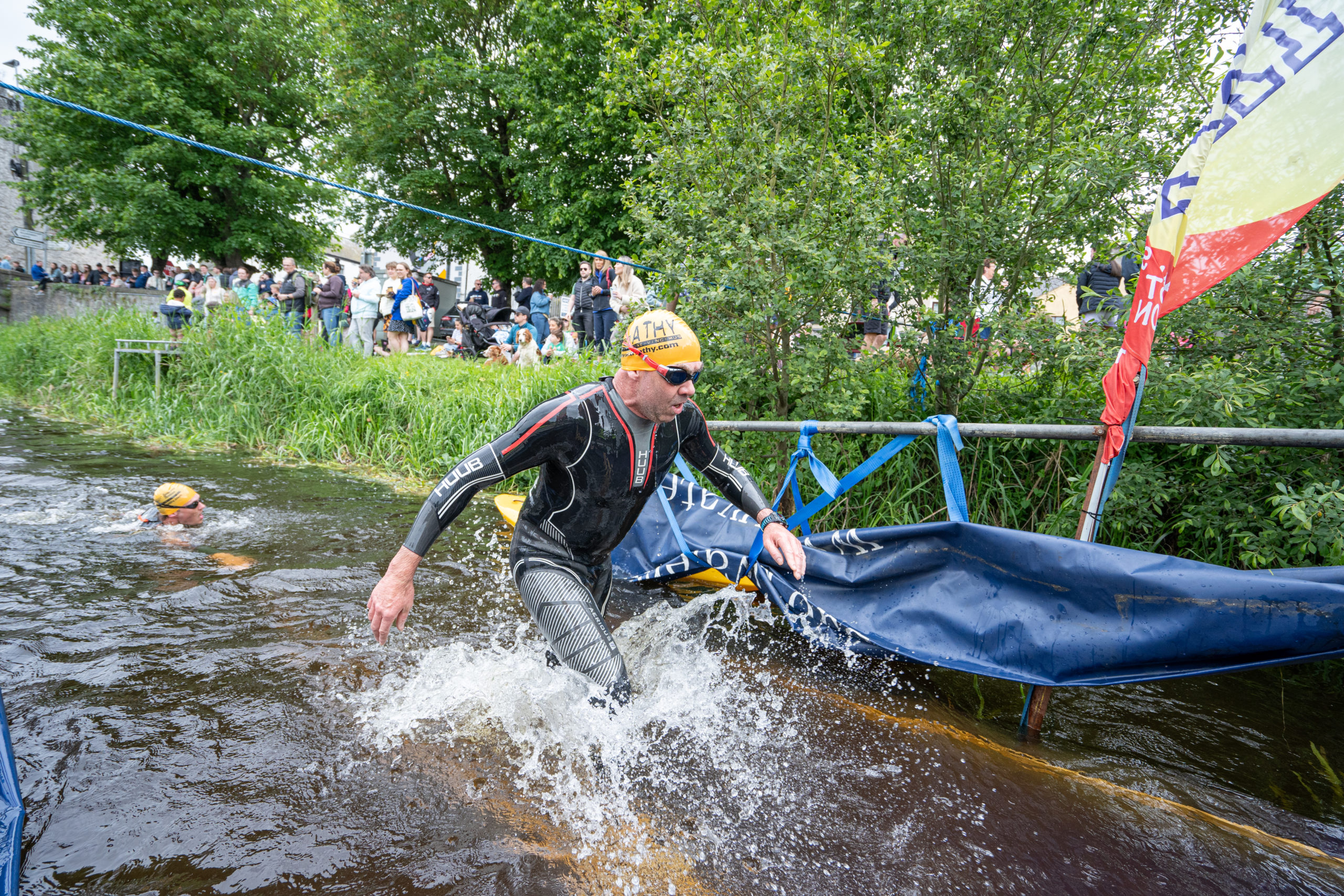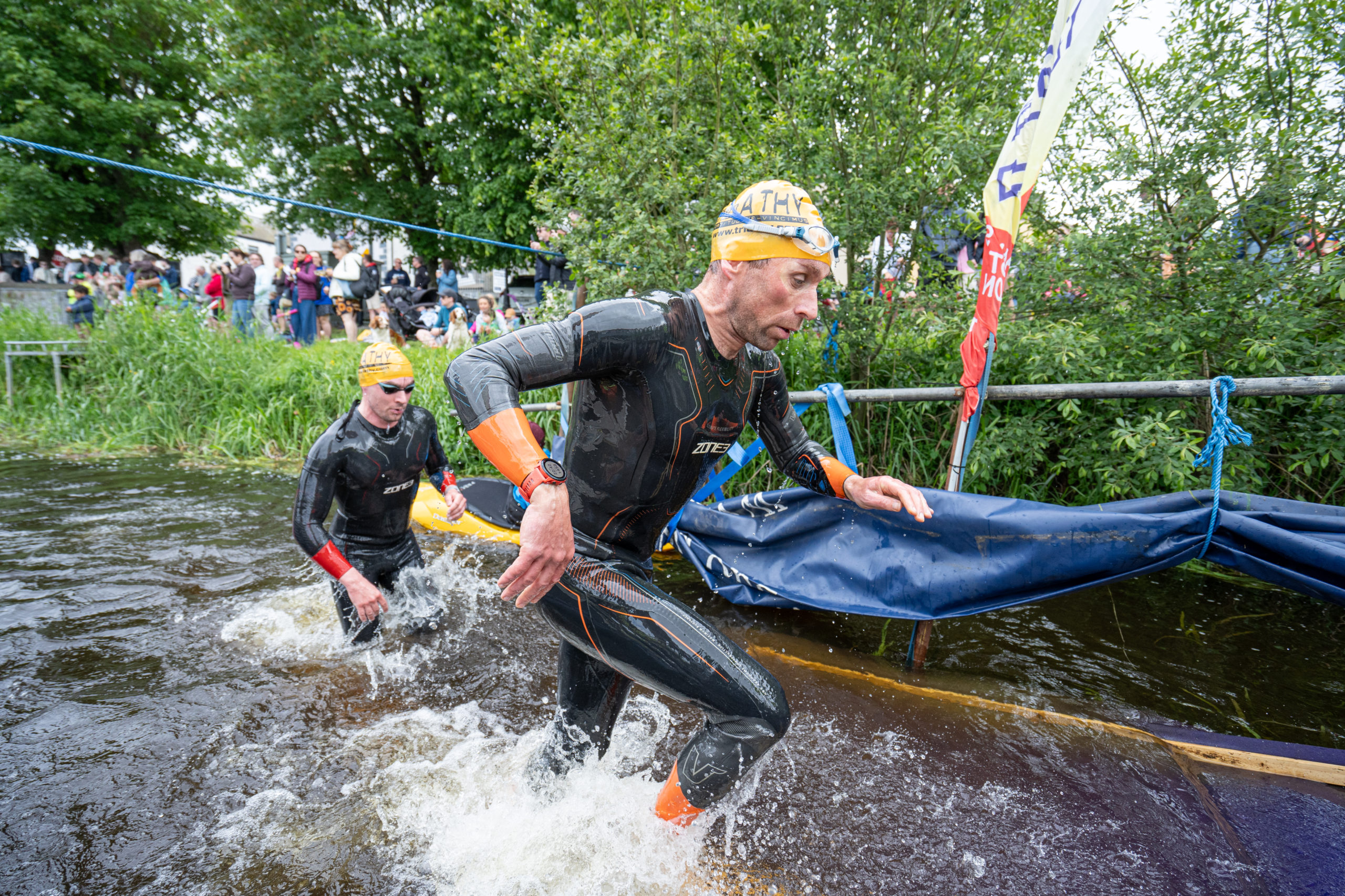 The race kicked off with a rolling start as the athletes entered the River Barrow in Athy. The initial 600 m was upstream against the current before the athletes took a single u-turn to swim the final 900 m downstream. In the Men’s race, Cory Fines completed the fastest swim in a time of 00:20:01. In the Women’s race, Esther Bayon had the leading time of 00:22:26.