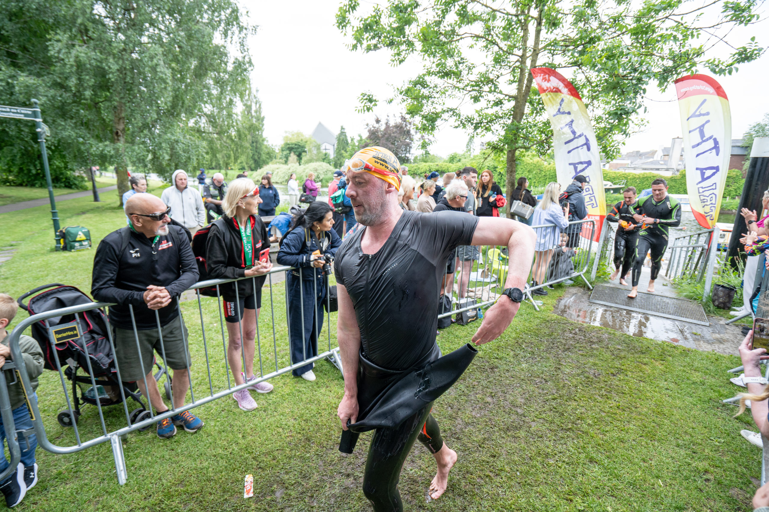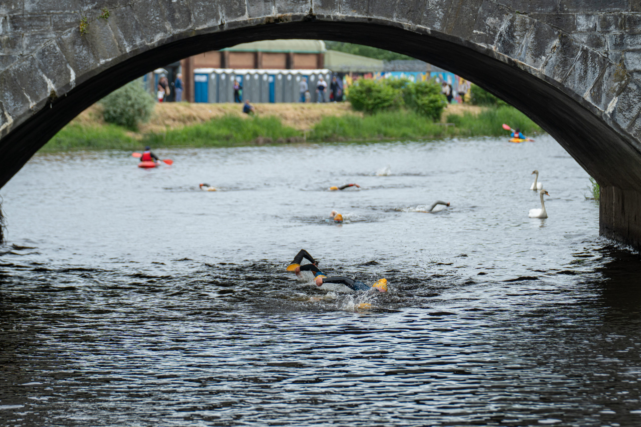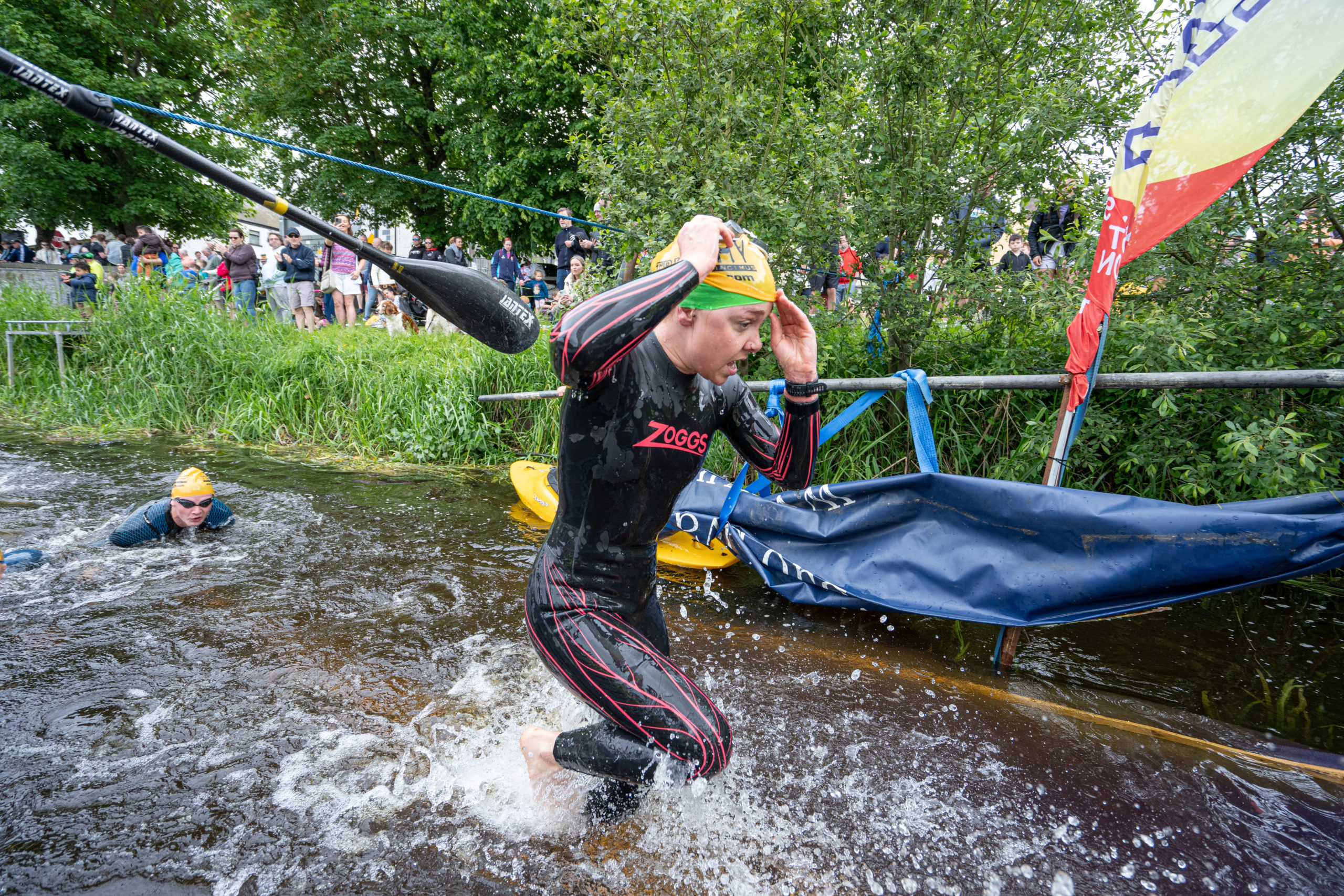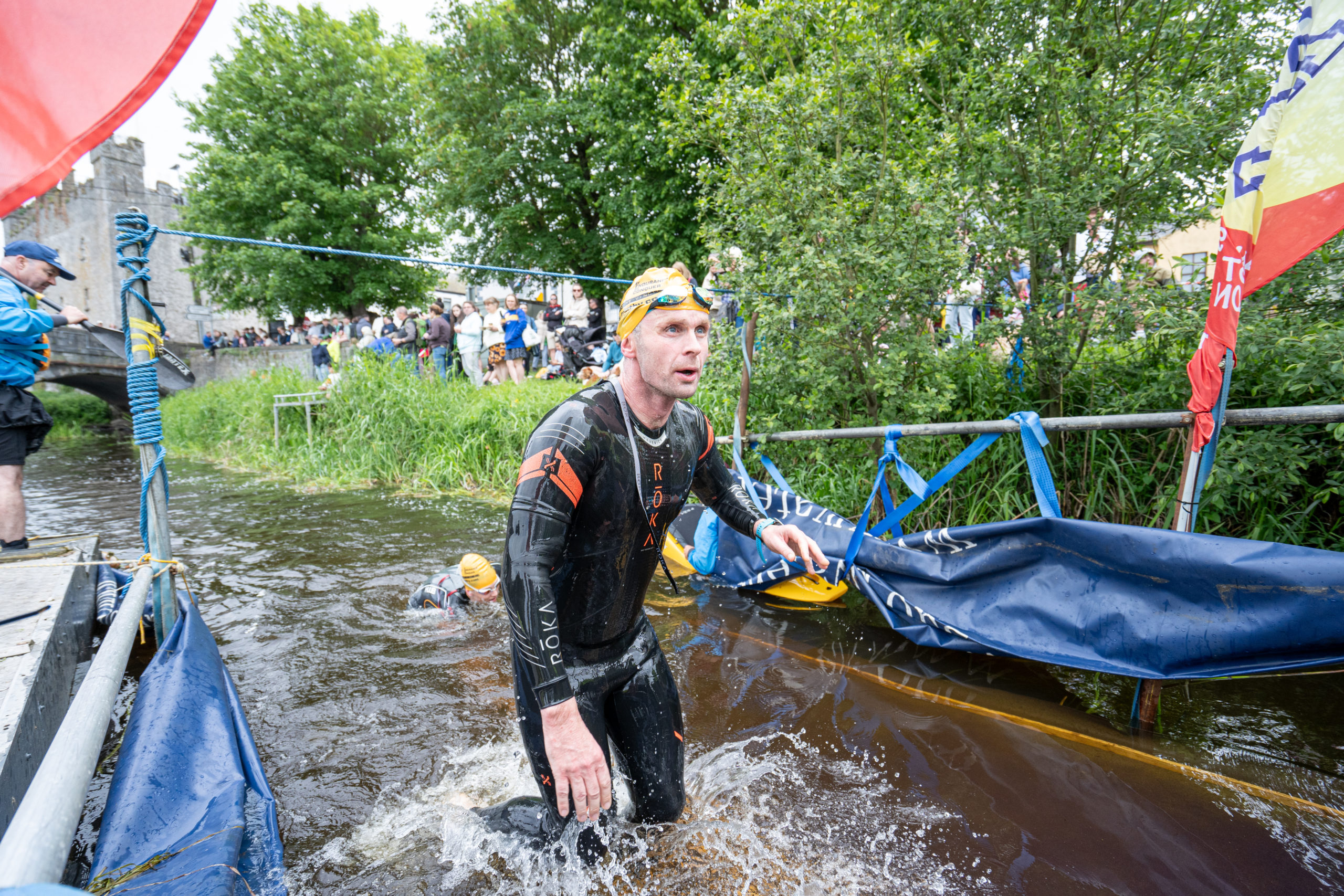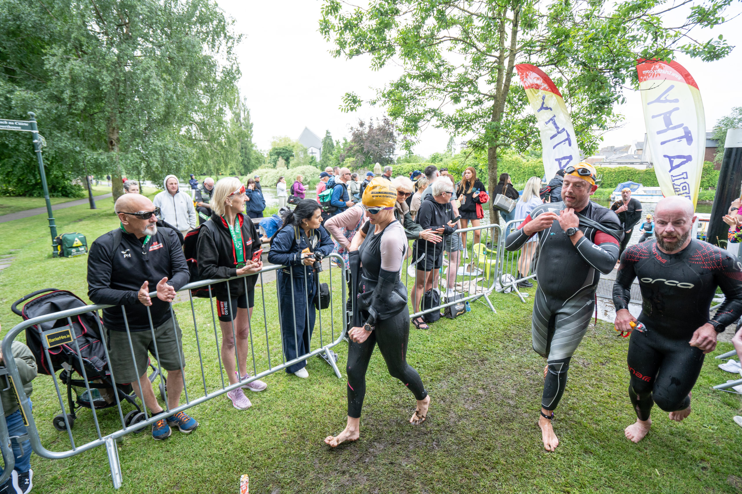 The race kicked off with a rolling start as the athletes entered the River Barrow in Athy. The initial 600 m was upstream against the current before the athletes took a single u-turn to swim the final 900 m downstream. In the Men’s race, Cory Fines completed the fastest swim in a time of 00:20:01. In the Women’s race, Esther Bayon had the leading time of 00:22:26.