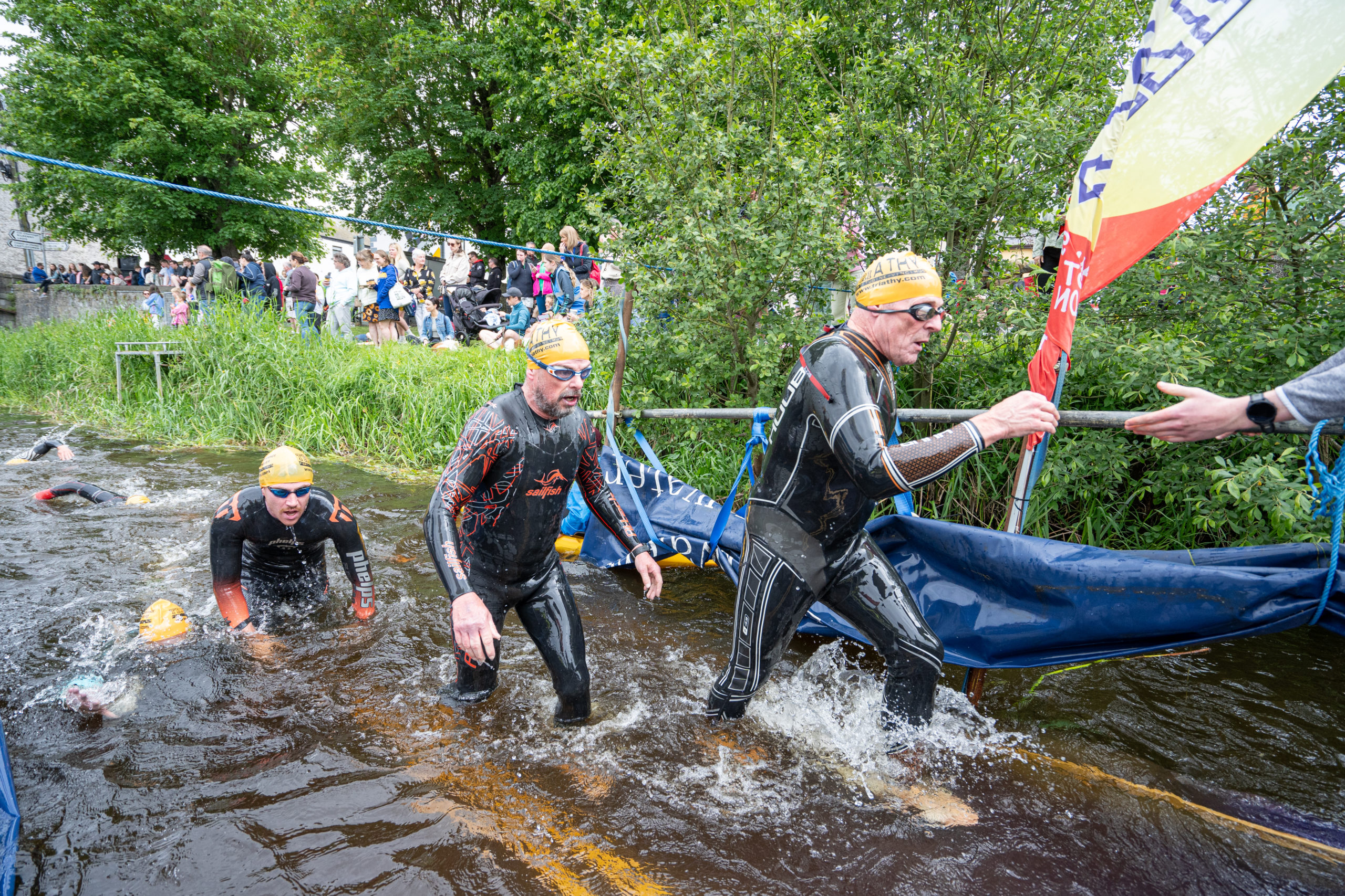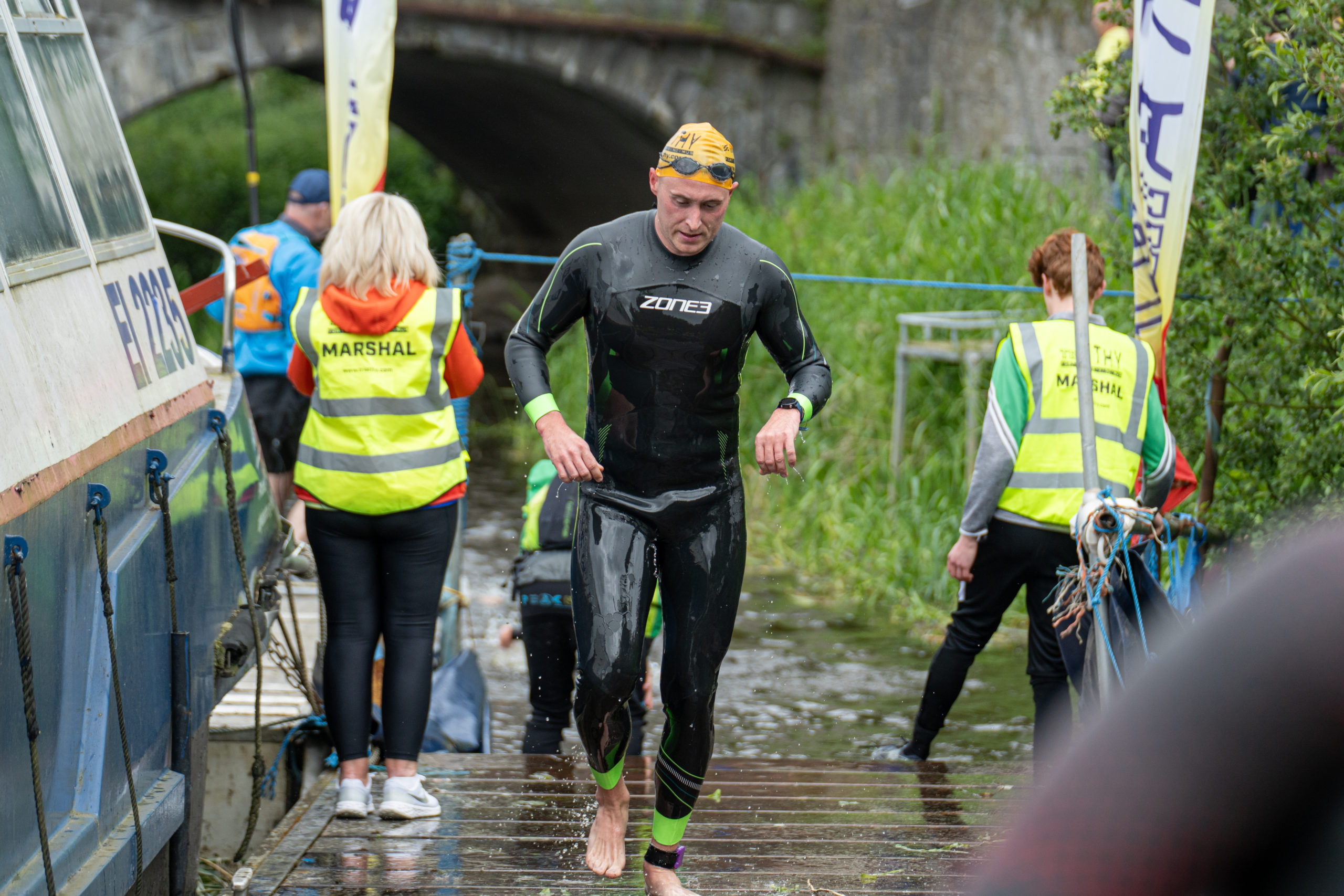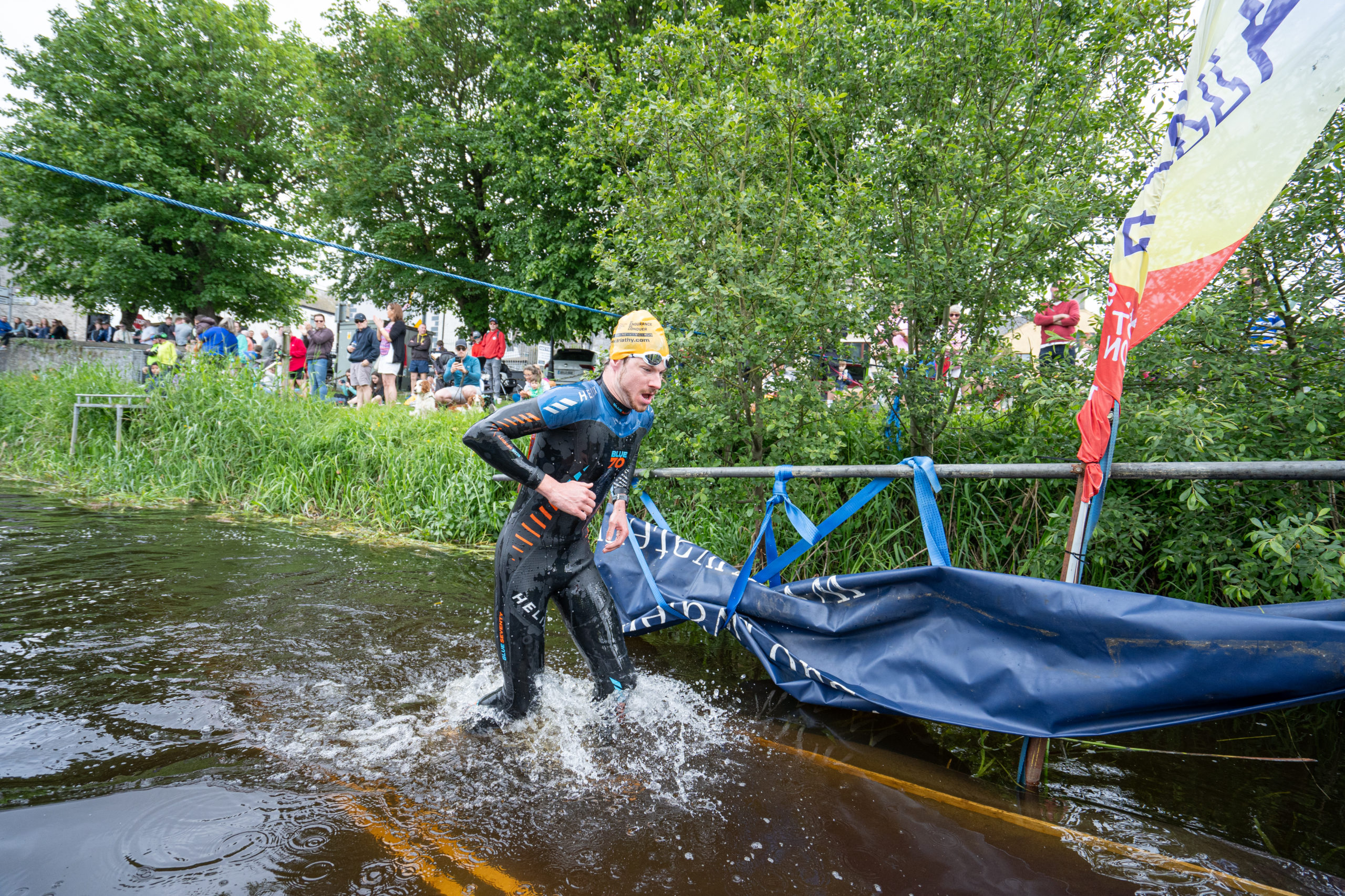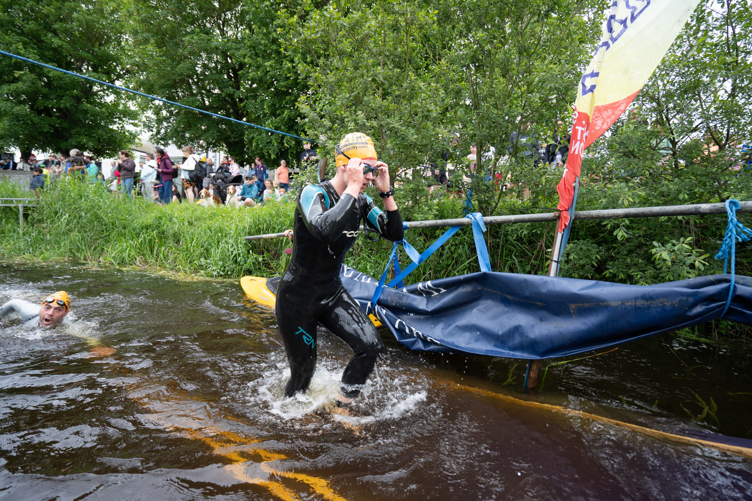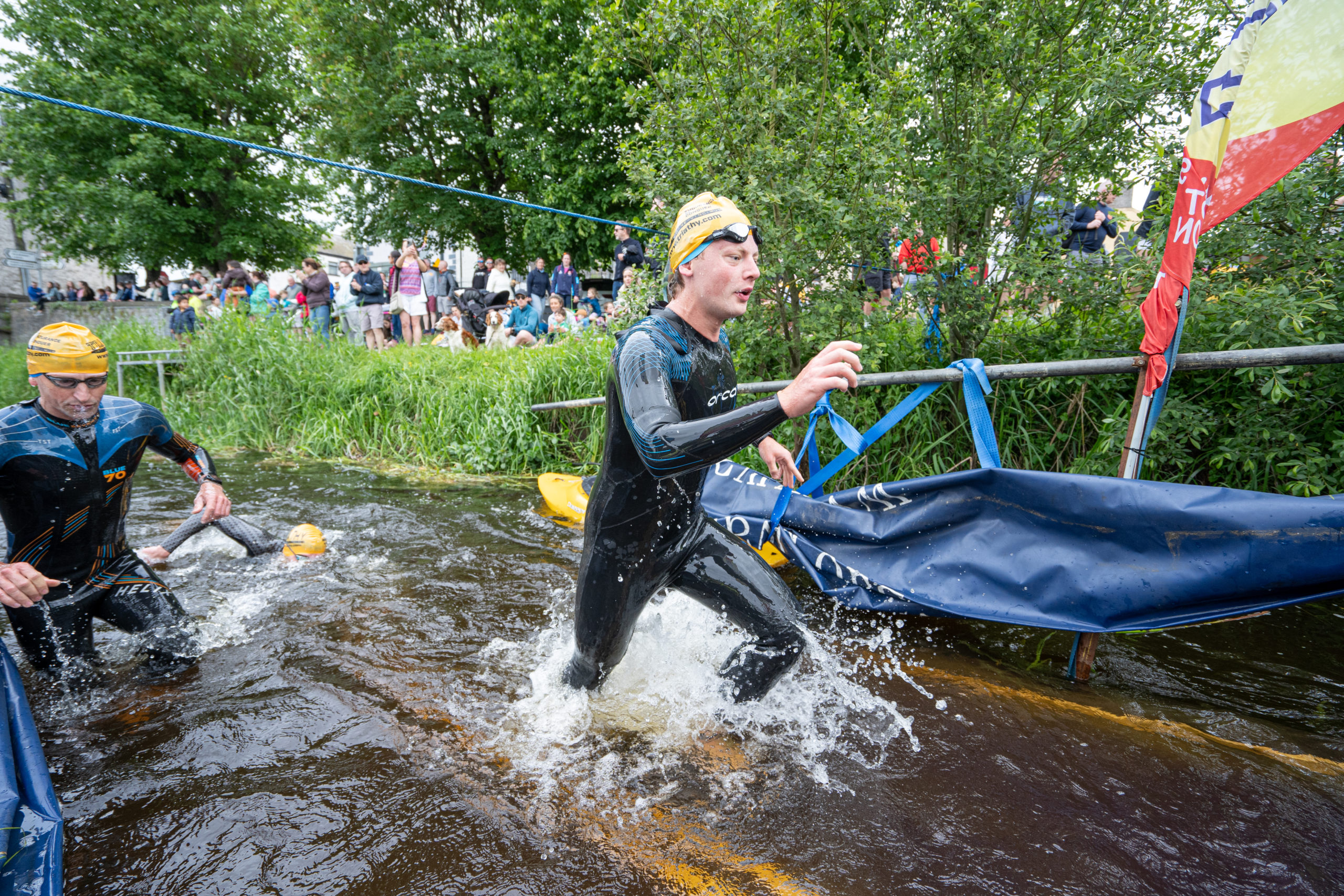 The race kicked off with a rolling start as the athletes entered the River Barrow in Athy. The initial 600 m was upstream against the current before the athletes took a single u-turn to swim the final 900 m downstream. In the Men’s race, Cory Fines completed the fastest swim in a time of 00:20:01. In the Women’s race, Esther Bayon had the leading time of 00:22:26.