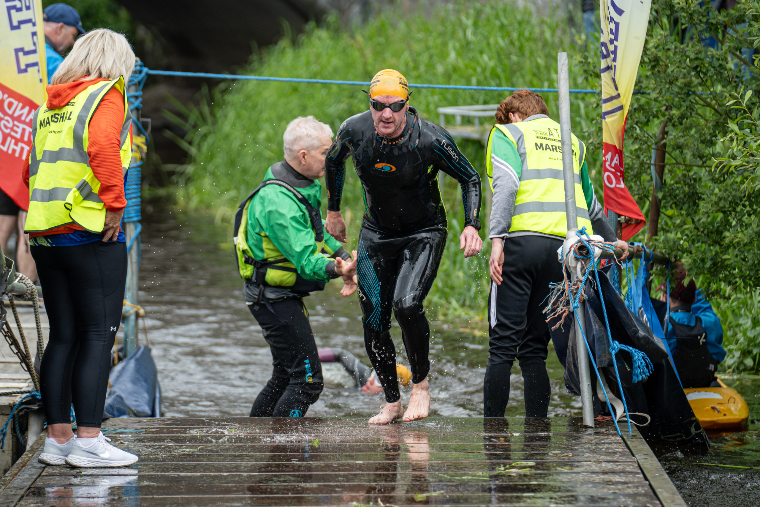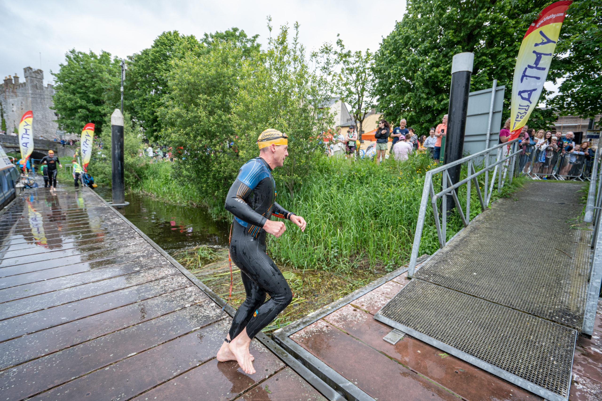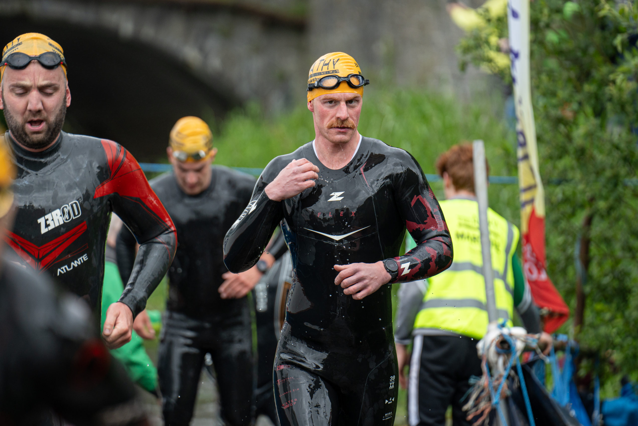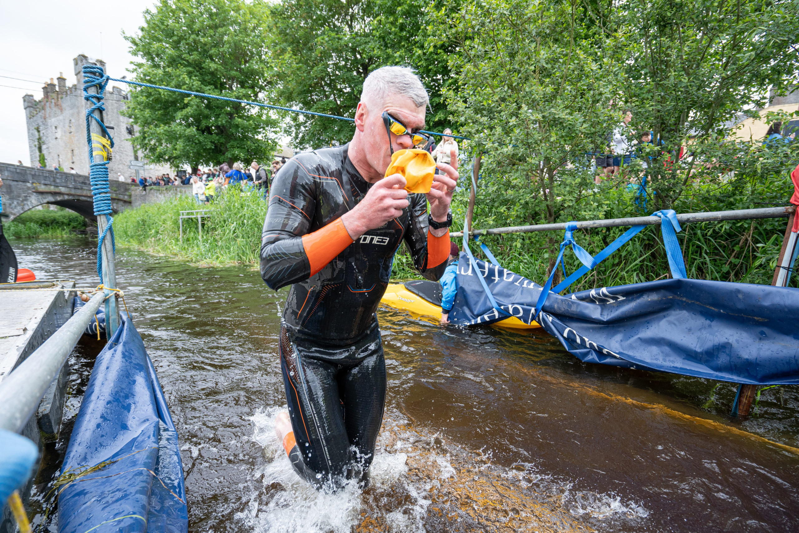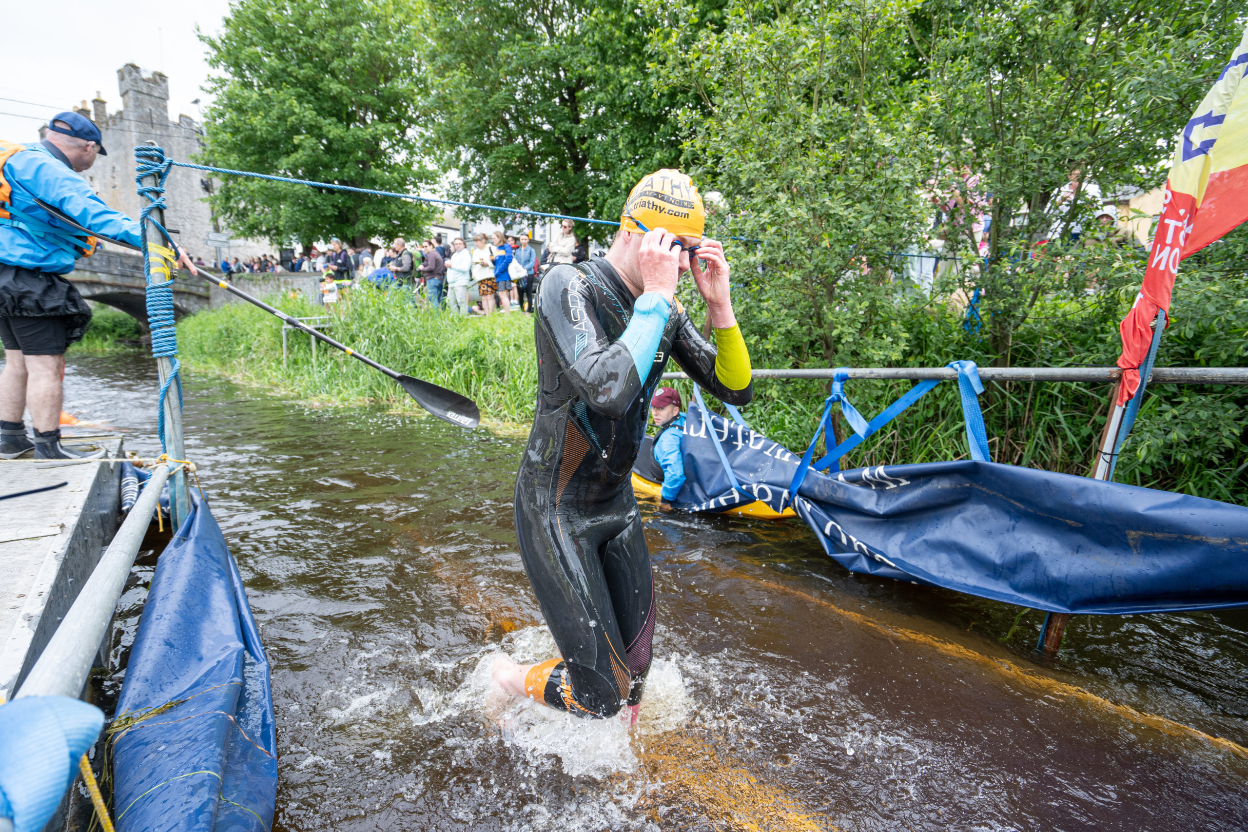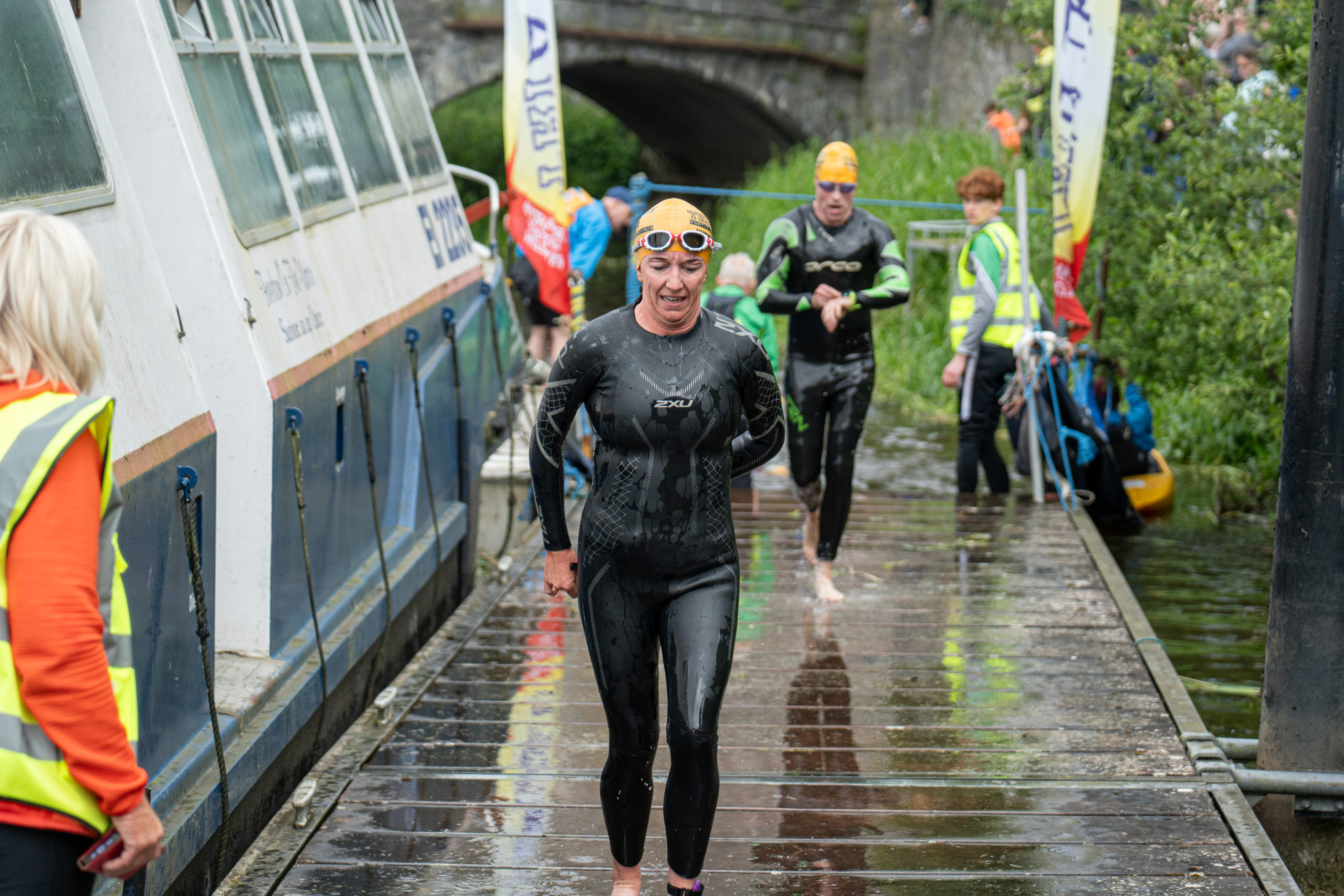 The race kicked off with a rolling start as the athletes entered the River Barrow in Athy. The initial 600 m was upstream against the current before the athletes took a single u-turn to swim the final 900 m downstream. In the Men’s race, Cory Fines completed the fastest swim in a time of 00:20:01. In the Women’s race, Esther Bayon had the leading time of 00:22:26.