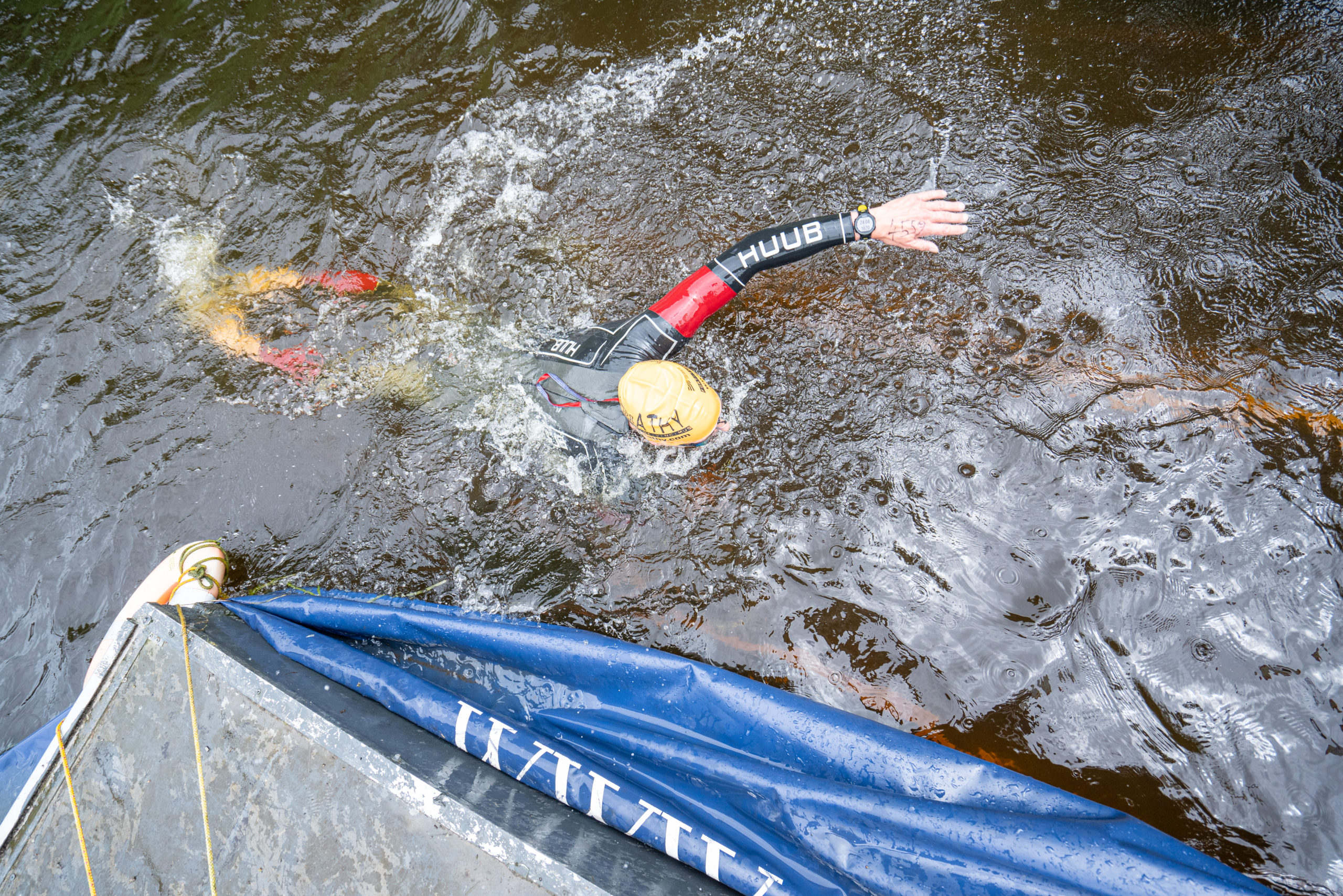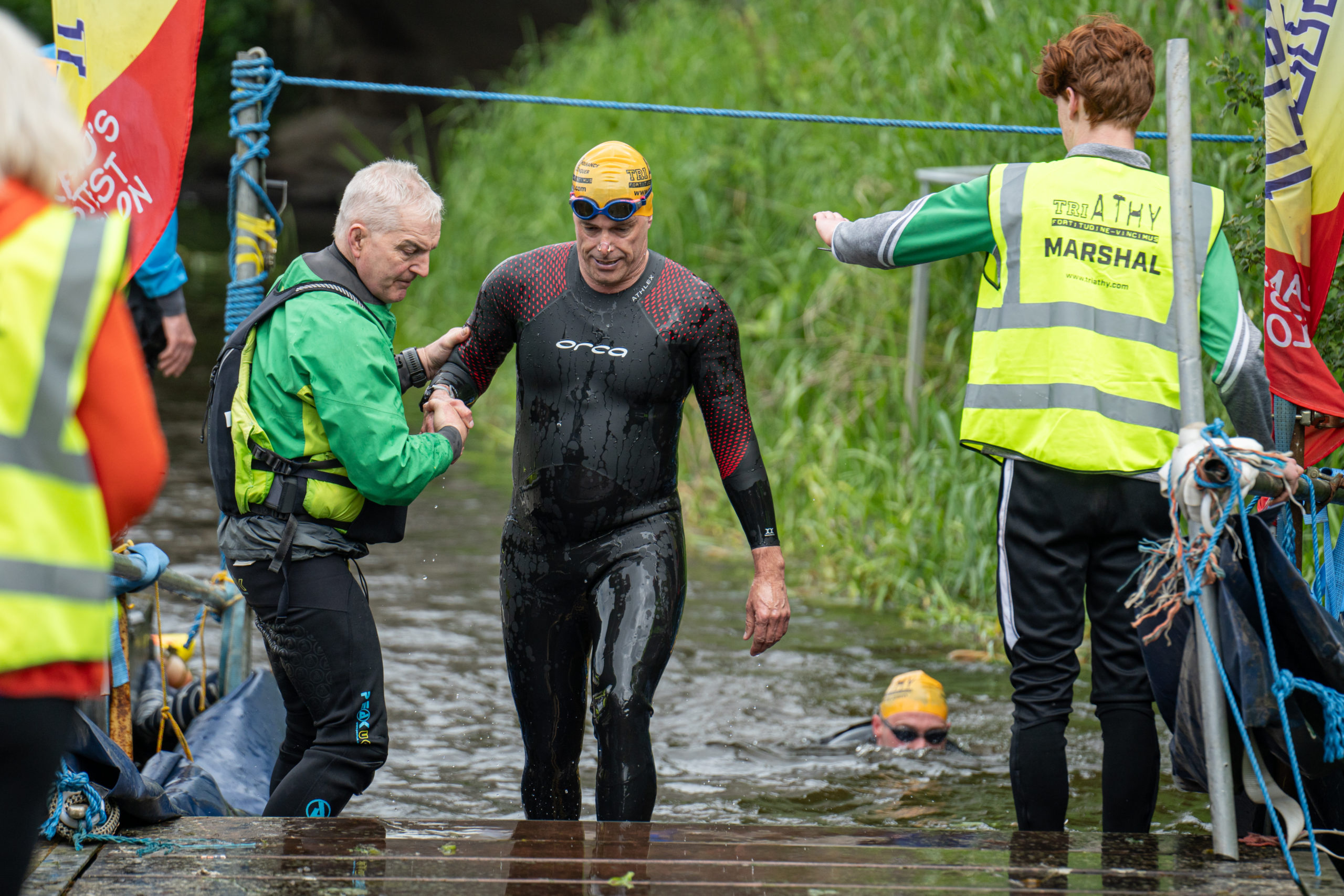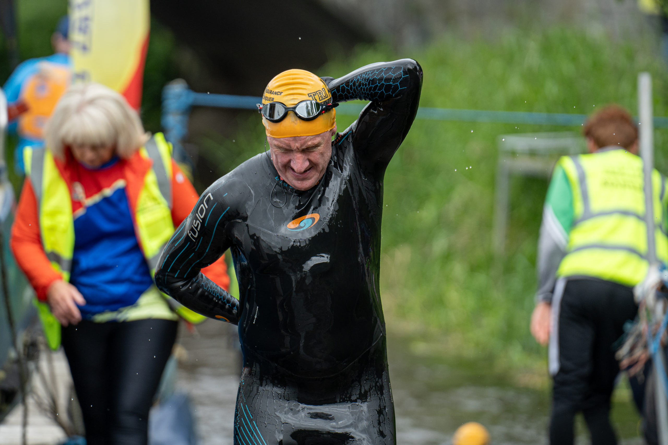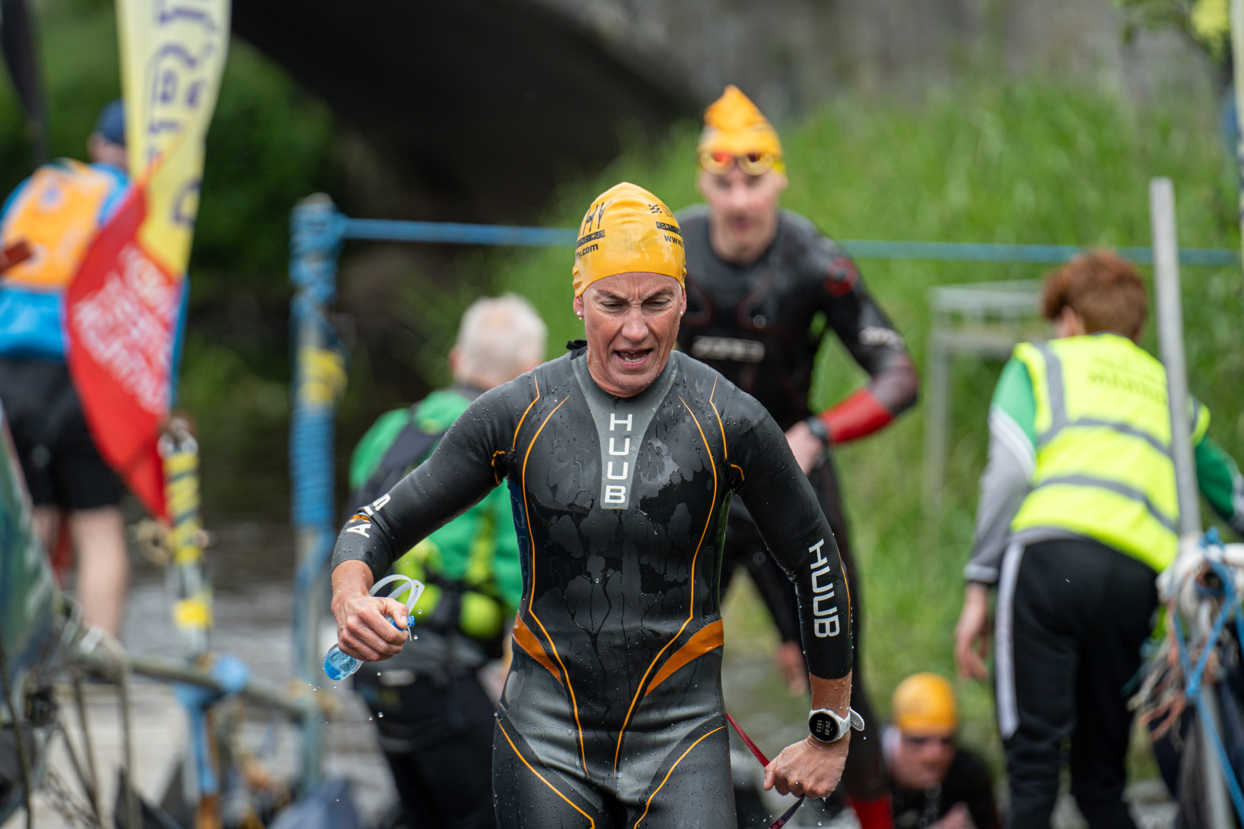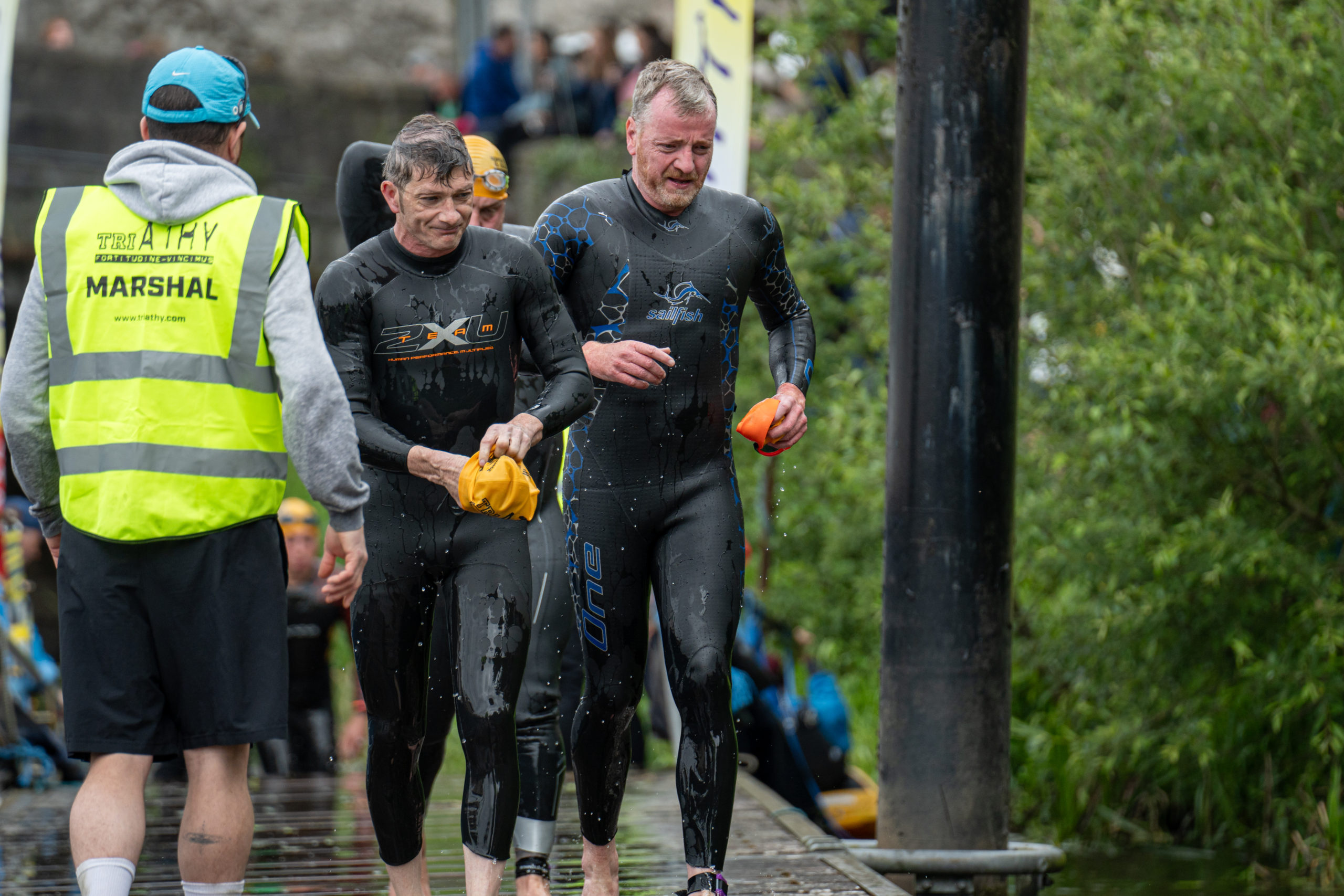 The race kicked off with a rolling start as the athletes entered the River Barrow in Athy. The initial 600 m was upstream against the current before the athletes took a single u-turn to swim the final 900 m downstream. In the Men’s race, Cory Fines completed the fastest swim in a time of 00:20:01. In the Women’s race, Esther Bayon had the leading time of 00:22:26.