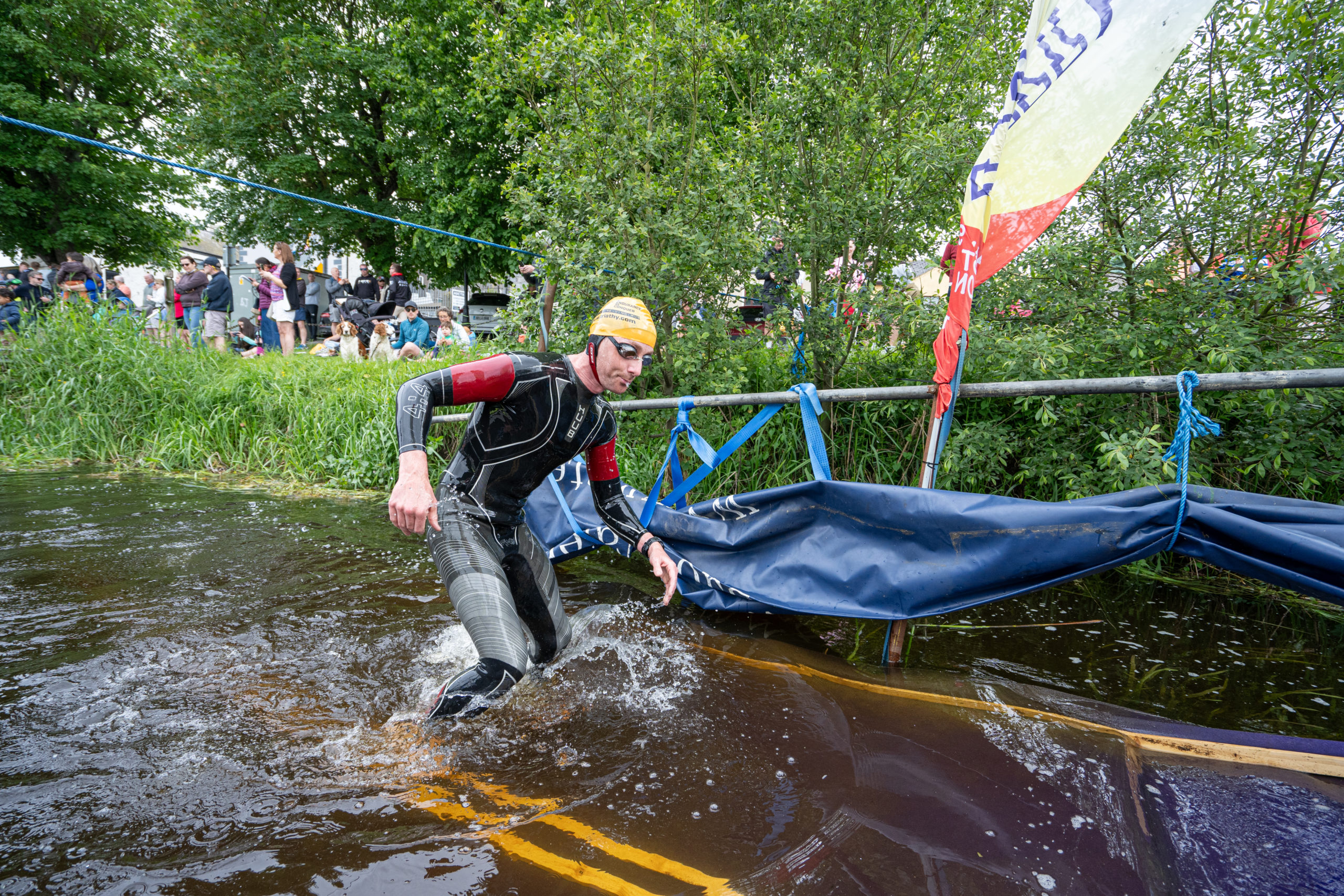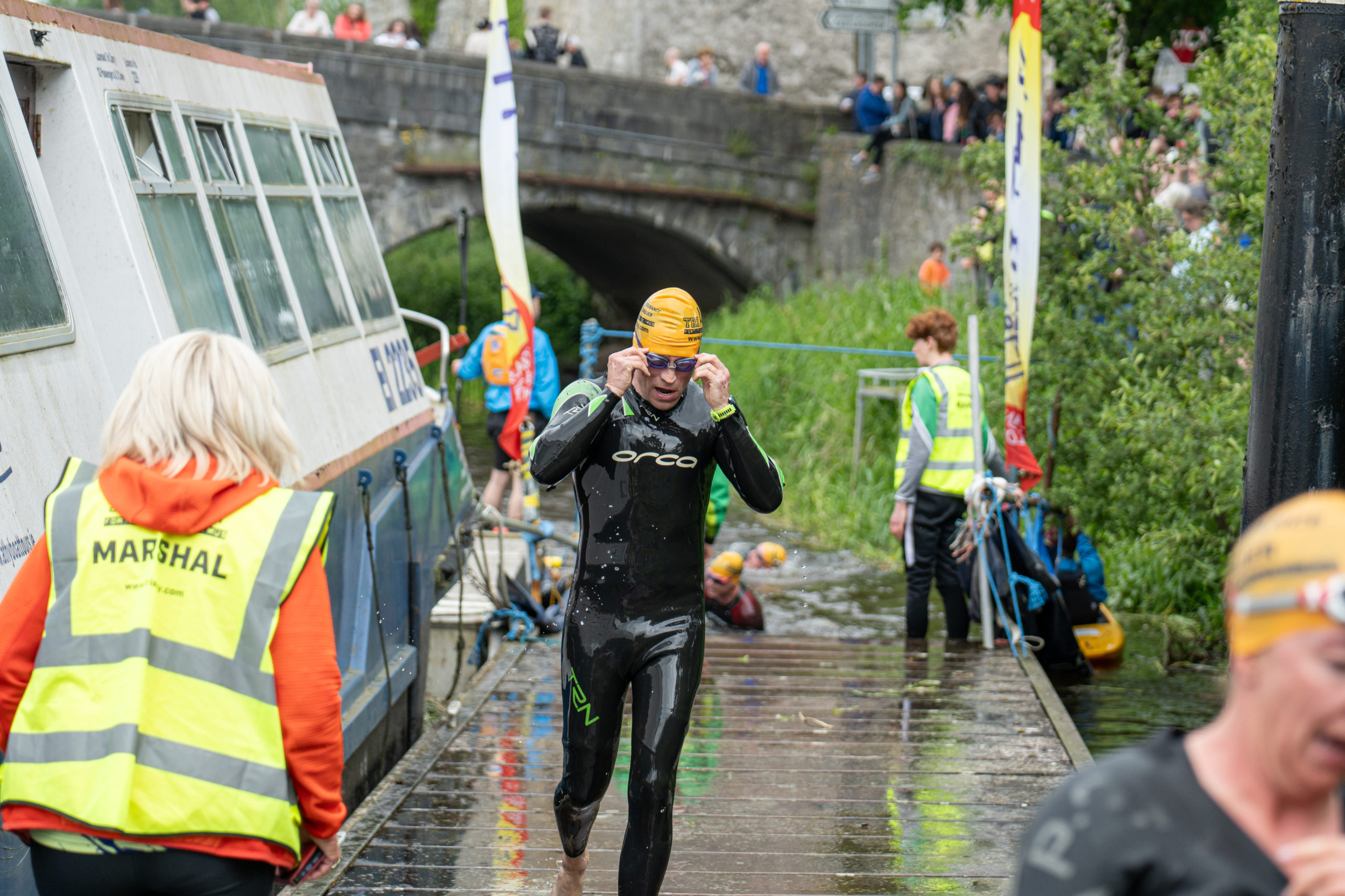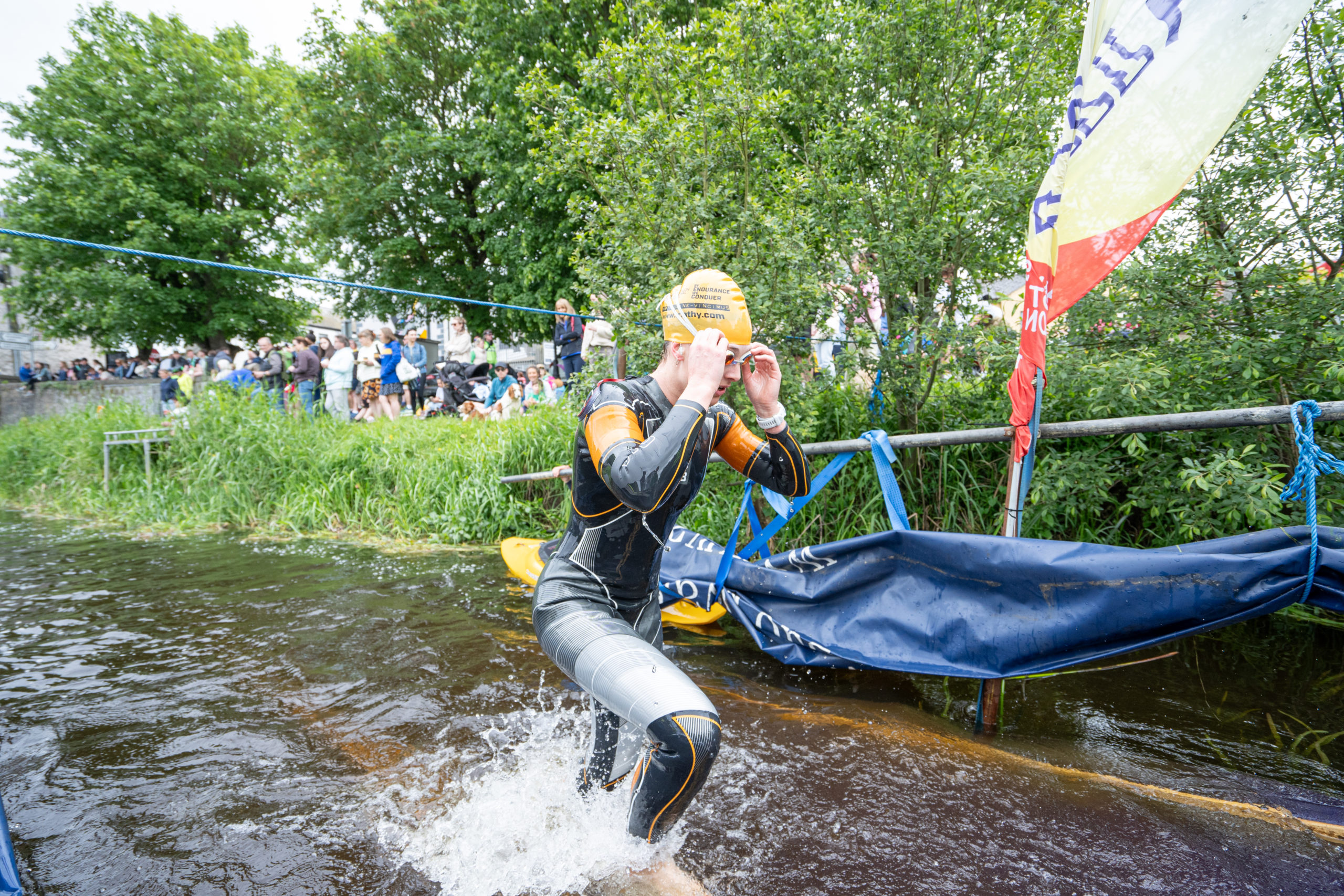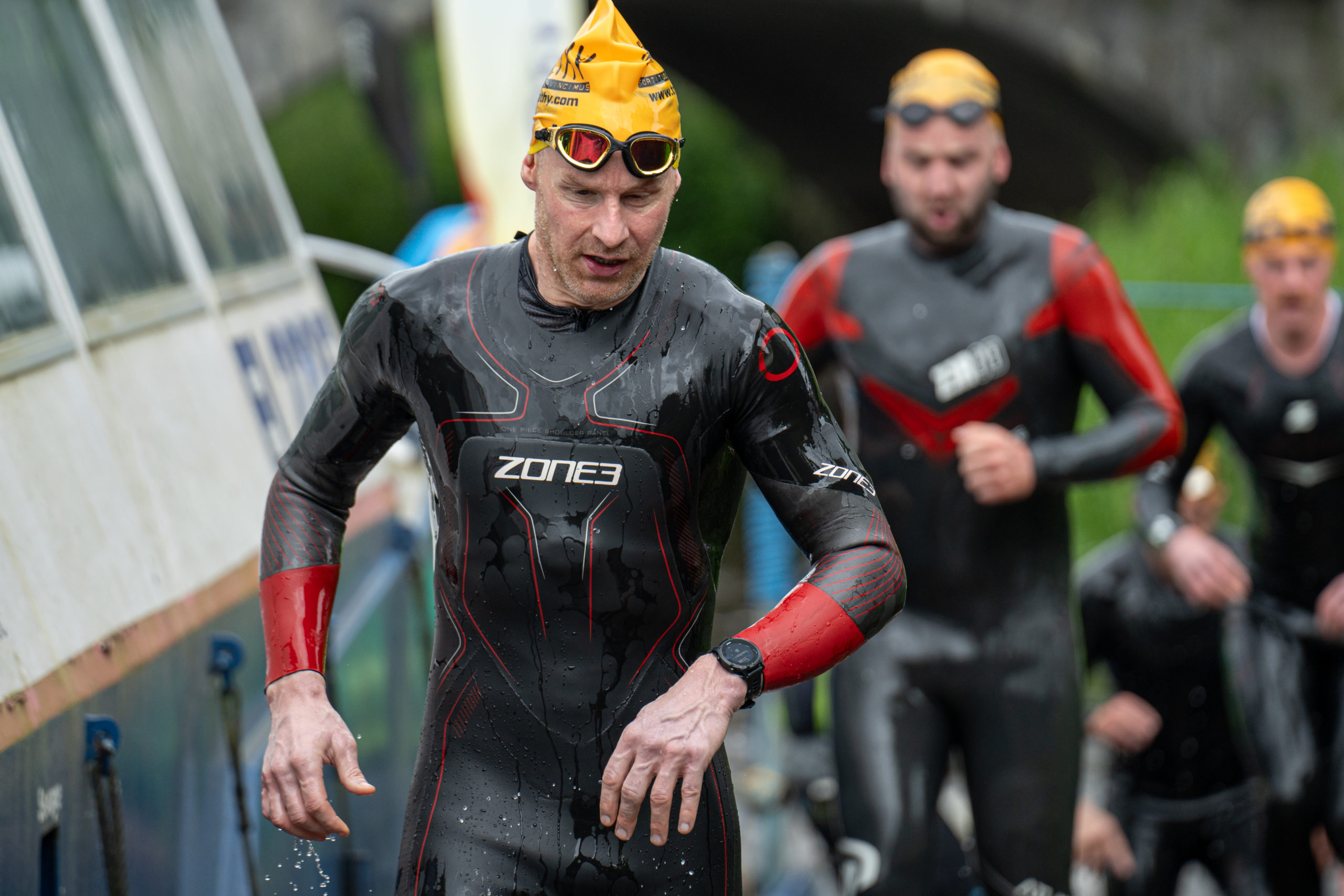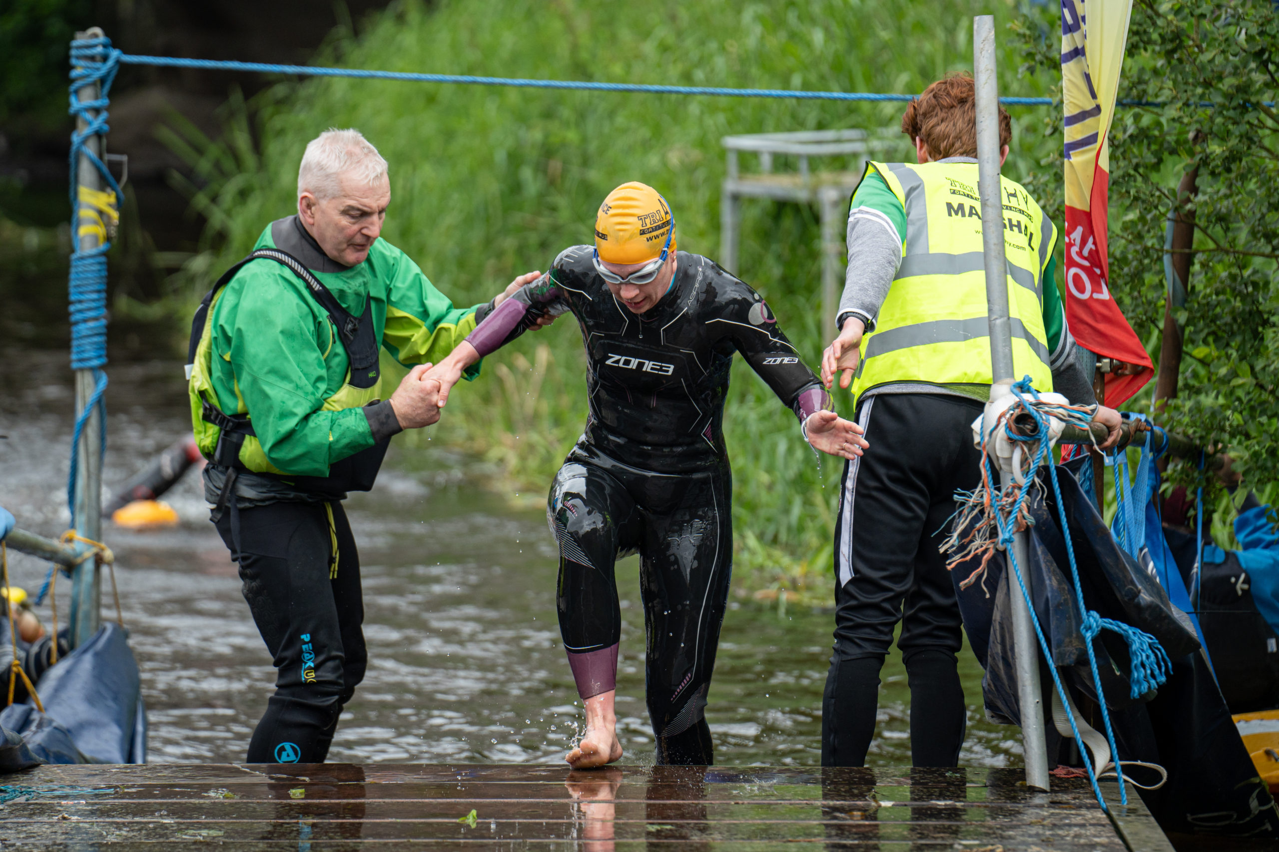 The race kicked off with a rolling start as the athletes entered the River Barrow in Athy. The initial 600 m was upstream against the current before the athletes took a single u-turn to swim the final 900 m downstream. In the Men’s race, Cory Fines completed the fastest swim in a time of 00:20:01. In the Women’s race, Esther Bayon had the leading time of 00:22:26.