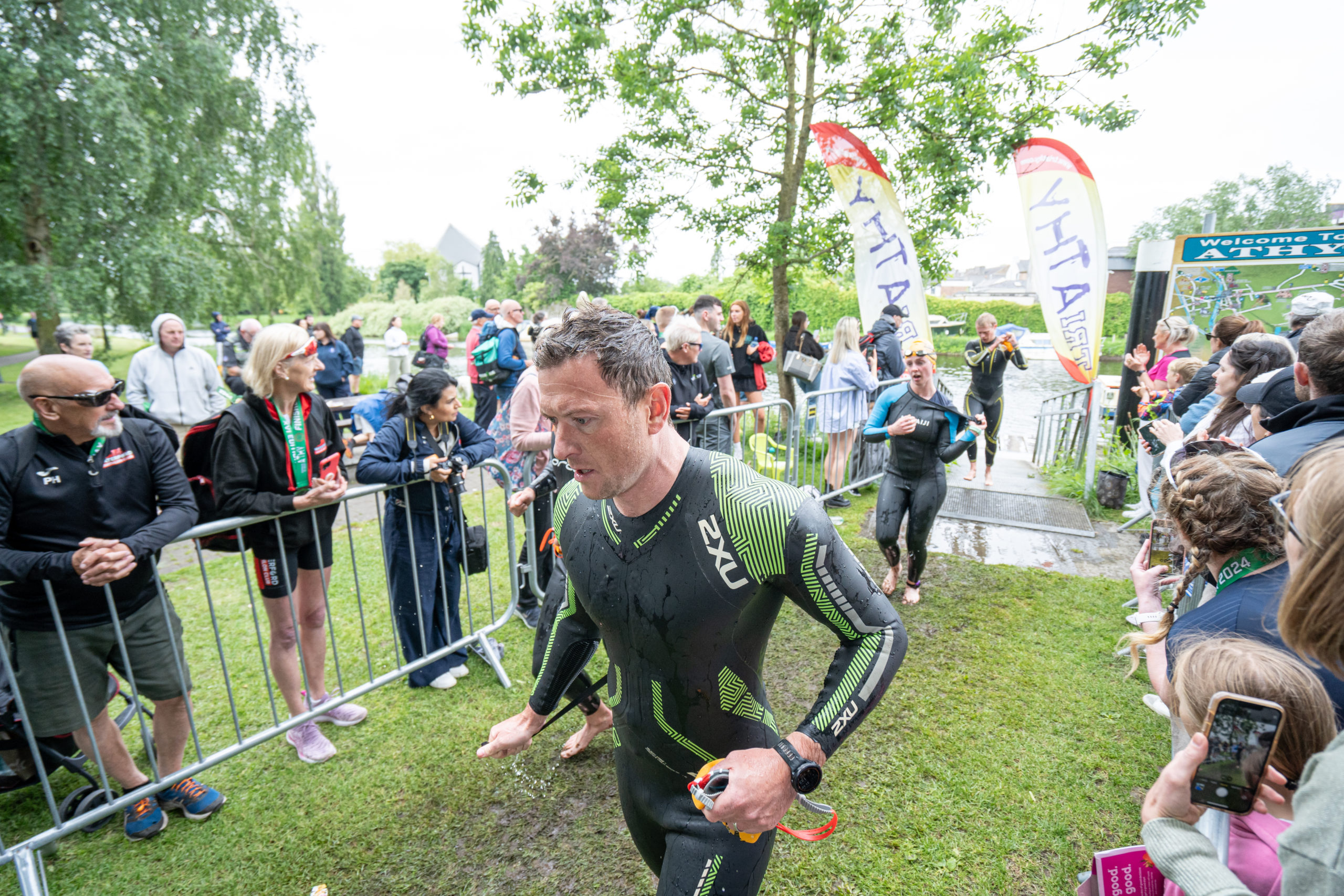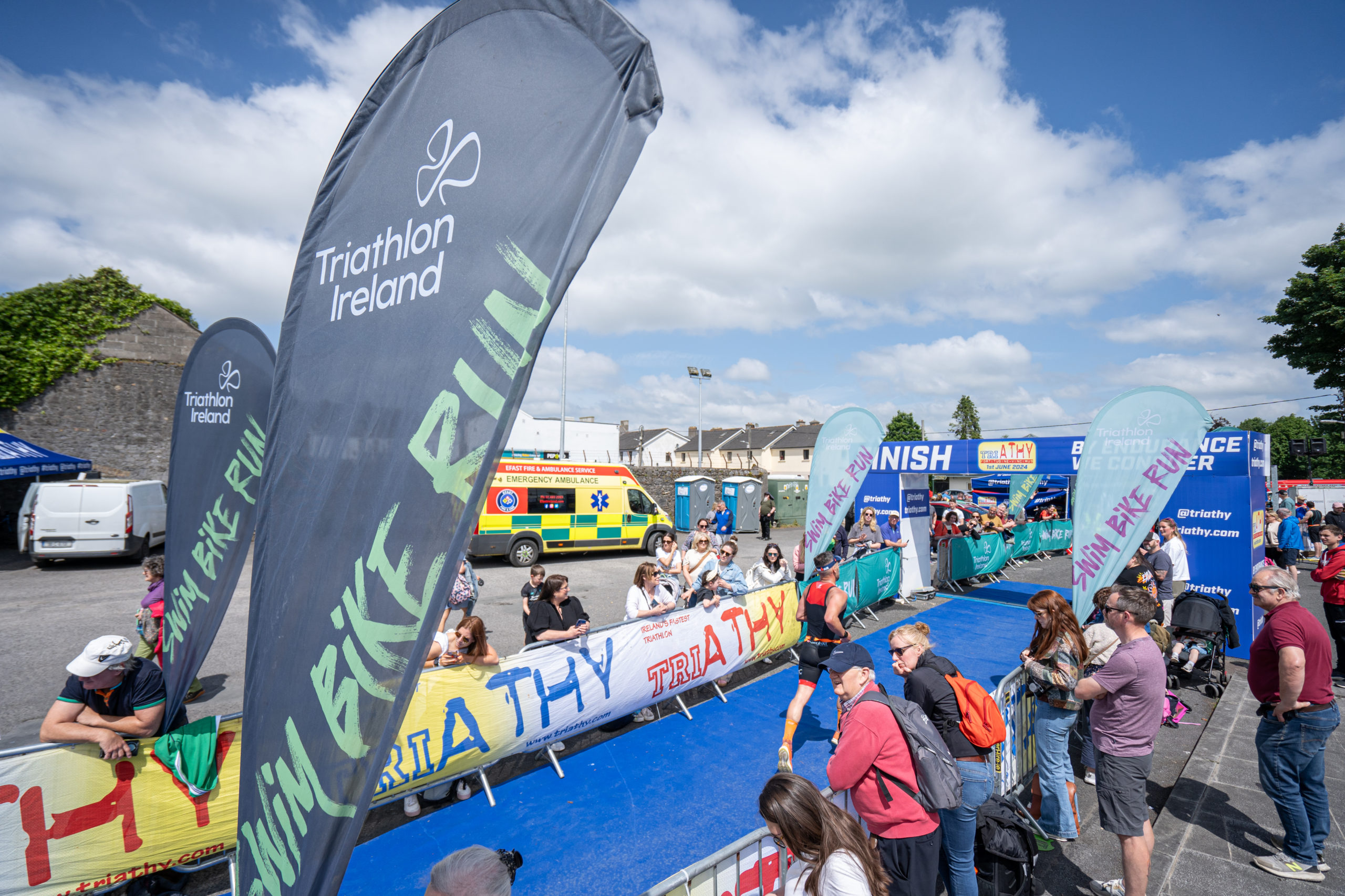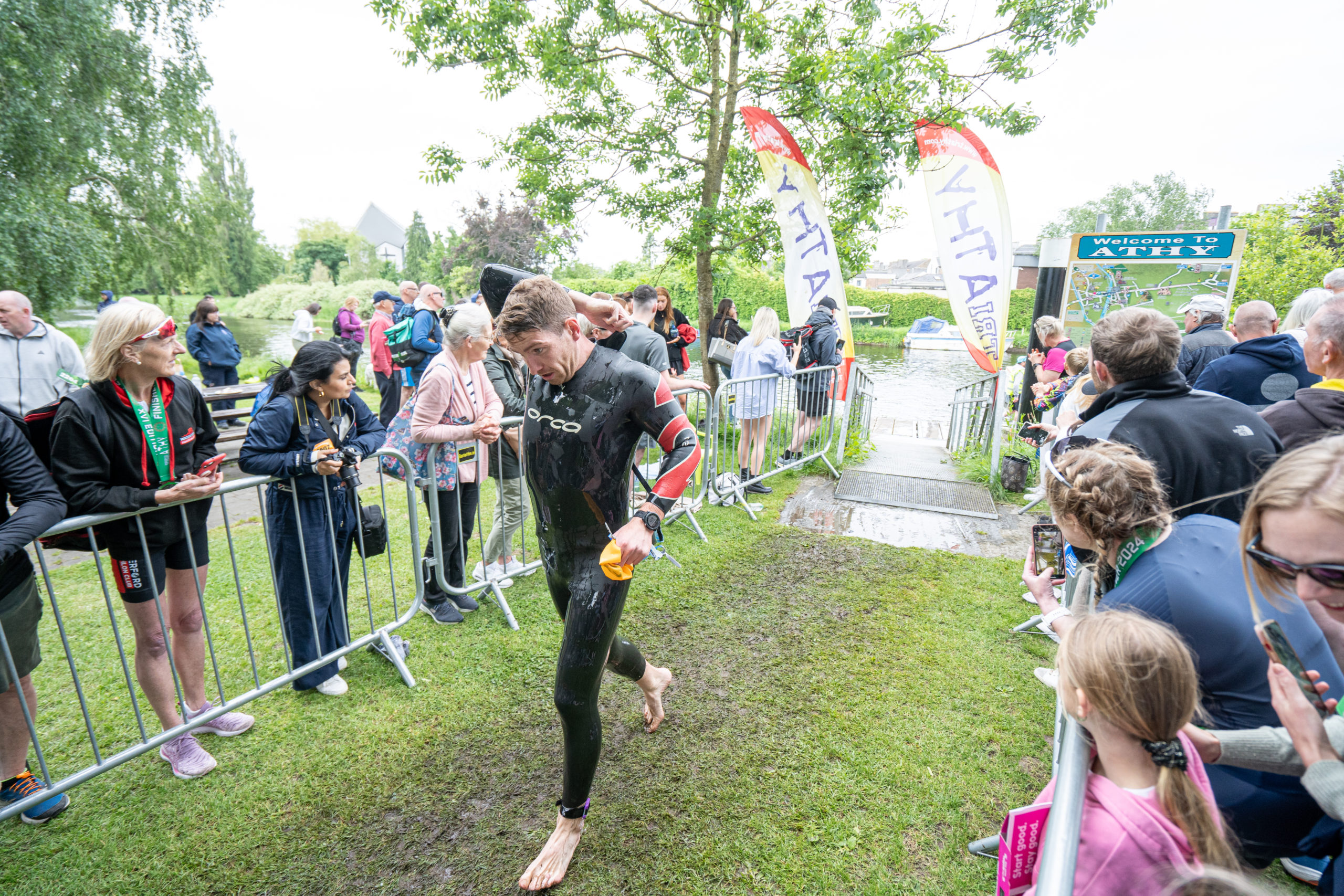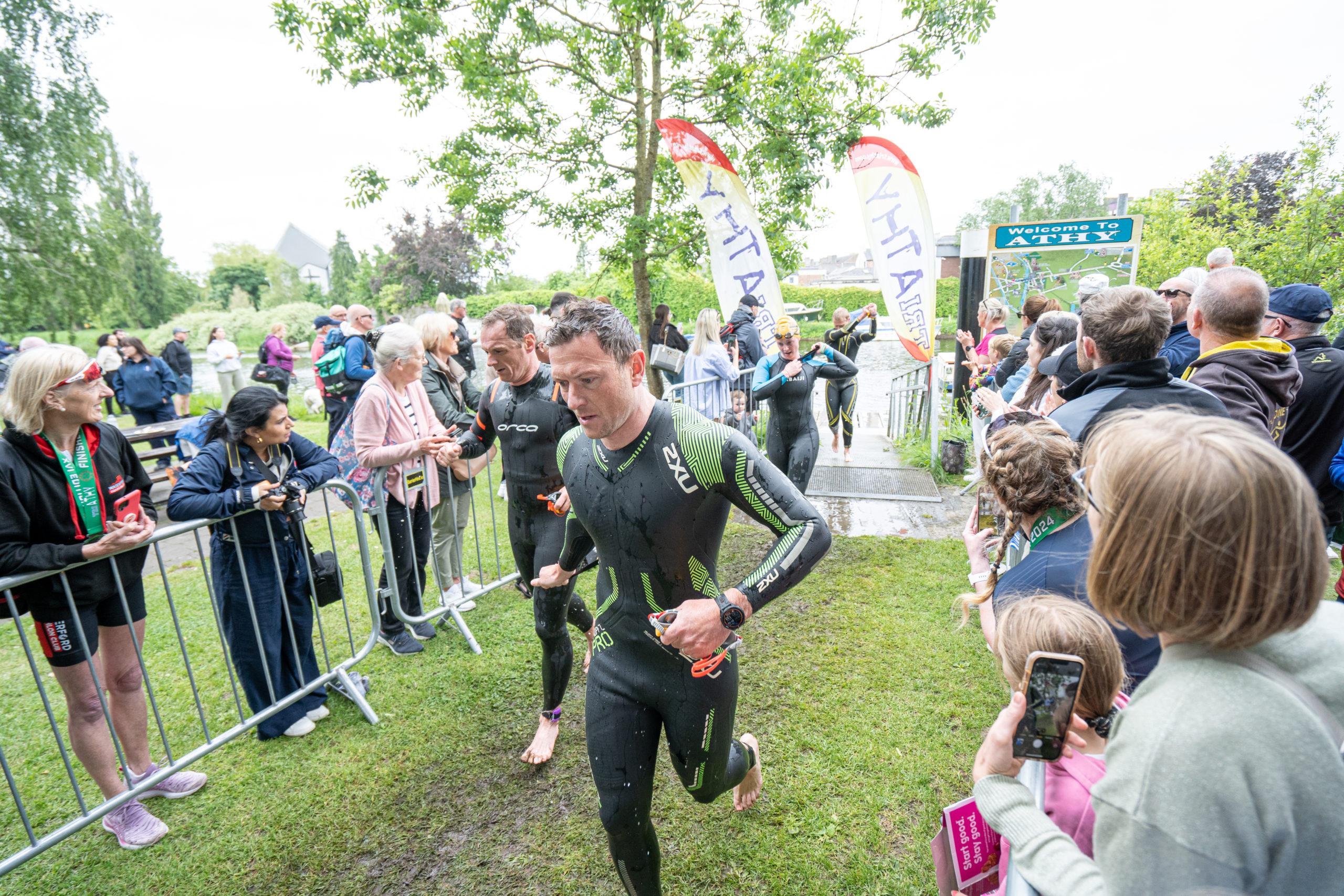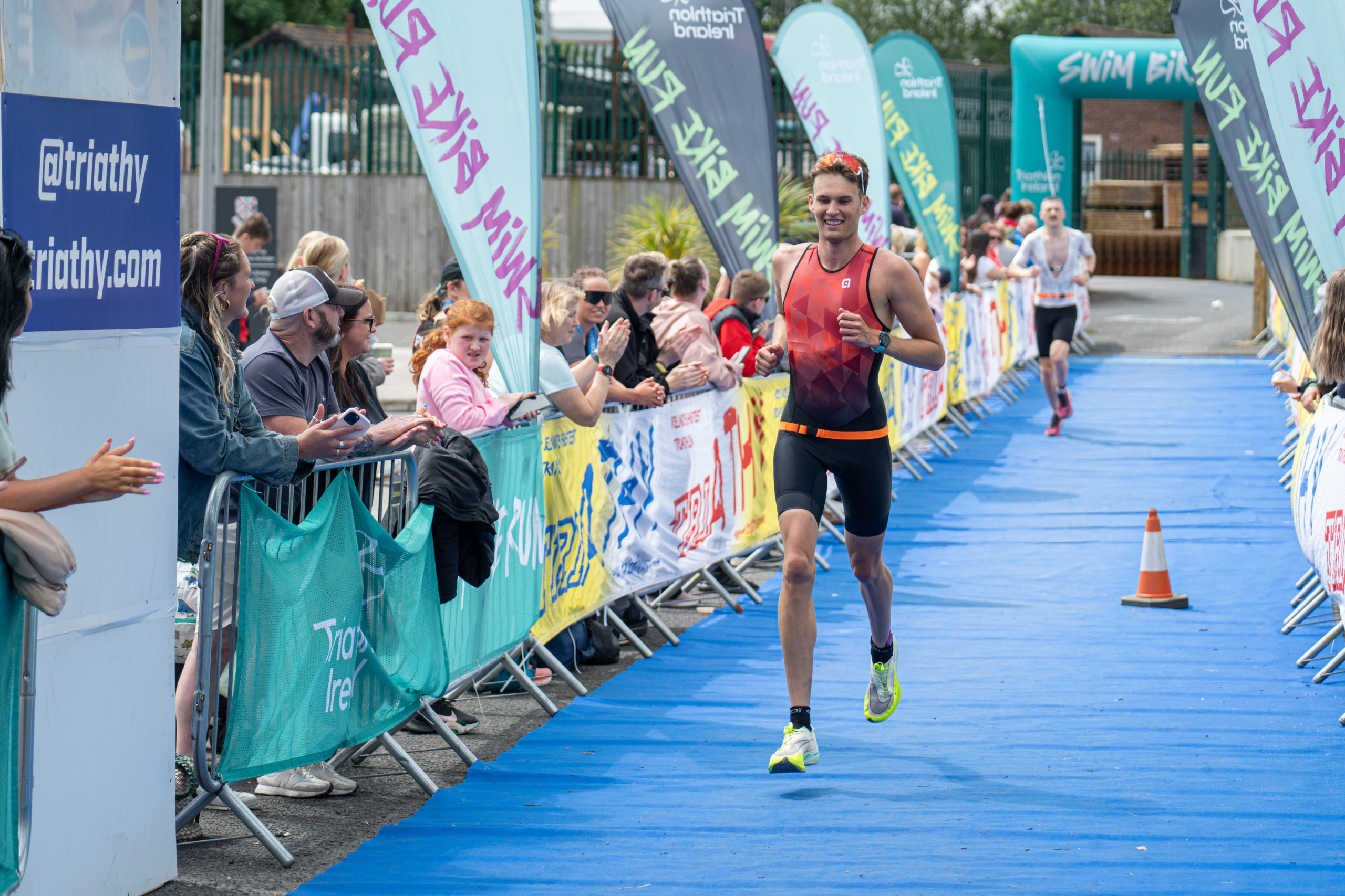 The run followed a new course for the 2024 race. The course now consisted of 2 laps of a circuit to the south of Athy town. On the 2nd lap, athletes crossed the River Barrow over the “Horse Bridge” to finish by Athy Community Library. In the Men’s race, Conal Cremen of Belpark Triathlon Club completed the fastest run, in a time of 00:34:22. However, Carroll maintained his lead and was the first man over the line, with an overall time of 02:01:06. In the Women’s race, Woods maintained her lead and completed the run in 00:37:37, with an overall race time of 02:08:35.