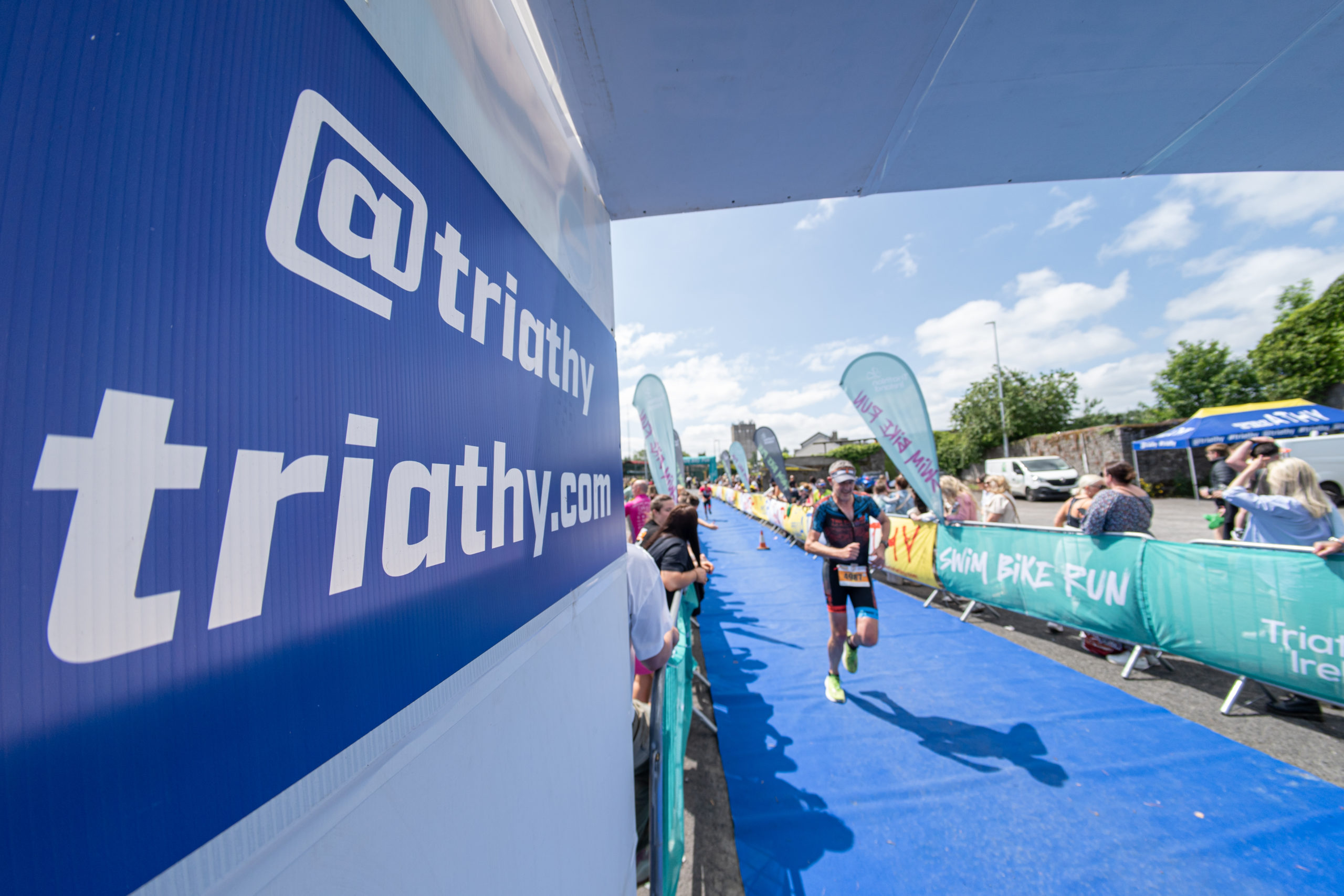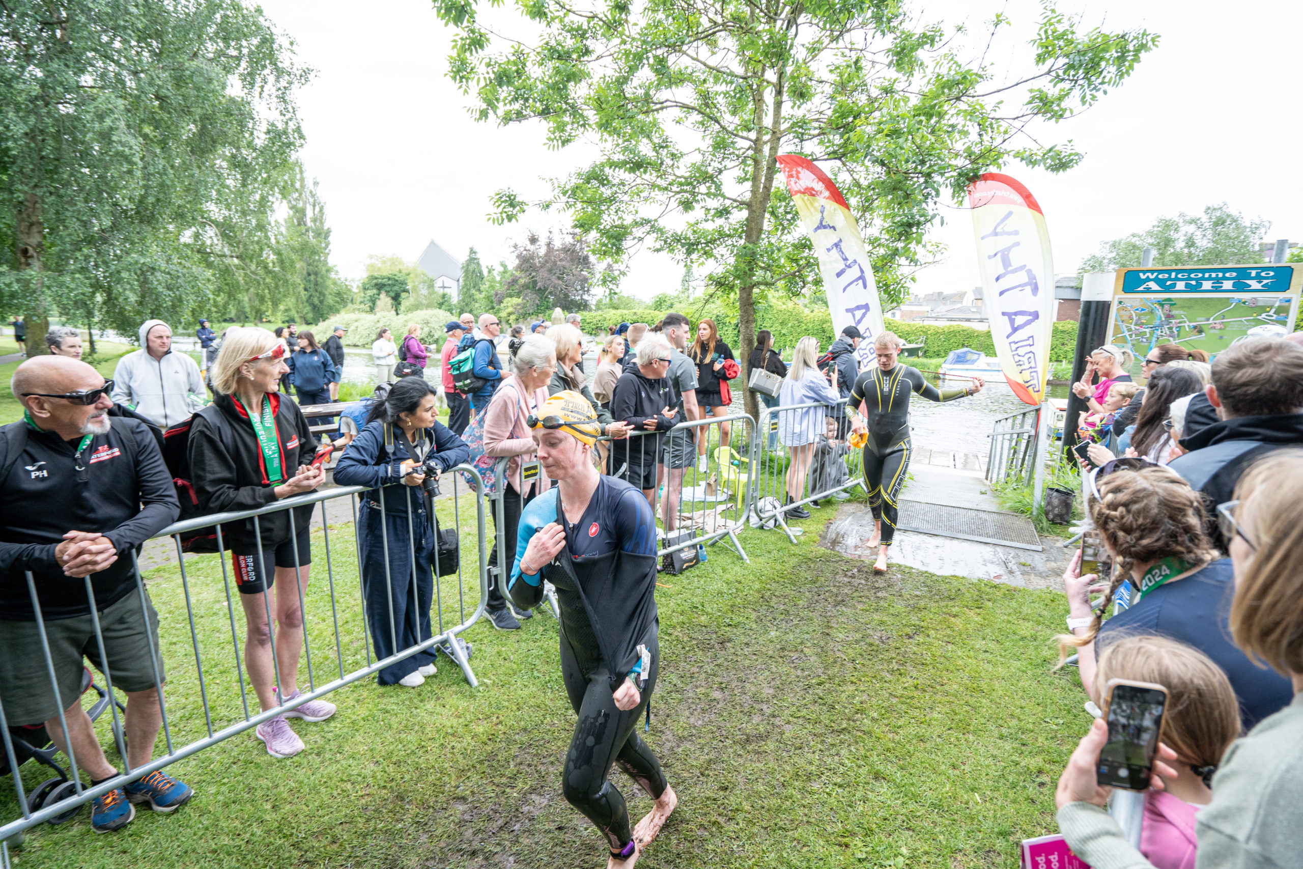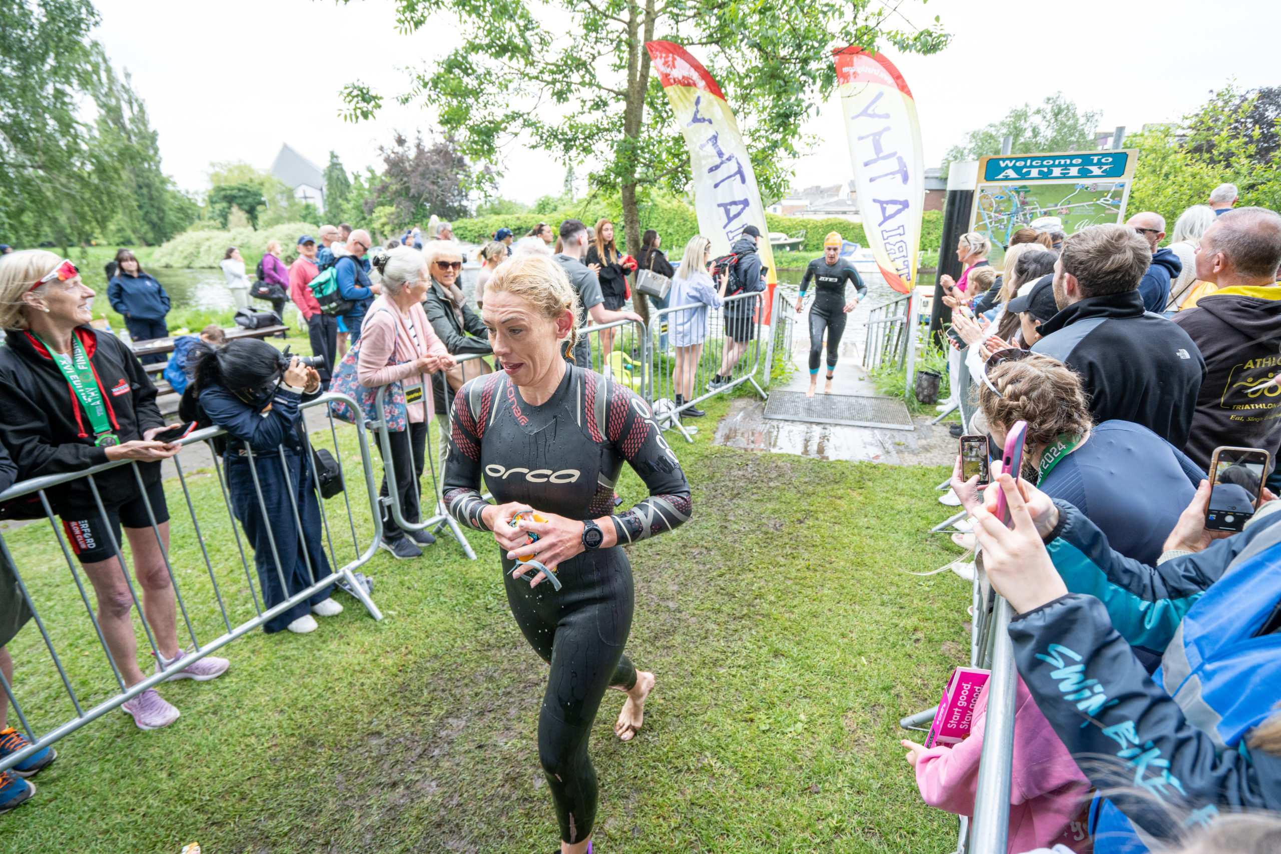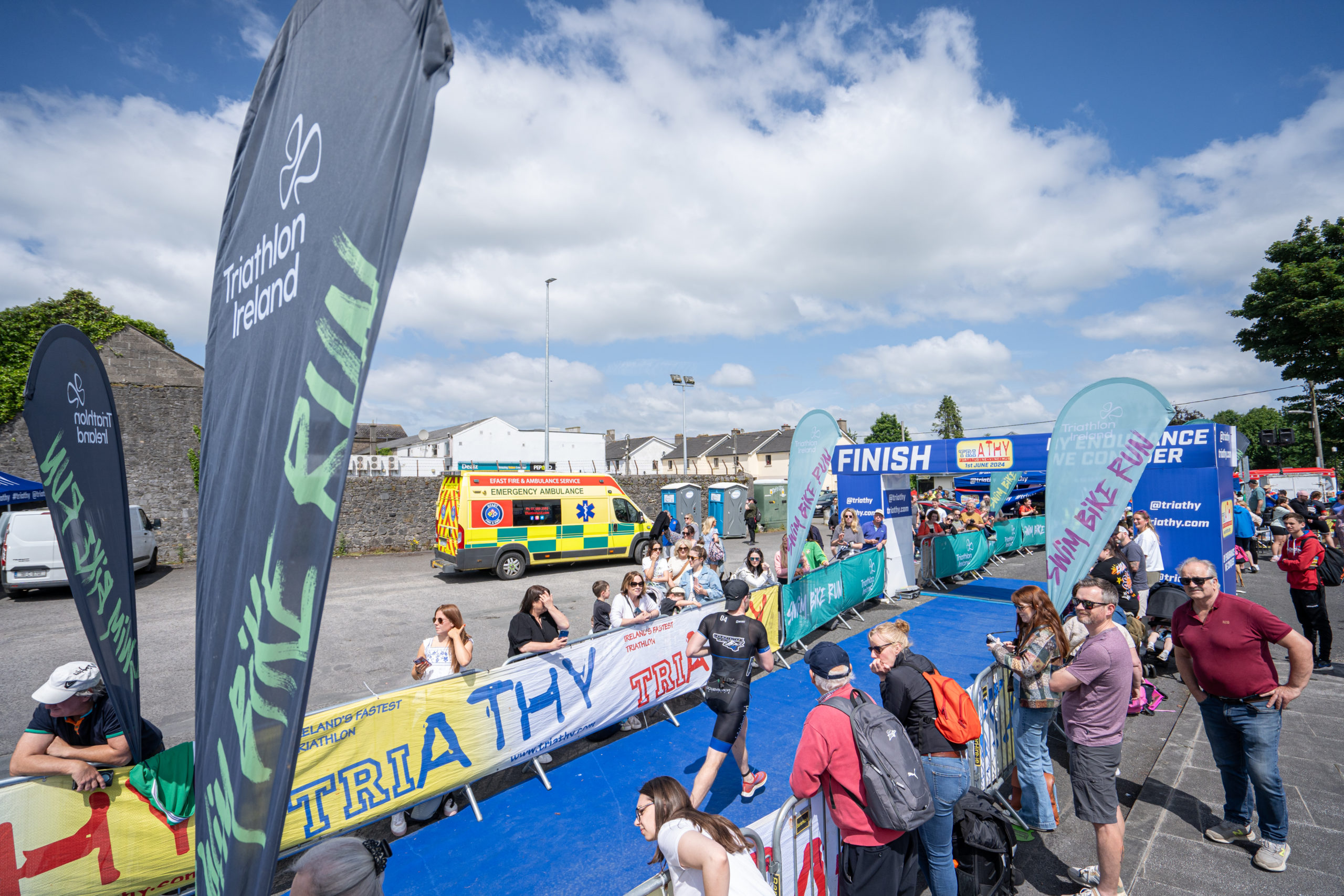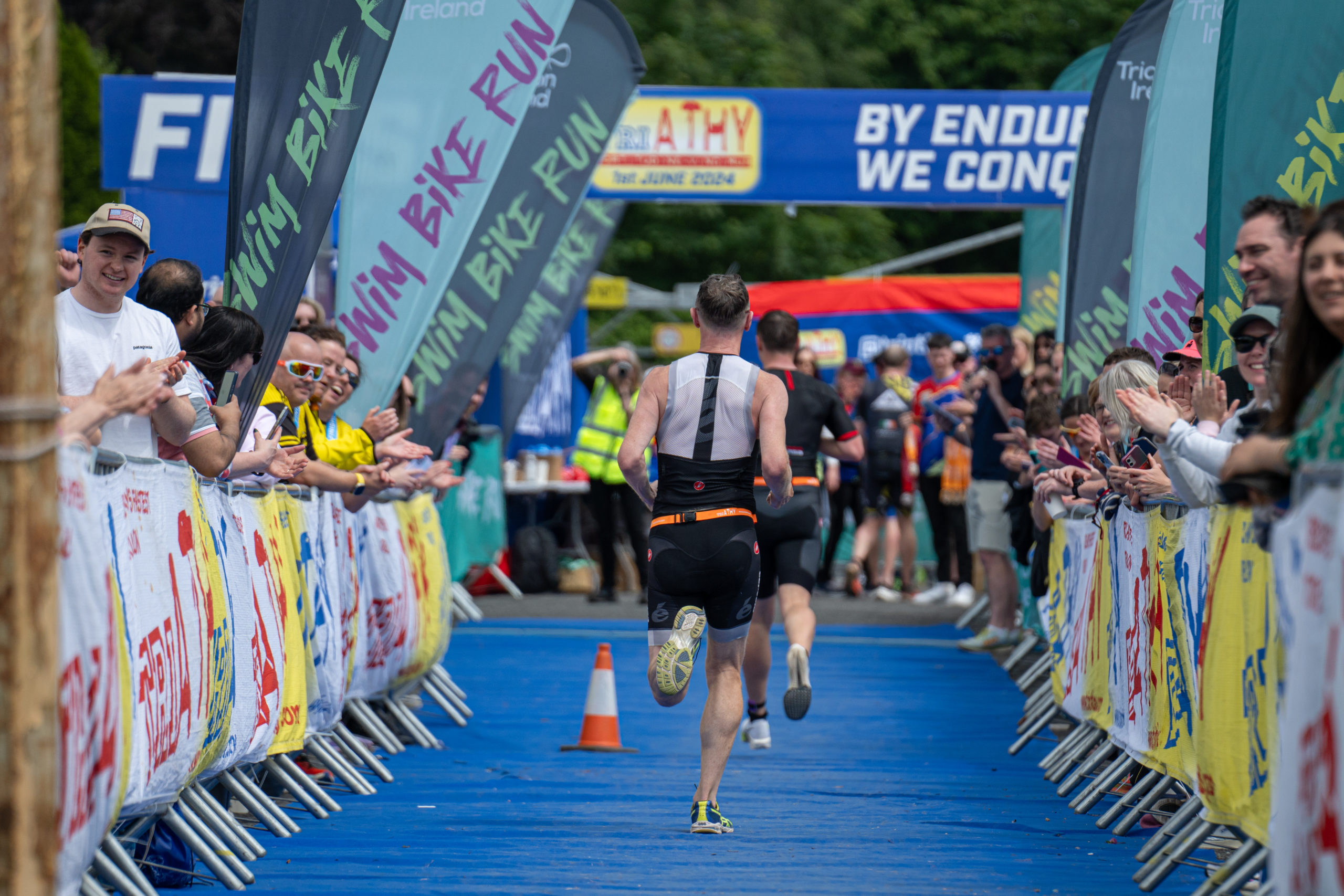 The run followed a new course for the 2024 race. The course now consisted of 2 laps of a circuit to the south of Athy town. On the 2nd lap, athletes crossed the River Barrow over the “Horse Bridge” to finish by Athy Community Library. In the Men’s race, Conal Cremen of Belpark Triathlon Club completed the fastest run, in a time of 00:34:22. However, Carroll maintained his lead and was the first man over the line, with an overall time of 02:01:06. In the Women’s race, Woods maintained her lead and completed the run in 00:37:37, with an overall race time of 02:08:35.