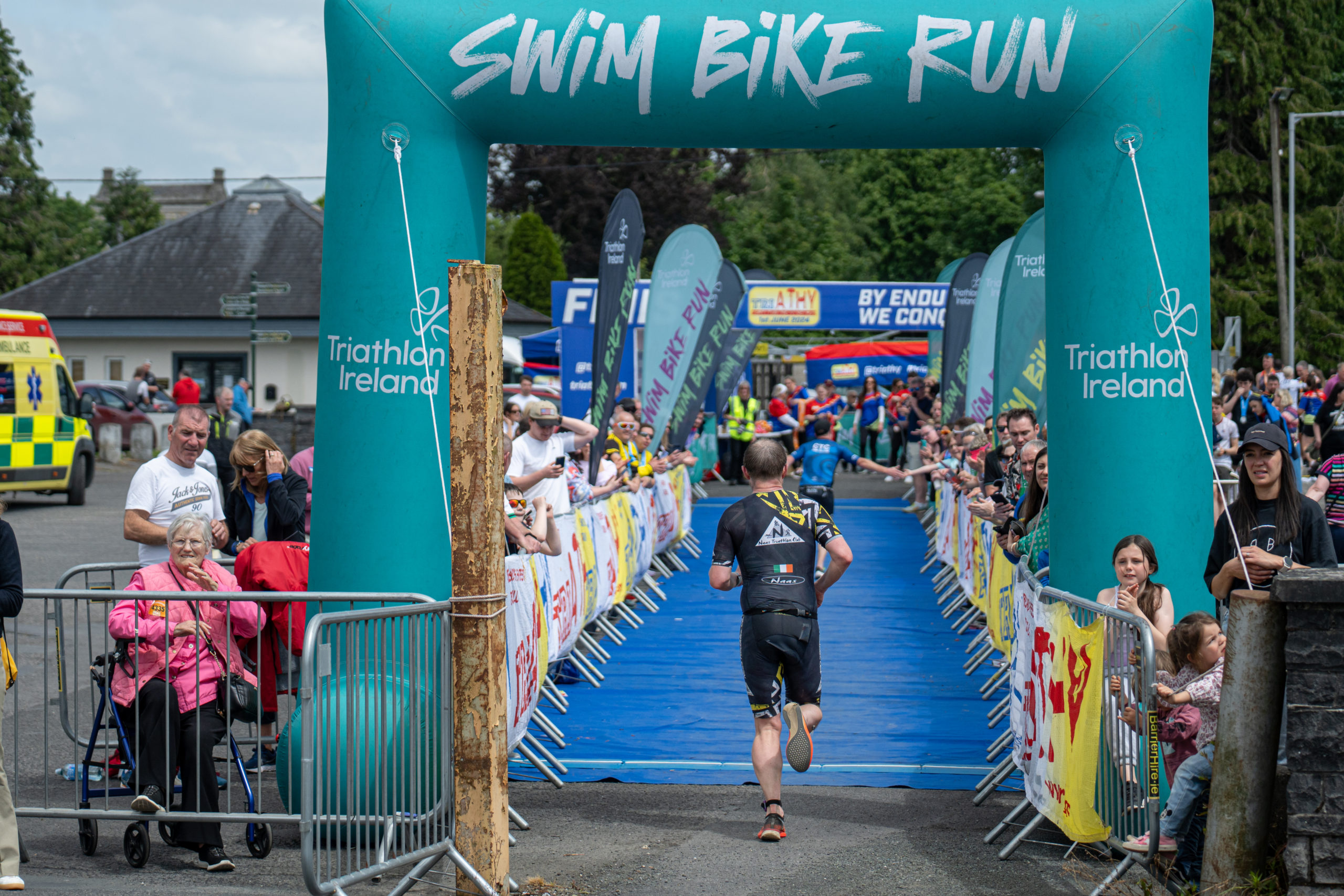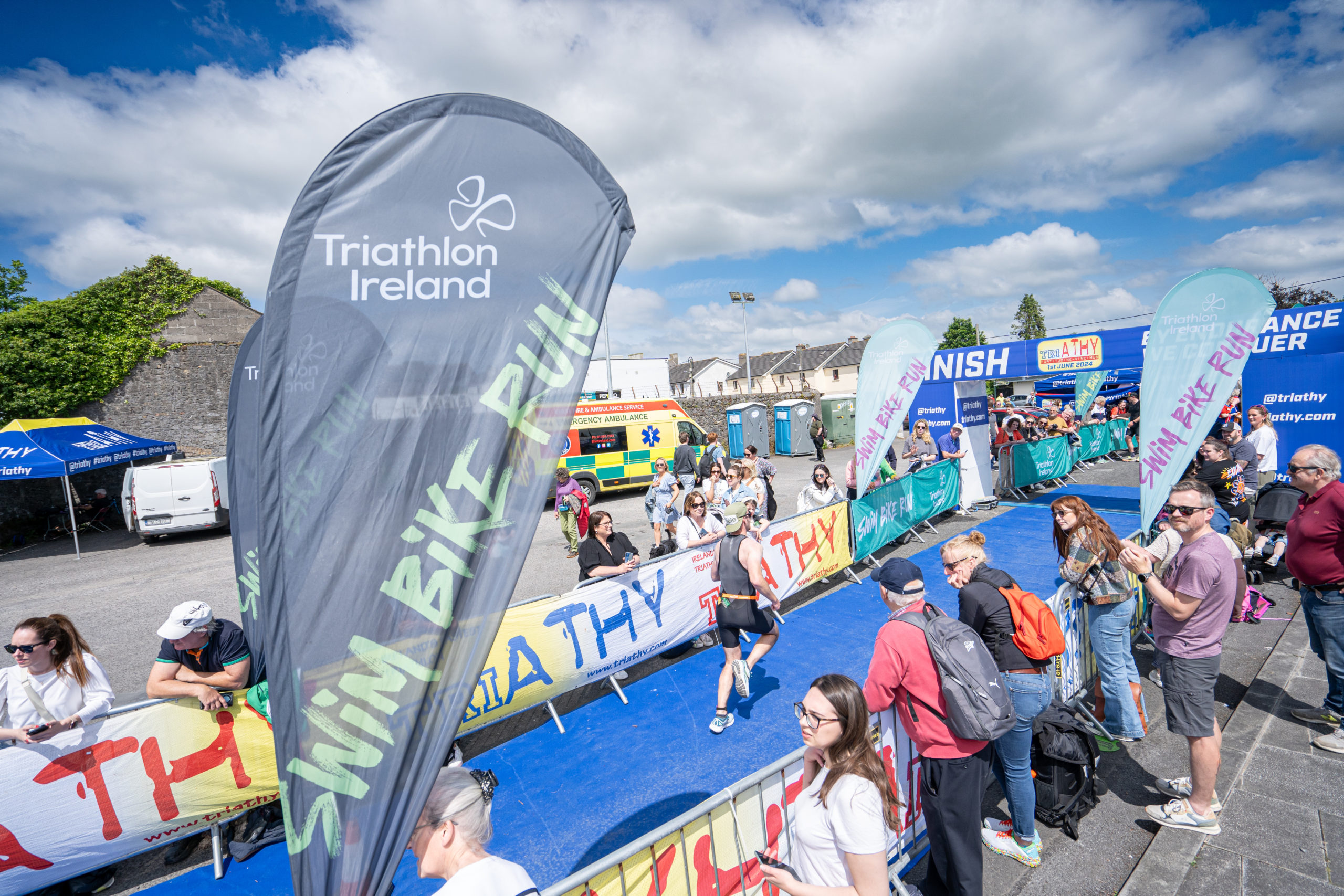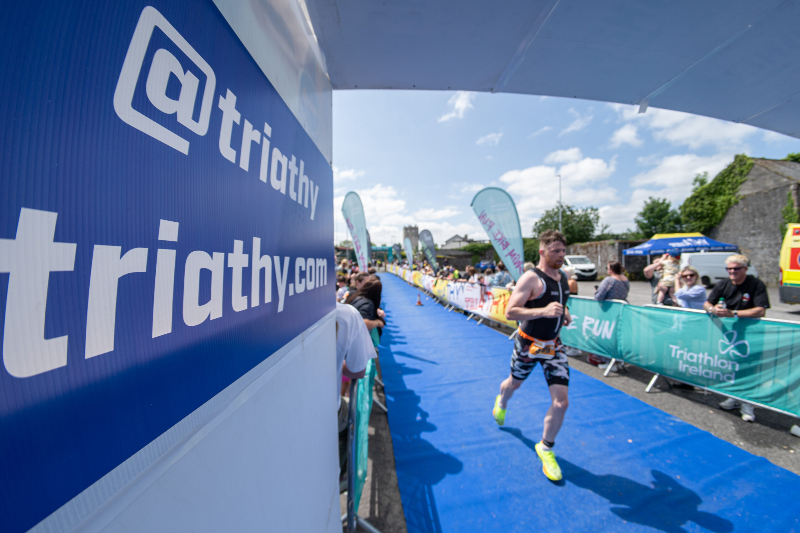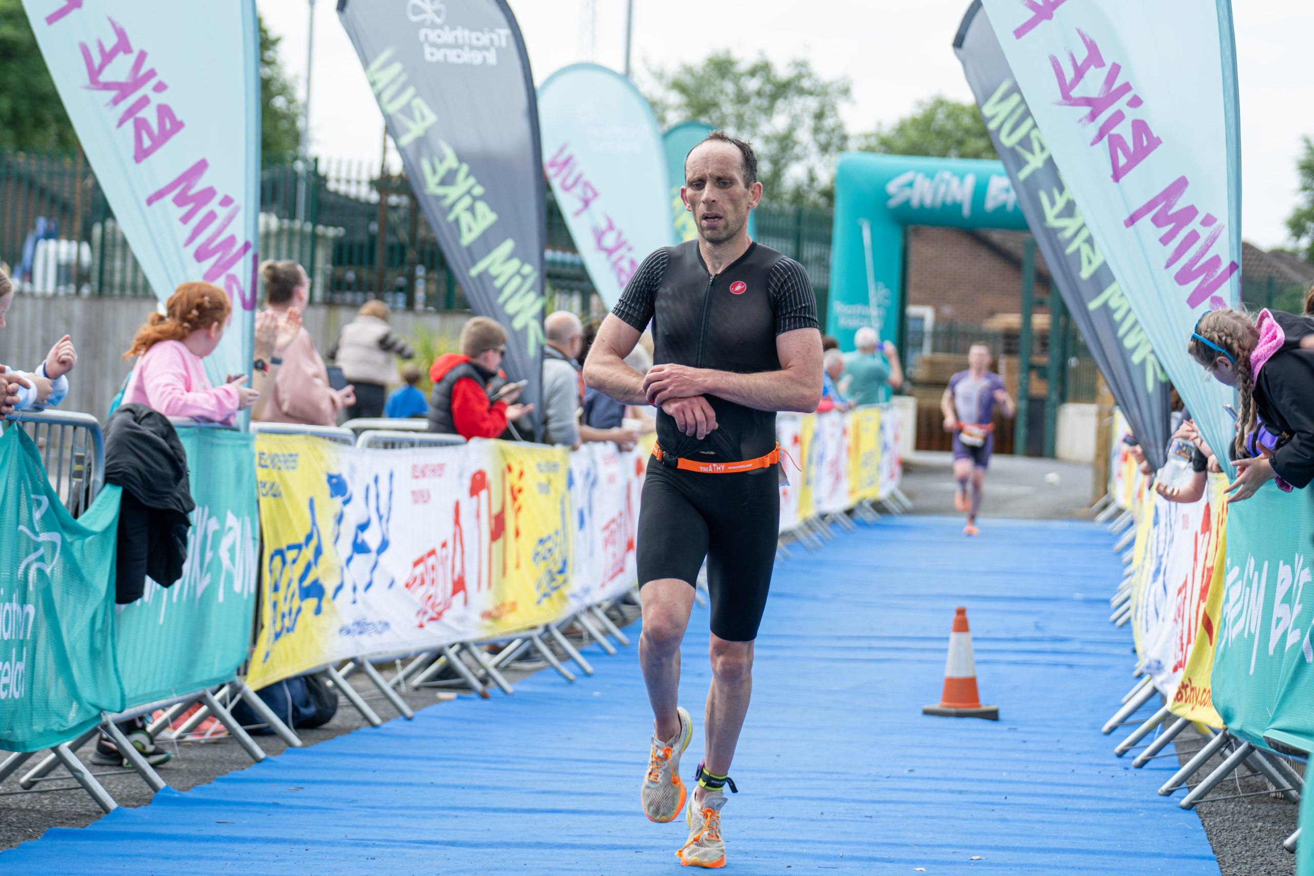 The run followed a new course for the 2024 race. The course now consisted of 2 laps of a circuit to the south of Athy town. On the 2nd lap, athletes crossed the River Barrow over the “Horse Bridge” to finish by Athy Community Library. In the Men’s race, Conal Cremen of Belpark Triathlon Club completed the fastest run, in a time of 00:34:22. However, Carroll maintained his lead and was the first man over the line, with an overall time of 02:01:06. In the Women’s race, Woods maintained her lead and completed the run in 00:37:37, with an overall race time of 02:08:35.