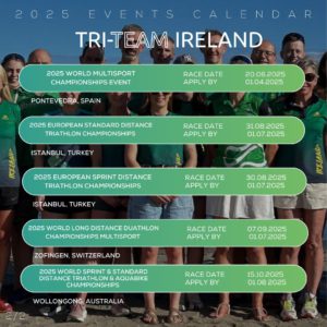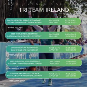 If you would like to qualify to race for Tri-Team Ireland in World Triathlon and Europe Triathlon events, you can find the criteria and selection routes below. You can enter and compete in more than one qualification event but you only need to register once for each Championship. You can qualify for multiple Championships, however, current World Triathlon Competition Rules do not allow an athlete to take part in two events within a 24 hour period at the same or separate Championships where one event is Standard Distance or longer.