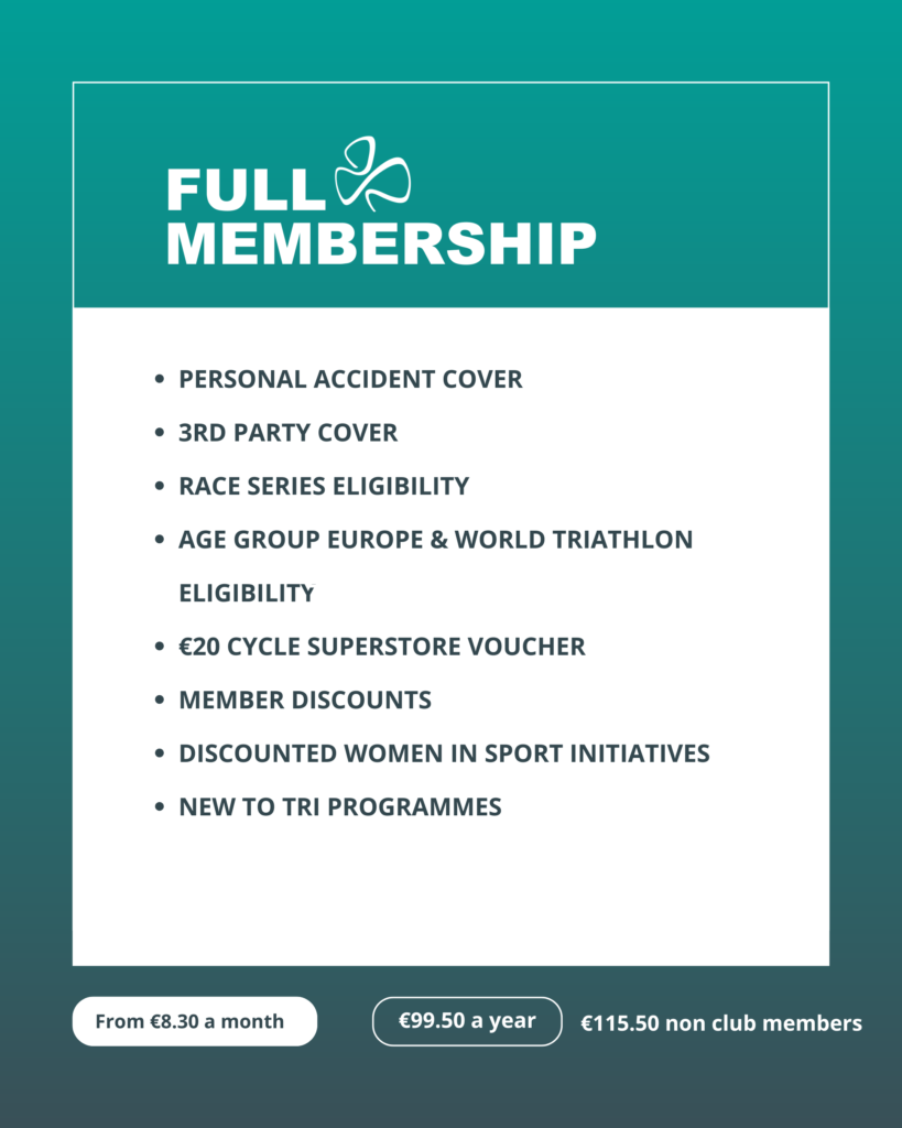 Full / U23 / Swim+  and U23 Swim+ membership includes an exclusive €20 voucher for Cycle Superstore and access to their VIP Club. Triathlon Ireland offers members access to the growing list of discounts available.