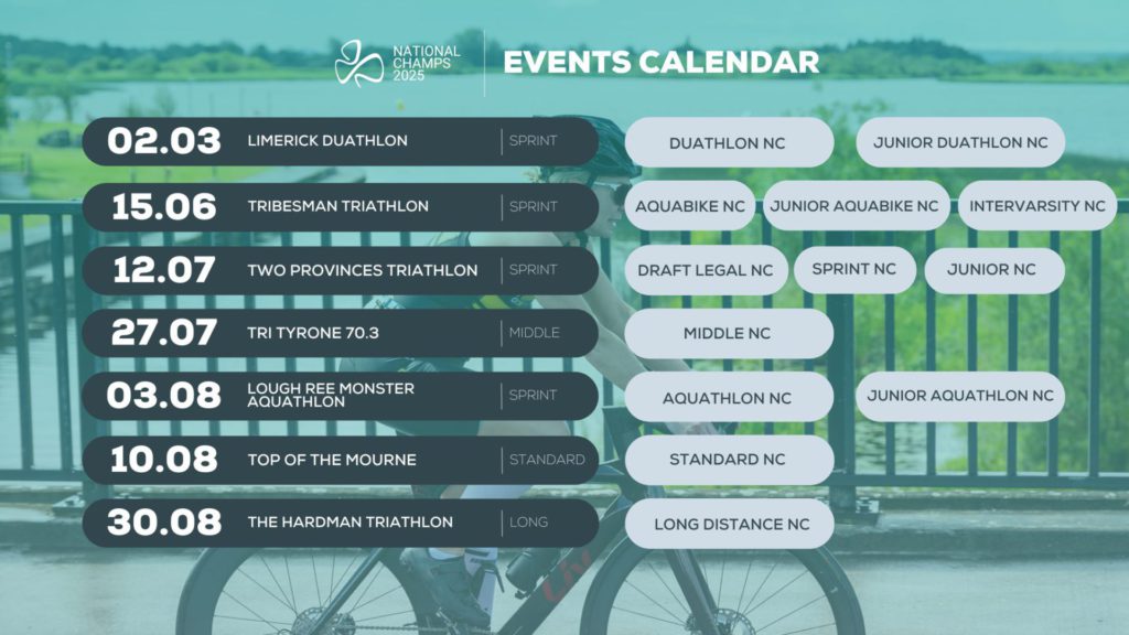 Mark your calendars! Triathlon Ireland’s National Championship events for the 2025 season are now live. National Champion titles are up for grabs across various distance triathlons as well as aquabike, aquathlon, and duathlon events. 4 Junior National Championships will be hosted between March & July to bring together Ireland’s youth triathletes. This year’s Draft Legal Sprint National Champs will take place in July, hosted by Two Provinces Triathlon.