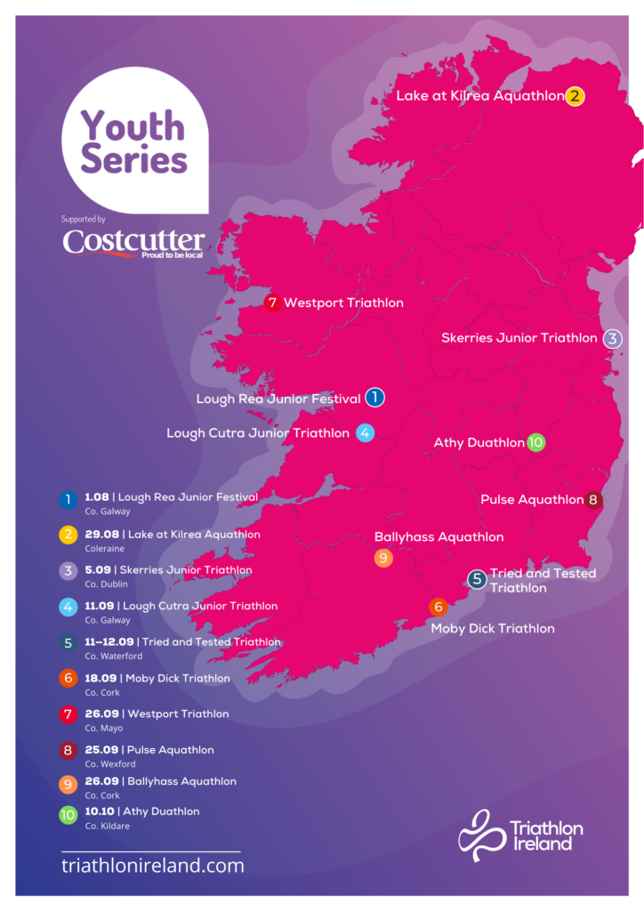 This year Mallow Tri Club is proud to host the Youth Series, supported by Costcutter Aquathlon race for the 12-13yr and 14-15yr old junior athletes. Alongside the aquathlon, the 16-17yr sprint distance race will be combined with the adult BMW Triathlon National Series race.