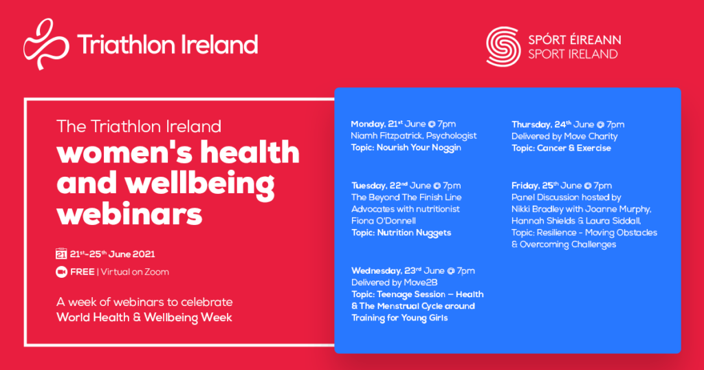 To celebrate World Health & Wellbeing Week from the 21st – 25th June, Triathlon Ireland are pleased to launch a series of Women in Sport Health & Wellbeing Webinars. Taking place each evening at 7pm, the webinars will cover a variety of interesting and educational topics with expert speakers.
