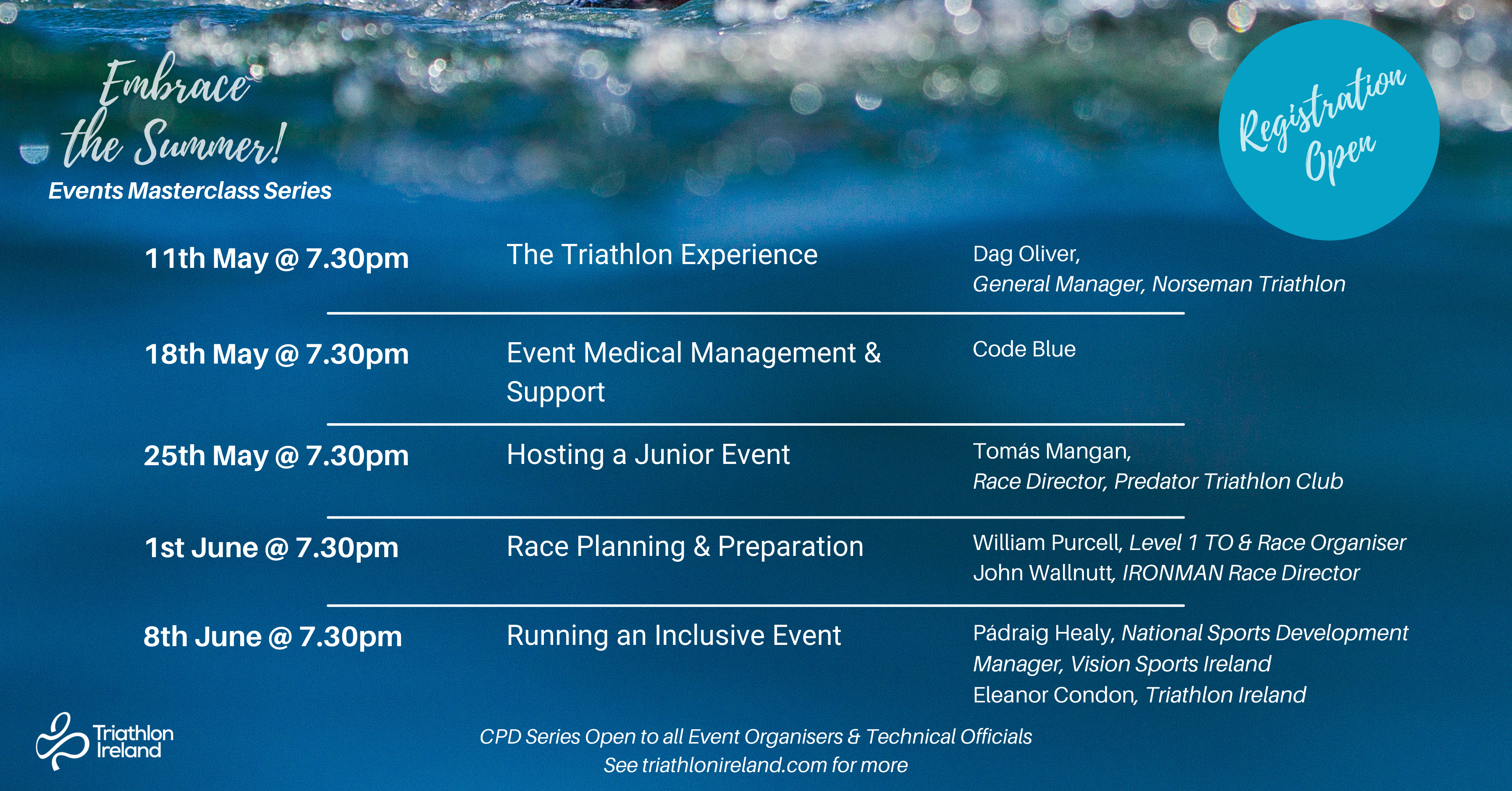Triathlon Ireland will host the ‘Embrace the Summer’ Events Masterclass over the next five weeks. Starting on Tuesday, 11th May – the series of webinars will replace the annually held National Events Conference for 2021. New this year is the introduction of a Continual Professional Development (CPD) element to the series.
