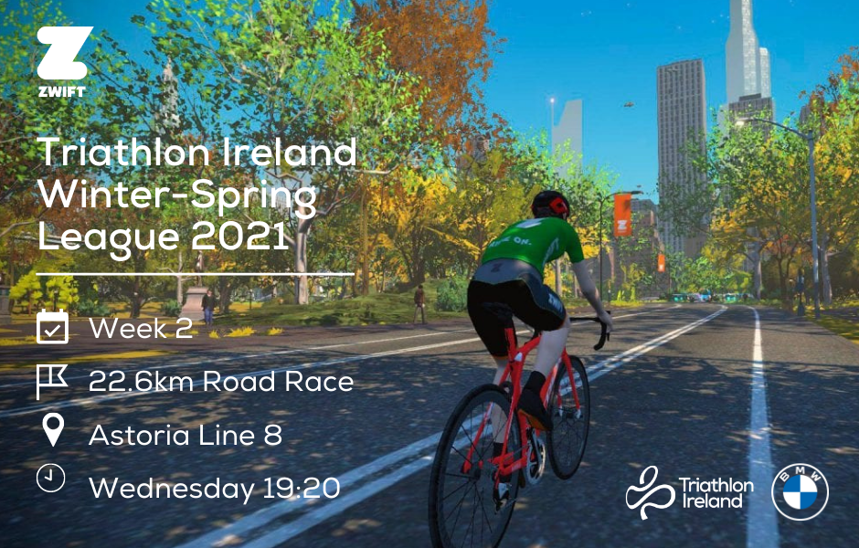 After the opening time trial on the Bologna course, the draft-legal element of the Triathlon Ireland Zwift Winter-Spring League begins in earnest this Wednesday on two undulating laps of Astoria Line 8.