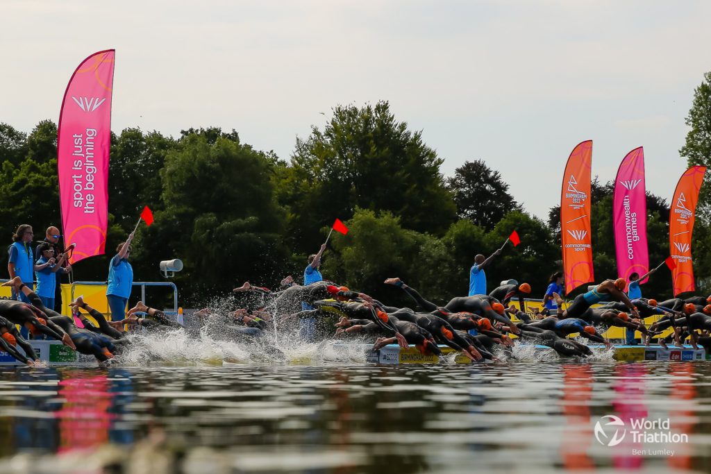 Some of top triathletes in the world were among the large 48 athlete field. A quick start for the 750m swim at Powell’s Pool in Sutton Park got the action underway. With the water temperature a balmy 19.1 degrees celsius, wetsuits were optional.