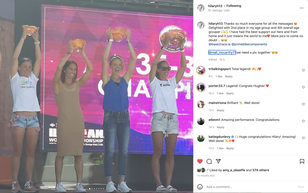 Hilary Hughes was the stand out Irish result from the IRONMAN World Championships in St George, USA over the weekend, as she finished a very impressive 2nd in her AG with a time of 10:13:57. As well as being a silver medalist, Hilary was the 4th female AGer across the finish line – strong stuff!