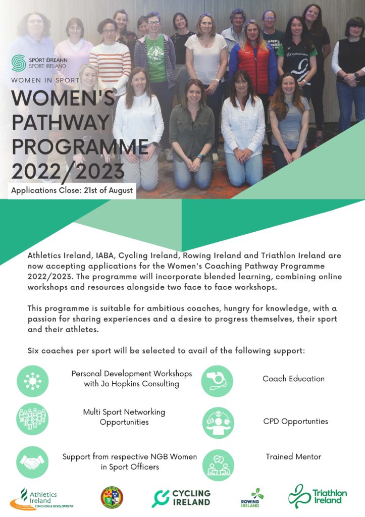 The Women’s Coaching Pathway is an exciting collaborative programme between Athletics Ireland, Cycling Ireland, Irish Athletic Boxing Association (IABA), Rowing Ireland and Triathlon Ireland. The programme gives females the opportunity to improve their knowledge, expand their network and develop leadership and coaching skills in a supported, collaborative environment.