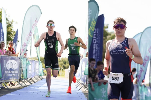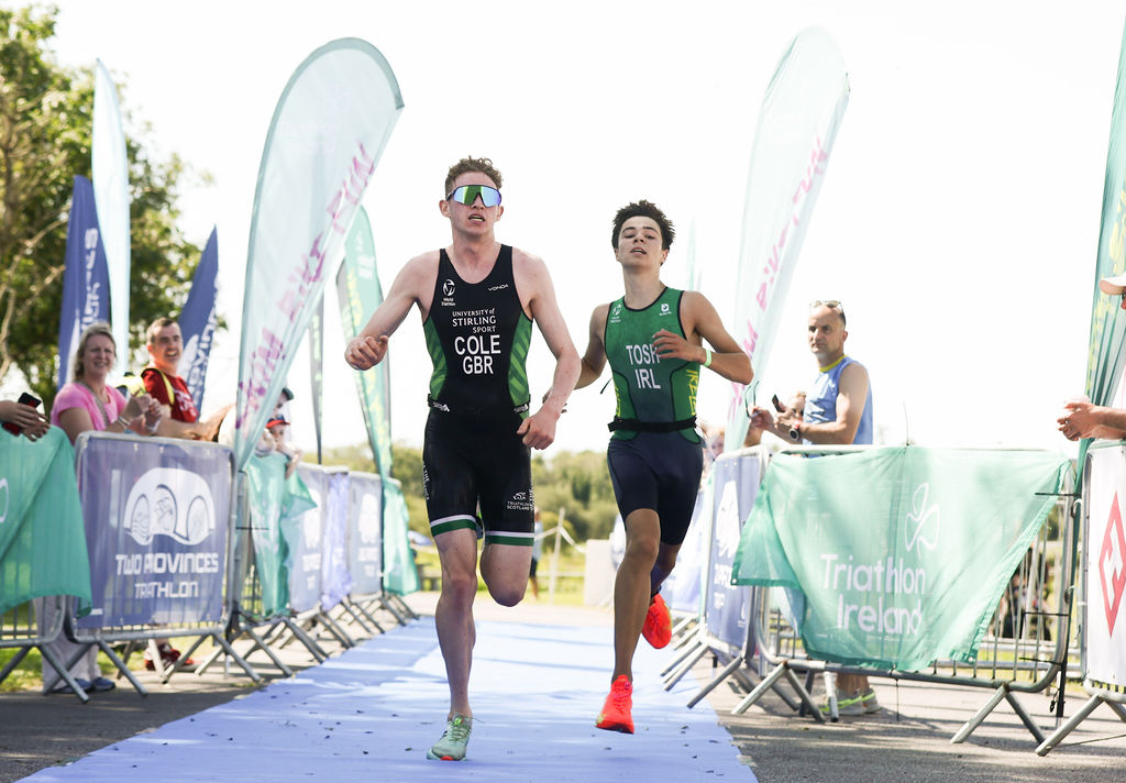 In the junior men’s, it was close fought throughout with both Sean McMahon and Evan Tosh working in the main bike pack coming into T2. Patrick Cole had been making up almost a minute’s swim deficit through the race. Putting in the quickest run (16:49) of the entire men’s draft legal field lined up a sprint finish with Evan Tosh to secure the win for Patrick Cole. An impressive breakthrough performance for fifteen year old Evan Tosh to take the silver junior medal, and fourth overall on the day. Sean McMahon, who trains at the National Triathlon Centre UL, finished third in 59:34.