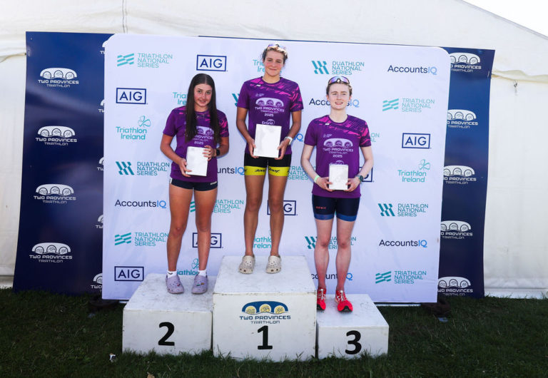 In the junior women’s race, Chloe Young was out of the water just 10 seconds off the lead pack and put in a solid bike and run effort for 1:09:00 and the championship medal. Aoibheann Ryan has had some solid results in the Triathlon National Series, finishing third in Schull last month. She picked up the silver medal in the Junior Championship at Two Provinces. Eve Burns was third, coming home in 1:12:59.