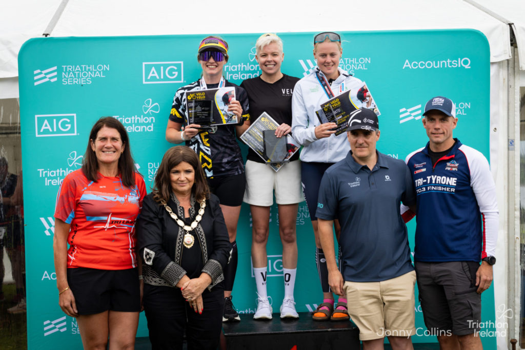David Higgins claimed the National Championship title and finished second overall with a time of 3:52:24, also under the previous course record, affirming the depth of this year’s field. Higgins produced the fastest bike of the race to secure his title. Adam Ward of Strabane Triathlon Club followed his top ten finish at the draft-legal sprint champs at Two Provinces, completing the podium in 3:57:12.