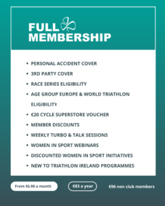 As a full member of Triathlon Ireland, you can avail of all of the below benefits, including third party and personal accident cover as well as a €20 Cycle Superstore voucher!